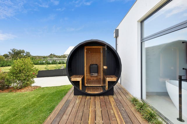 Outdoor appeal includes a sauna and 10m x 10m basketball court for relaxation and recreation, a huge 15m x 8m, three-bay shed plus ample space for a caravan, boat, or work vehicle. Enhancing the outdoor experience, the property also features a refreshing hot and cold-water outdoor shower, a dedicated fire pit zone for evening gatherings, a 9.6kw system with 8.2 Fronius inverter for energy efficiency, and a comprehensive security system for peace of mind.