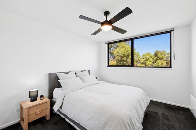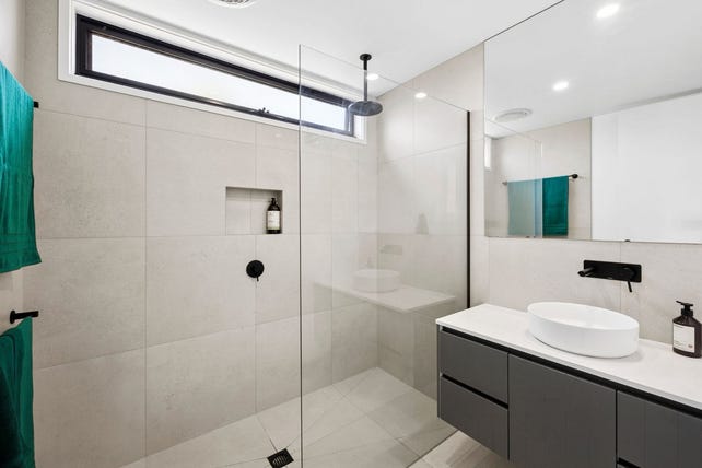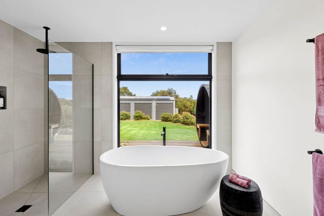 Designed for effortless family living, this light-filled sanctuary boasts four spacious bedrooms, each with built-in robes, ceiling fans, and panel heaters. The master suite, privately set in its own wing, is a true retreat—featuring a luxurious en-suite with a freestanding bath, a large picture window, a stone vanity, and sleek black tap ware.
