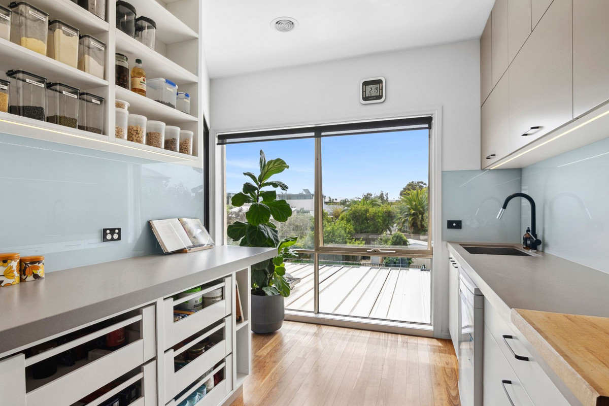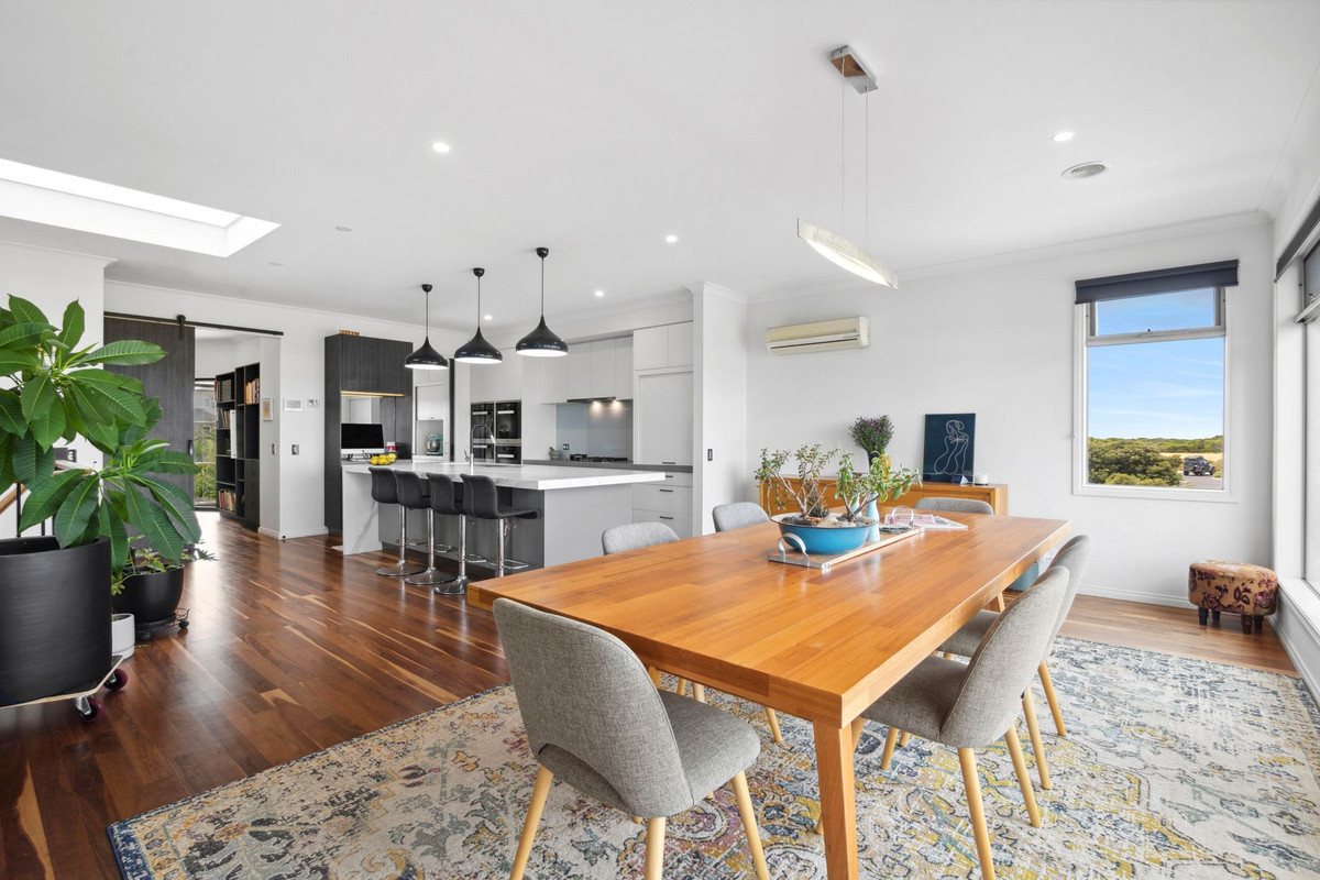 The highlight awaits on the first floor, where an expansive open-plan living, dining, and kitchen area unfolds, offering sweeping views stretching from Point Danger to Mount Martha, and the serene landscape of the nature reserve.
