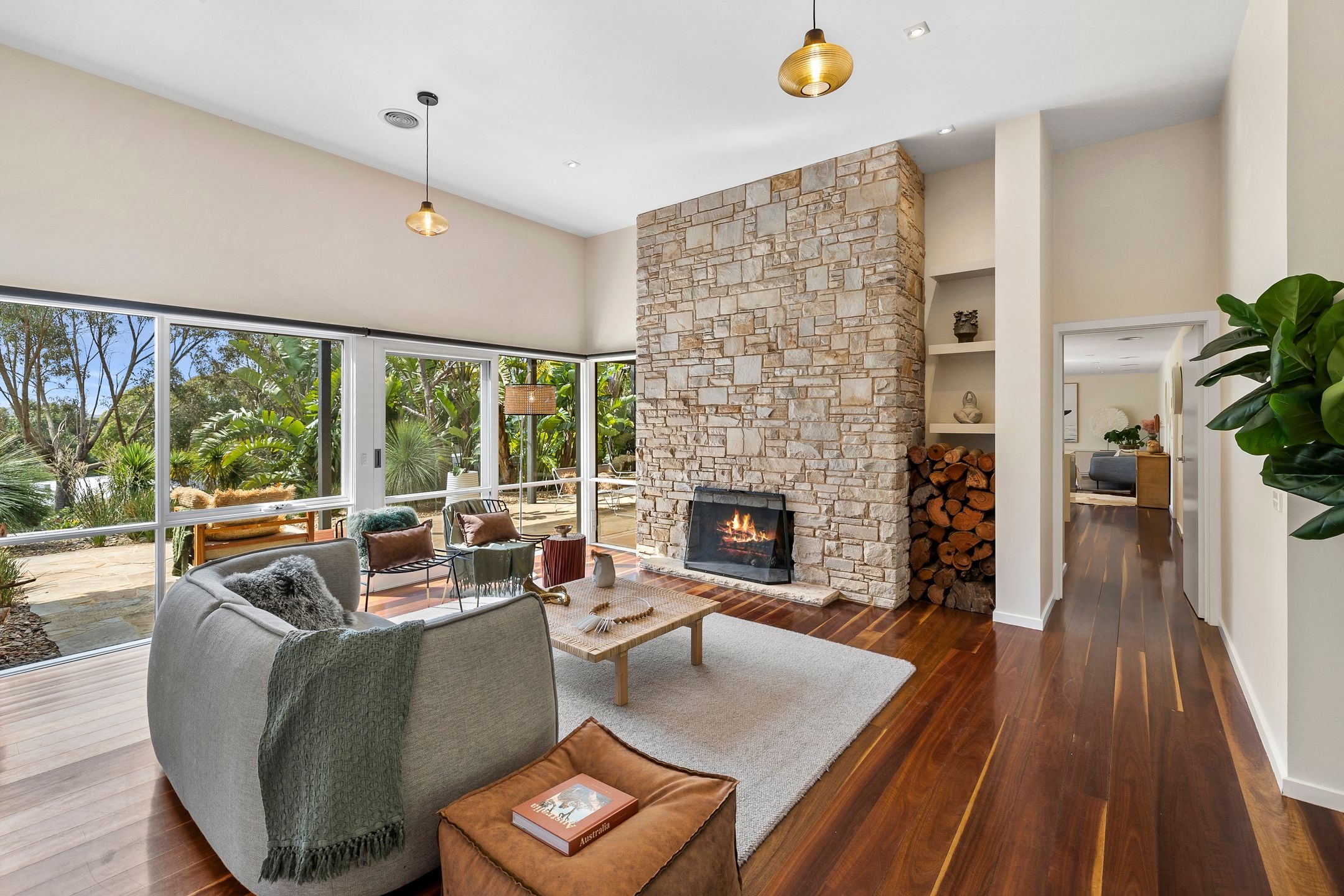 • The breathtaking living room delivering elevated ceilings, rich timber floors, expansive windows, chic Italian pendant lighting & an incredible stone feature fireplace!