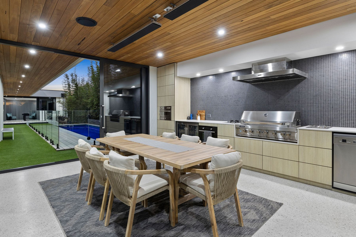 This home exemplifies perfection with its array of features, including a stunning stone bench with a feature timber top, a walk-in butler's pantry, integrated appliances, four Siemens ovens, an induction cooktop with a gas wok burner, and more in the kitchen. Enjoy year-round comfort with double-glazed windows, zoned ducted heating and refrigerated cooling, and a gas log fire in the main living area.