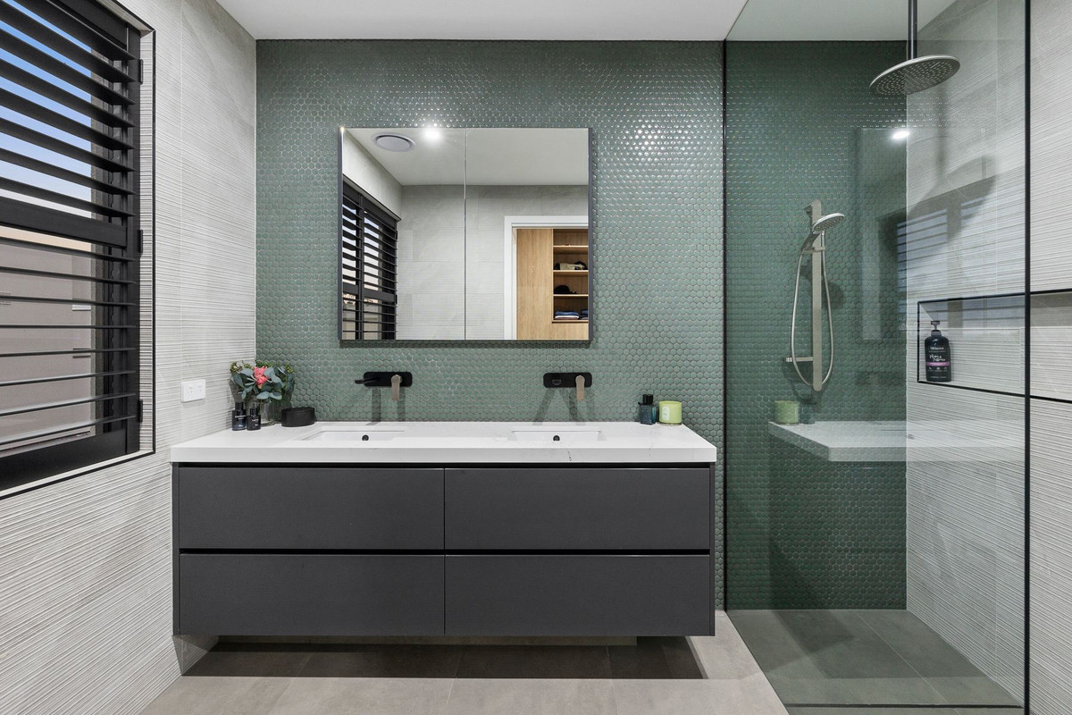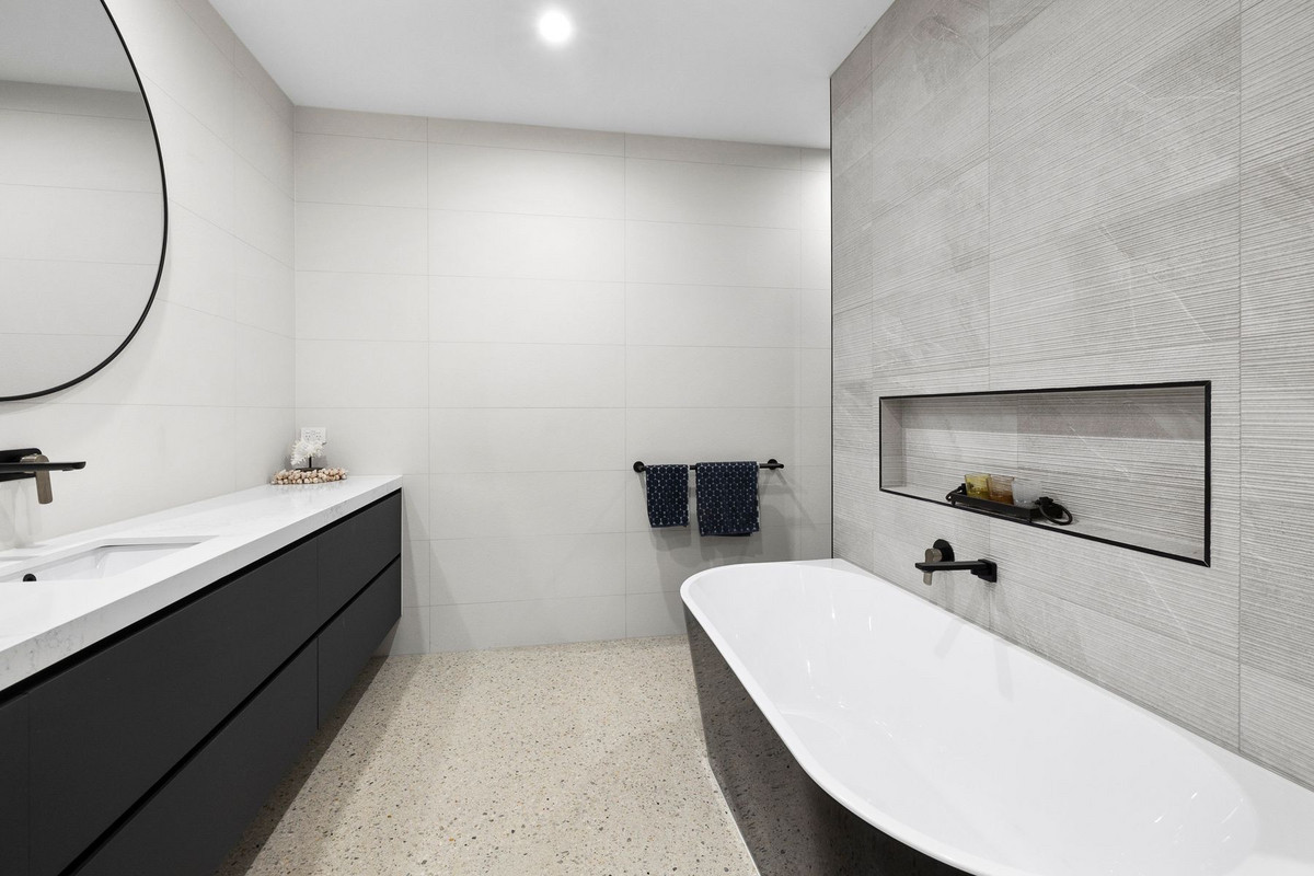 Polished concrete floors and engineered American oak flooring grace the living spaces, while plush carpeting adorns the bedrooms. The bathrooms and laundry feature stone benchtops and floor-to-ceiling tiles. Elevated ceilings, expansive windows, and glass bi-fold doors ensure ample natural light throughout the home.
