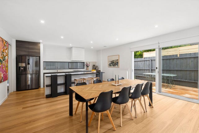 The heart of the home is the light-filled open-plan kitchen, dining, and living zone, seamlessly connecting to two outdoor entertaining areas, perfect for year-round gatherings. The chef's kitchen is a standout, featuring a large 900mm cook-top, Smeg appliances, a stylish stone and timber island bench, and a spacious walk-in pantry—ideal for any culinary enthusiast.