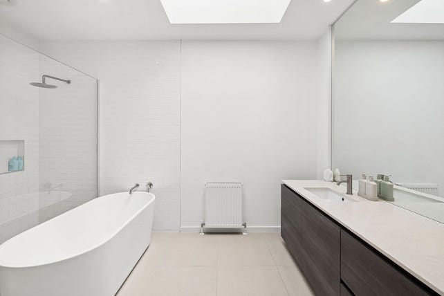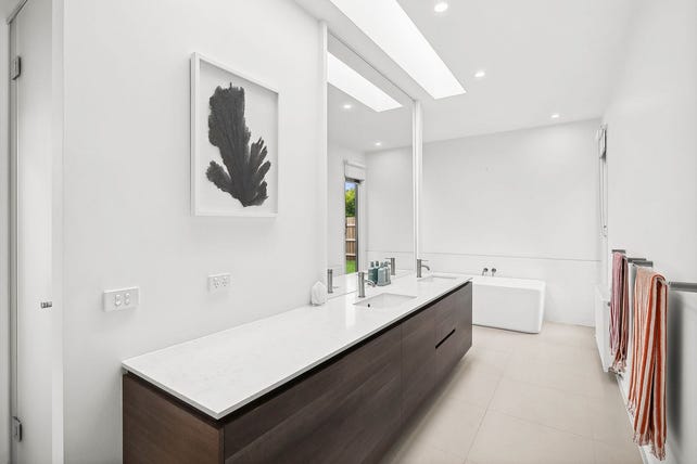 Upstairs, three generously sized bedrooms with built-in robes and ceiling fans provide ample accommodation, all serviced by a beautifully appointed central bathroom with a skylight, standalone bath, and large vanity.
