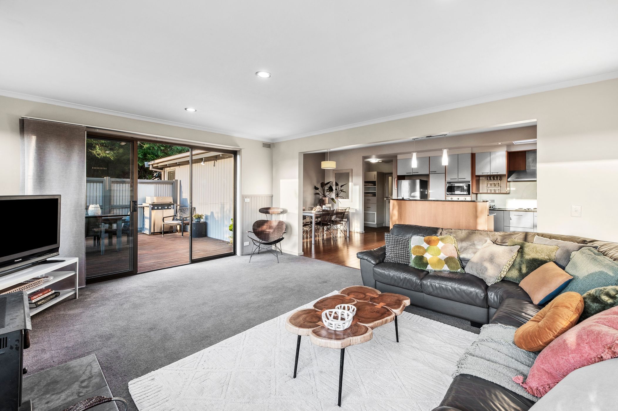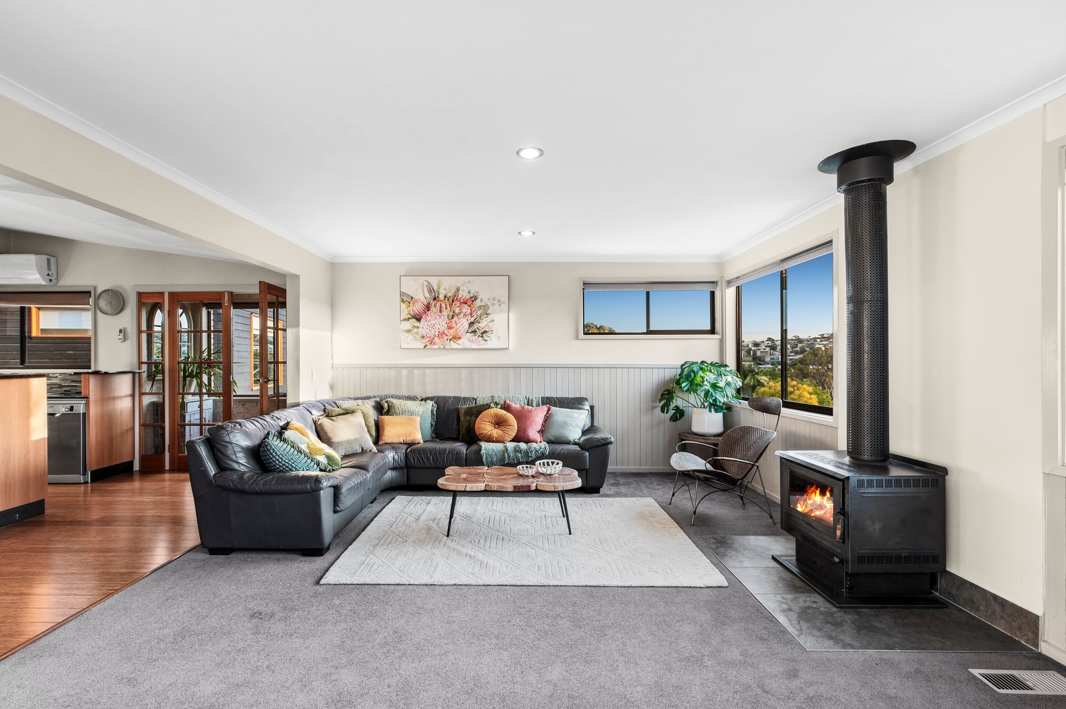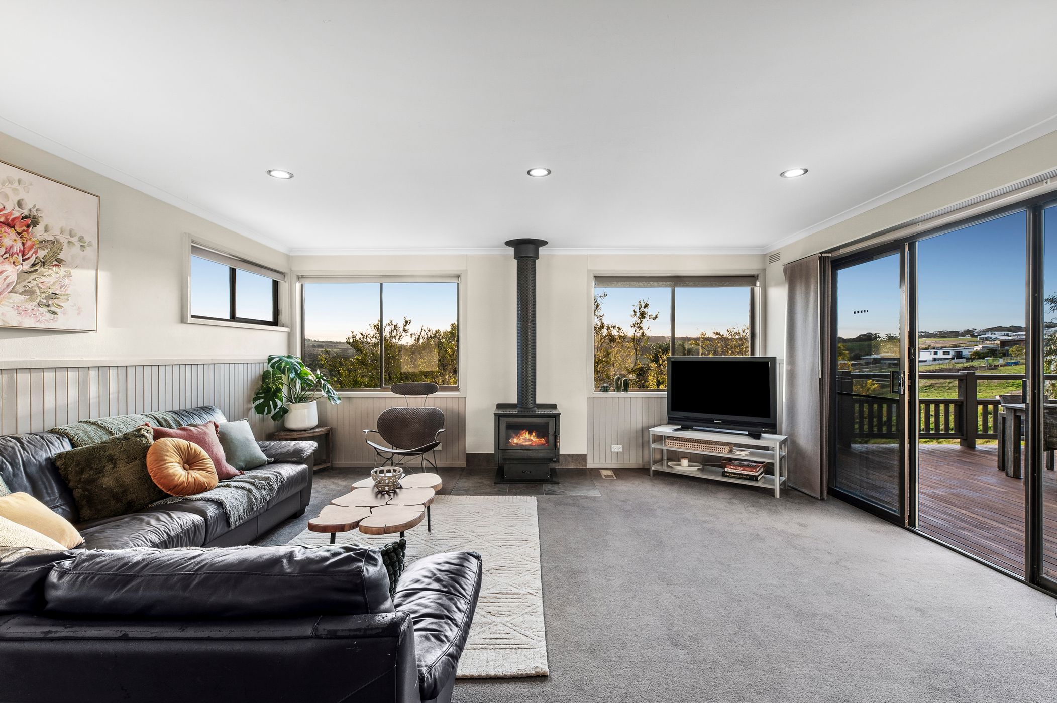 Living: Solid fuel heater, large glazing with views across the hills, carpet, half-wall timber panelling, and sliding glass doors to balcony.