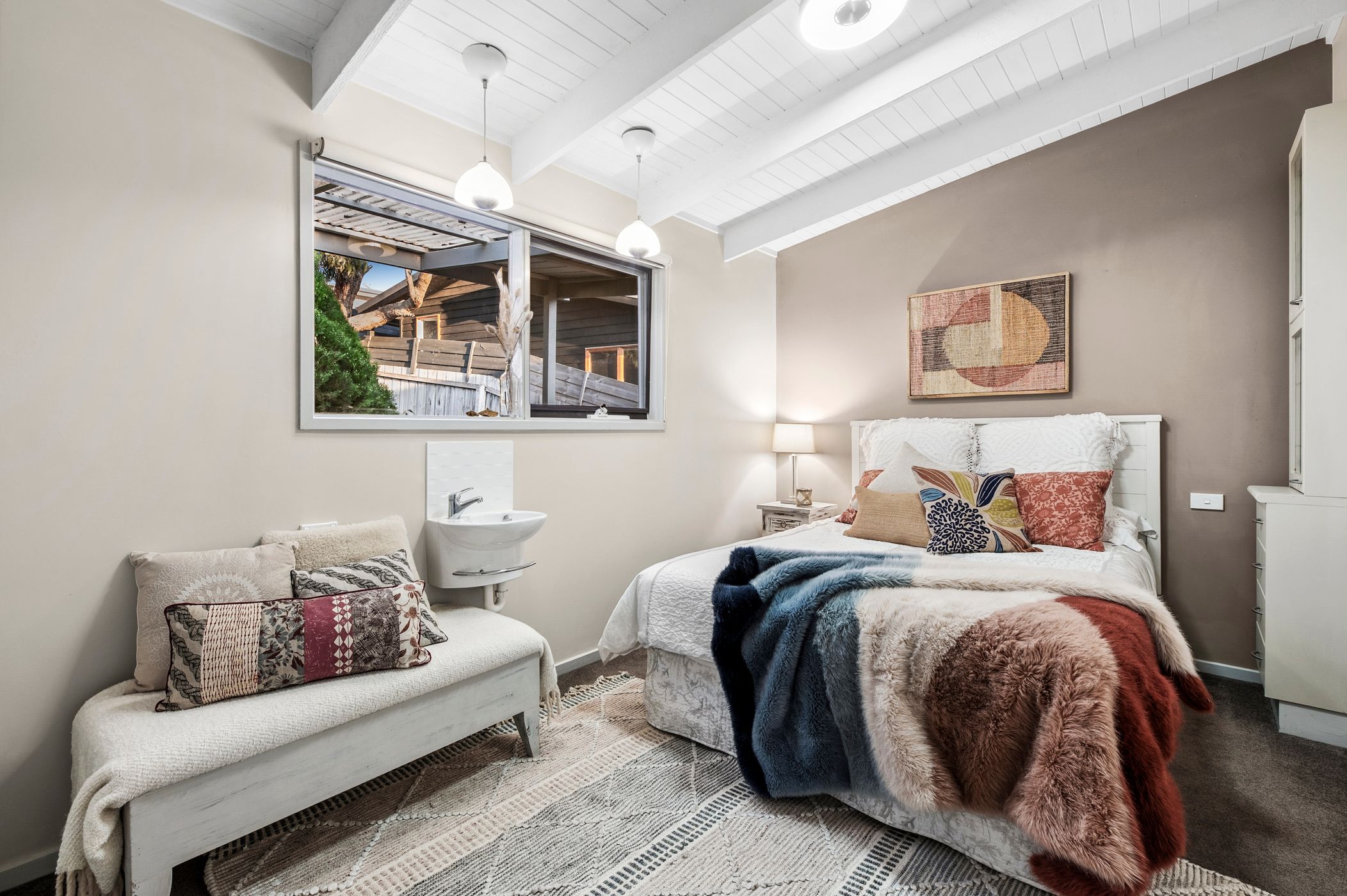 Master Suite: Walk-in robe, and ensuite with corner shower, single vanity with underbench storage, eye-level mirror with concealed storage, and toilet. Raked ceiling with exposed timber beams, carpet, and feature pendant light.