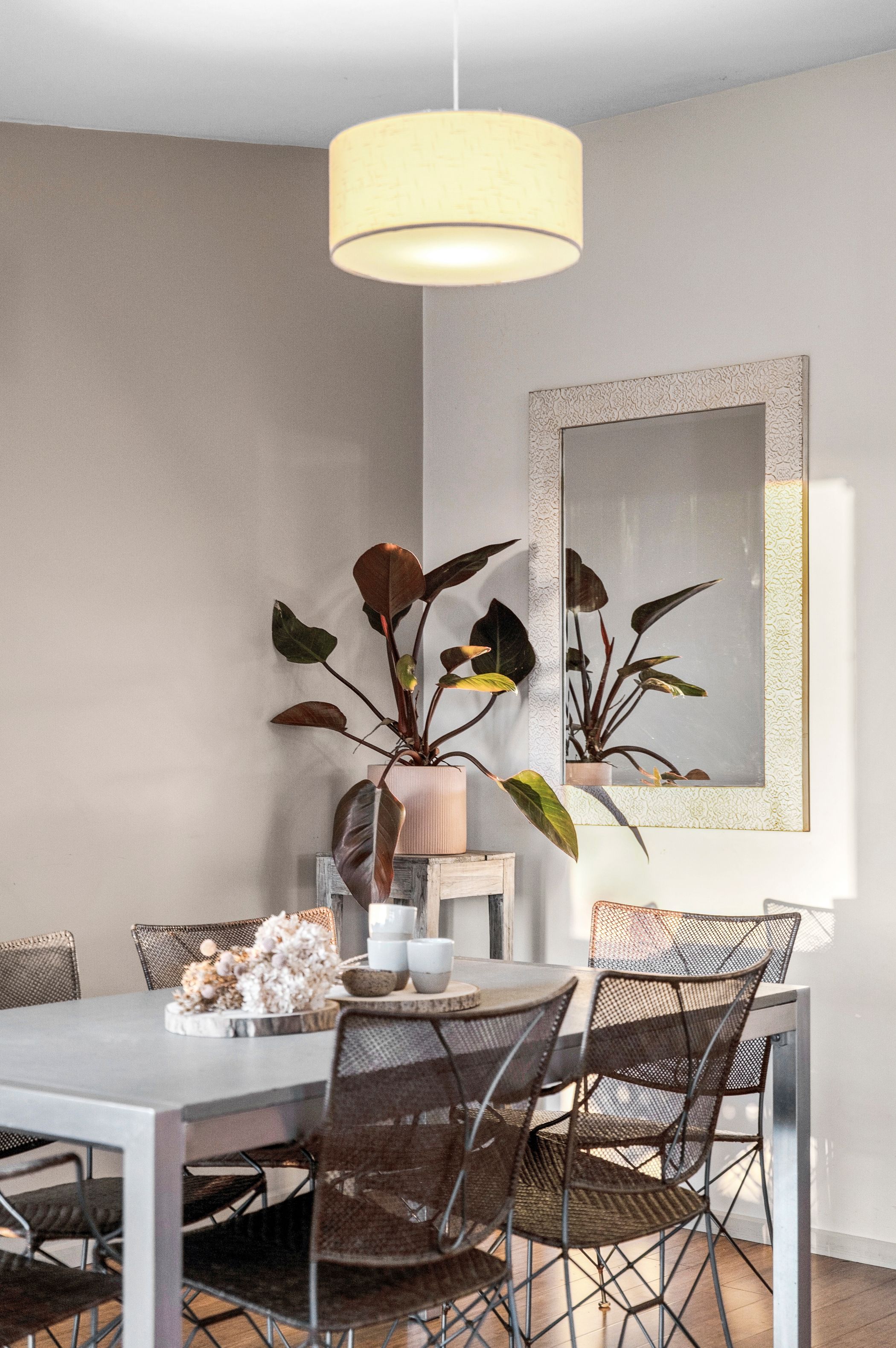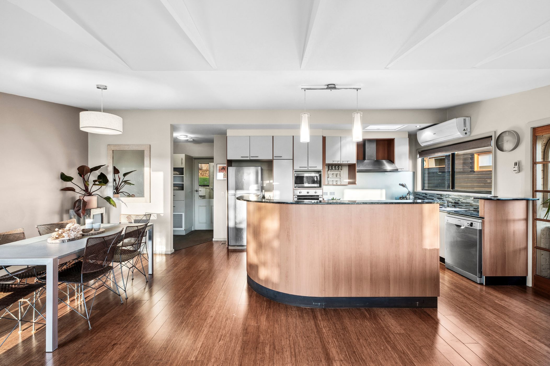 Dining: Hard-wearing floors, feature pendant light, and exposed timber ceiling beams.