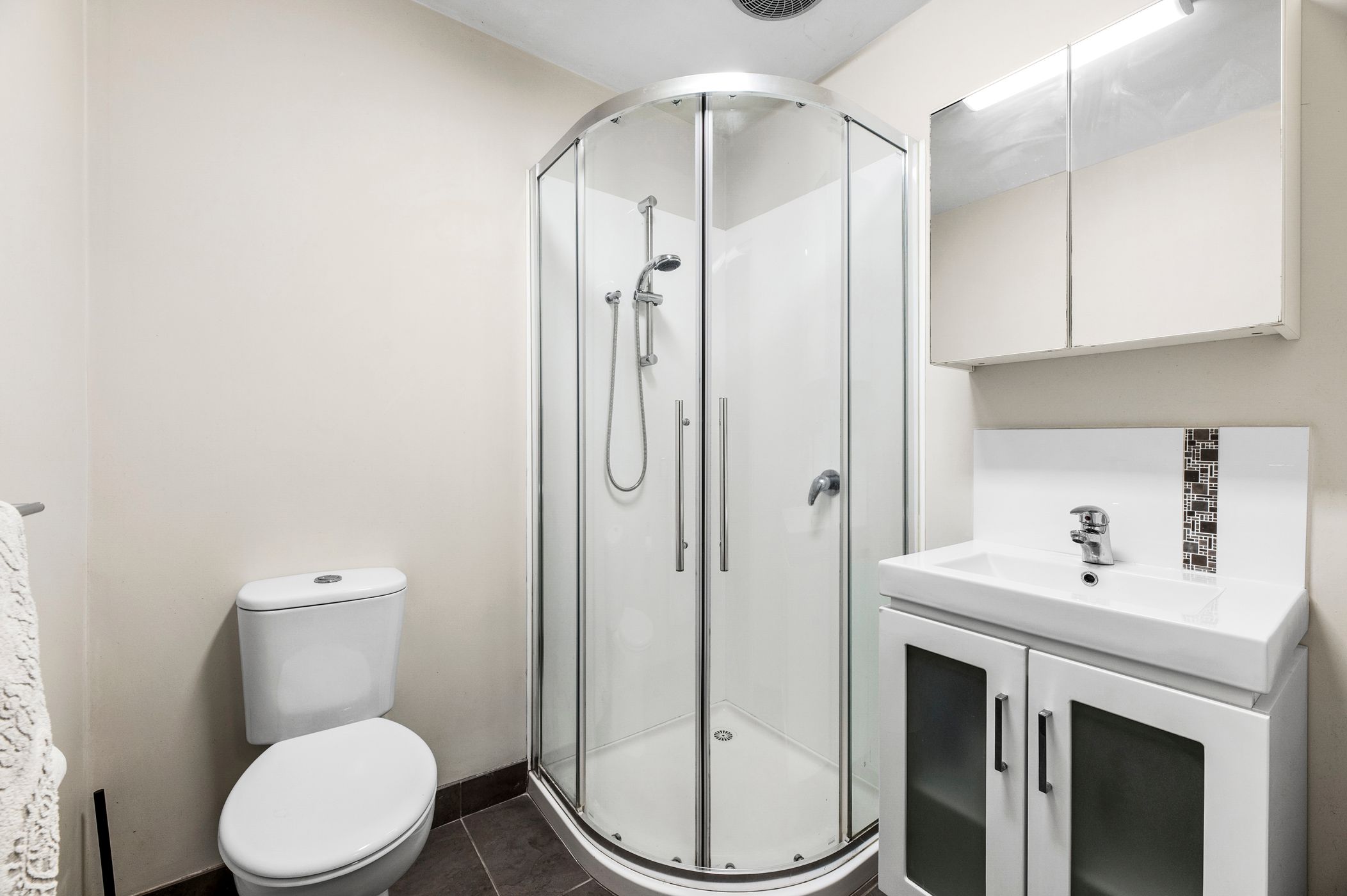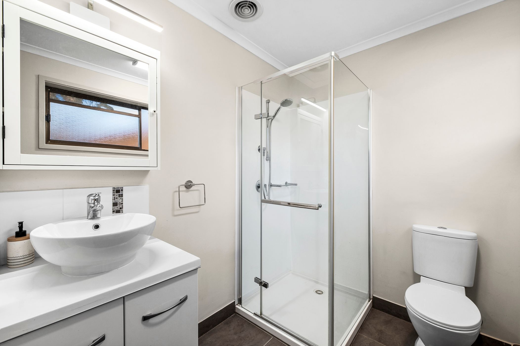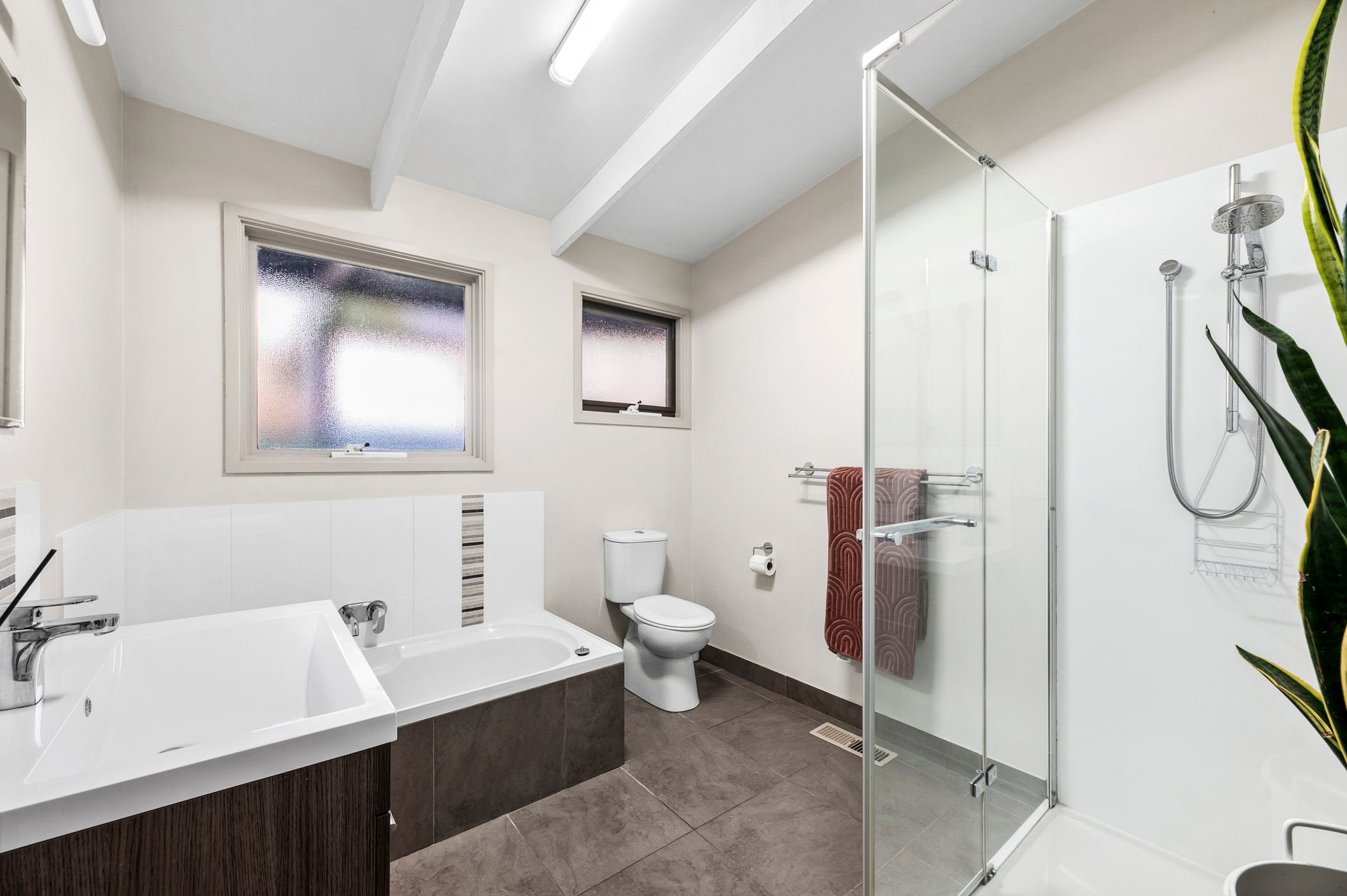 Main Bathroom: Tub, shower with rail head, single vanity with underbench storage, and toilet.