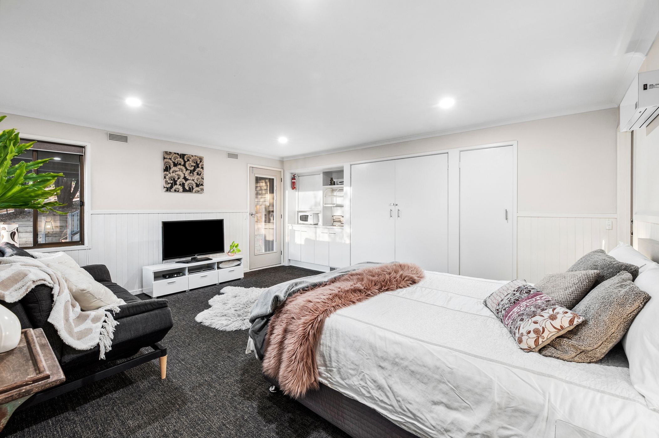 Additional Bedrooms: Two junior bedrooms each with robes occupy a top-floor position, while the lower-level offers private accommodation with a fourth studio bedroom complete with private ensuite, kitchenette and built-in robes.
