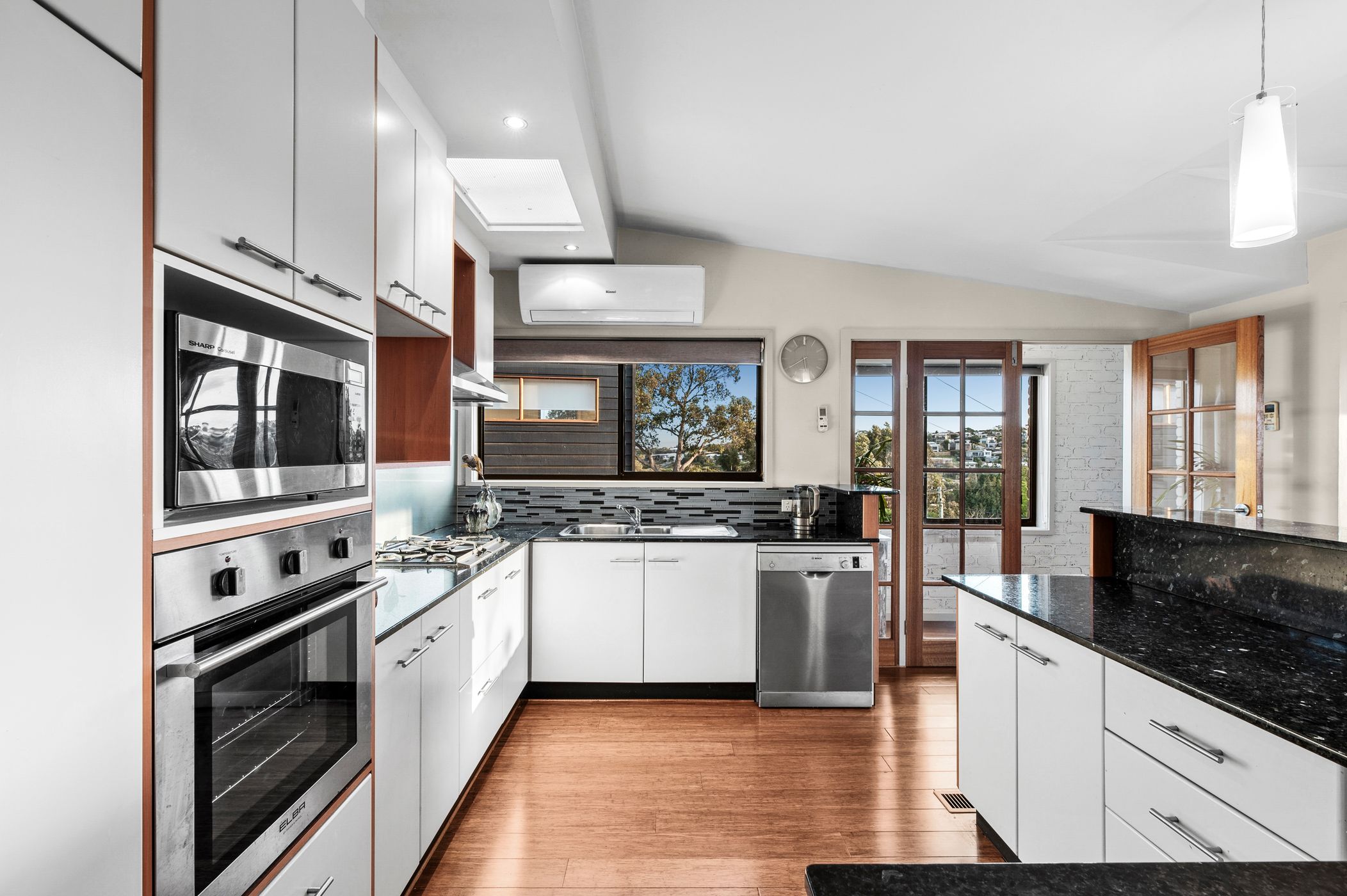 Considered: Kitchen: Black granite benchtops, curved island bench with bar top, wall oven and gas cooktop, dishwasher, dual sink and chrome tapware. Ample cabinetry including overheads, exposed rangehood, skylight, and feature pendant lighting.