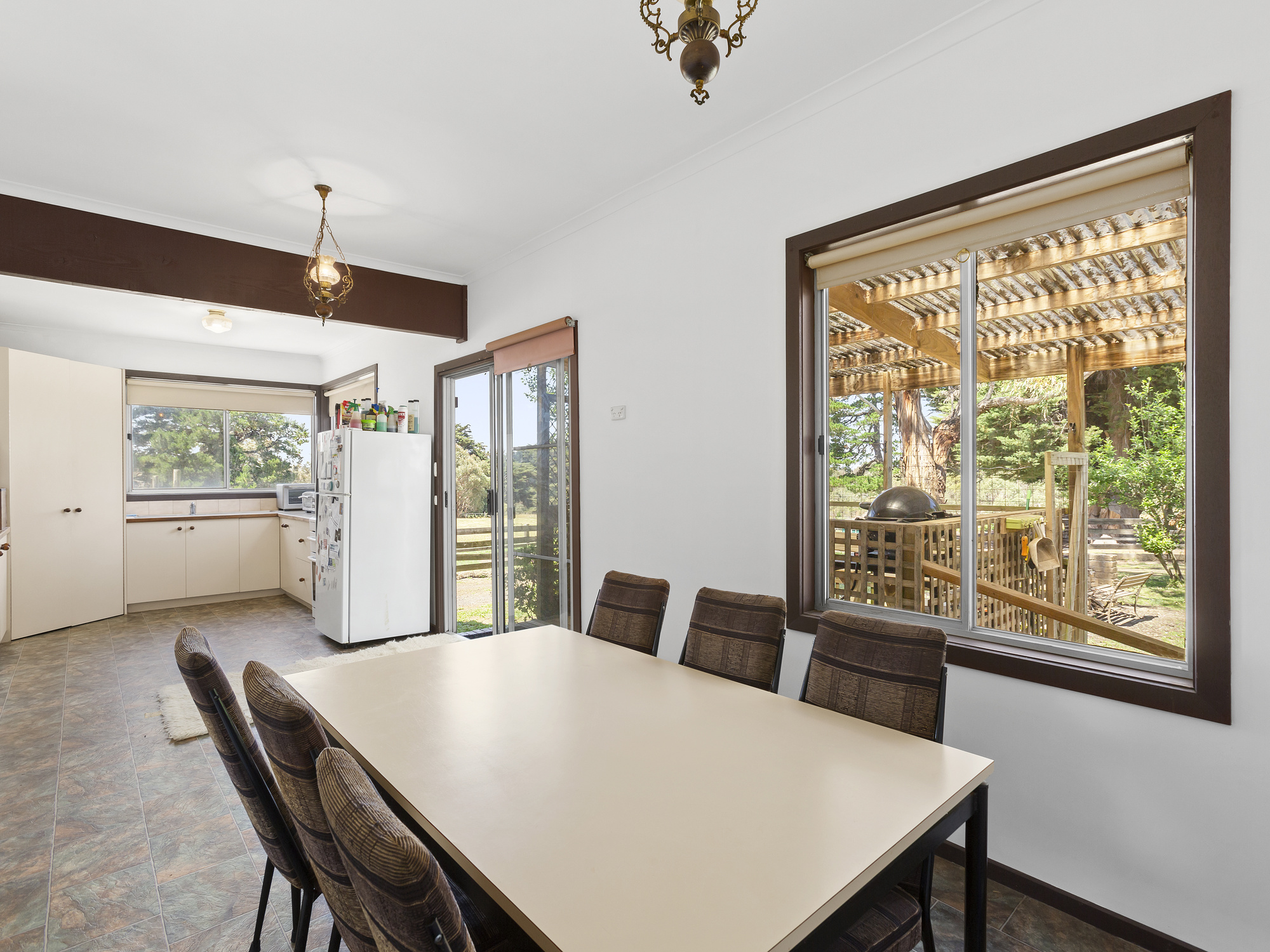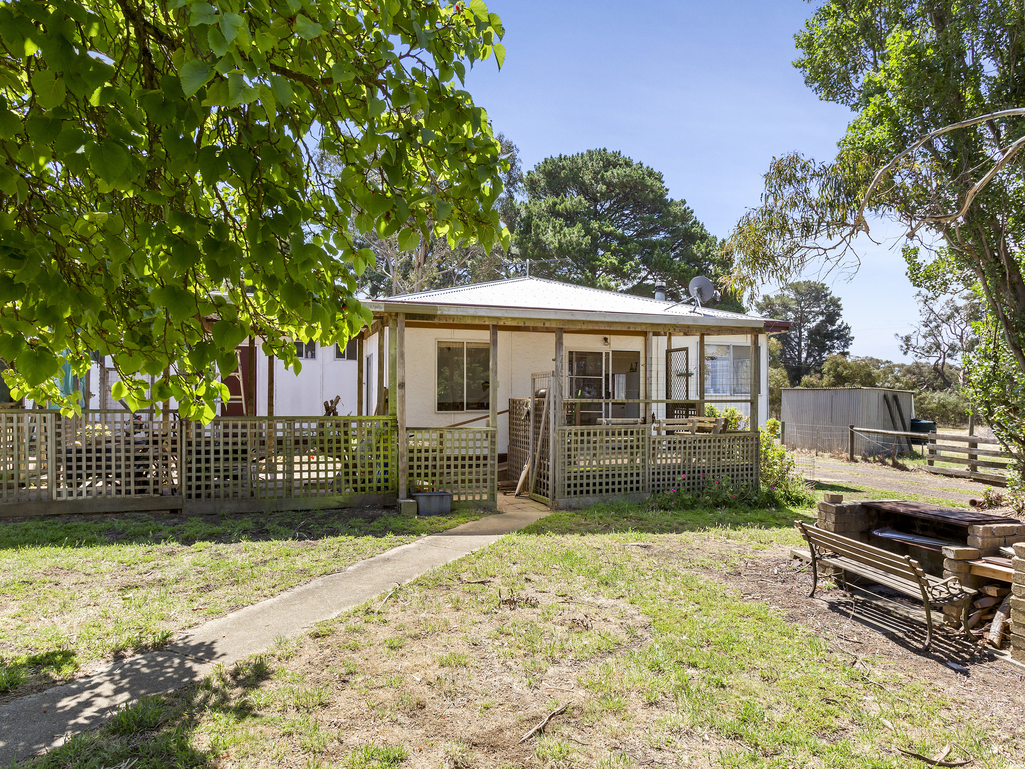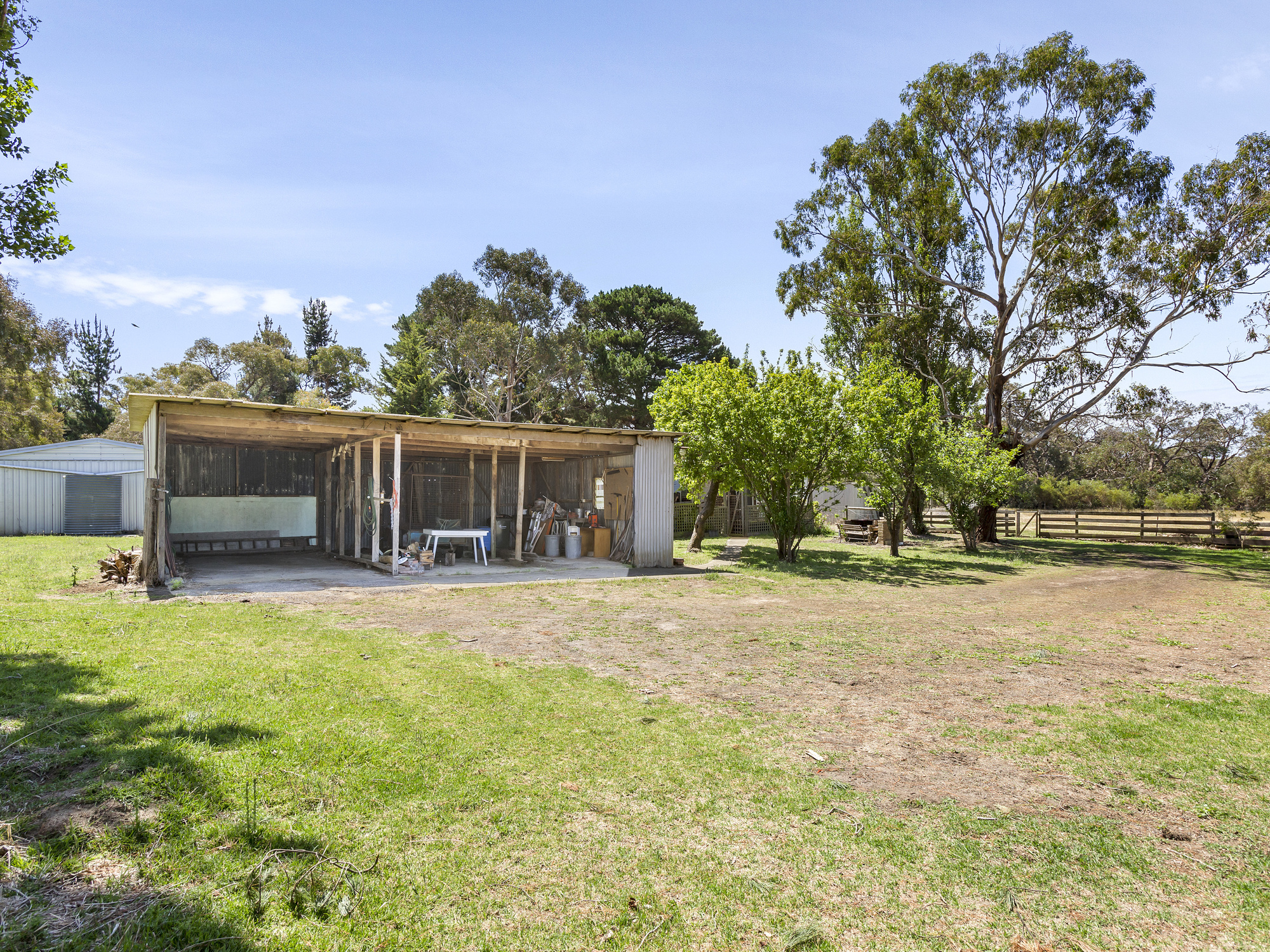 The existing farmhouse is set back from the road, privately protected by mature trees and native plants. You will have ample space for a growing family, with four bedrooms all with built in robes, a functional kitchen overlooking a dining area, a large living space with cosy woodfire heater, and a light-filled sunroom. There’s also two large undercover outdoor areas with outlooks across the paddocks, taking in the dams and wildlife.