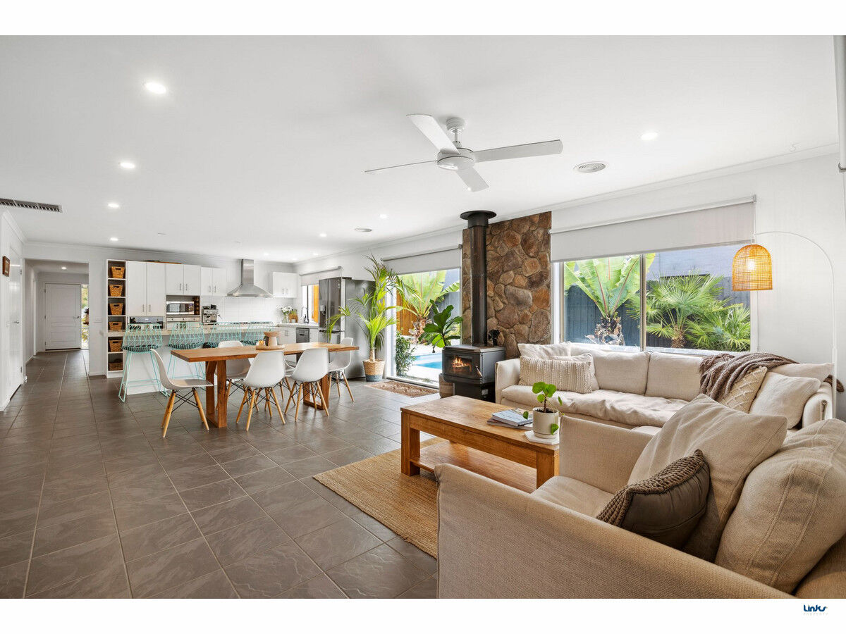 - Double wall ovens, 5 burner gas stovetop, huge island bench and abundance of cupboards - Large rumpus at rear with built in study desk - Windows to the West flood the living room with natural light - Spotted Gum decked alfresco, built in BBQ and porcelain tiles around the pool - Tropical inspired garden with irrigation and cobalt stone retaining wall - Ducted heating and evaporative cooling throughout (heater unit upgraded and replaced 12 months ago) - Wood fireplace to enjoy cosy winter days - Ceiling fan in the main living and master bedroom - Stone benches throughout - A 10 minute walk to the beach, The Sands Clubhouse and local schools and shopping village