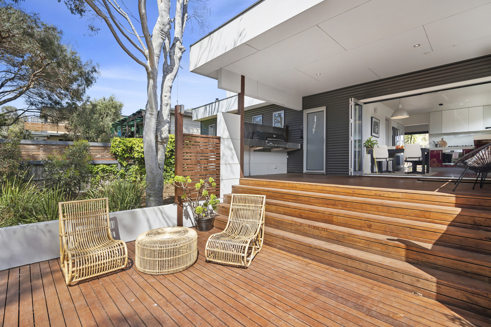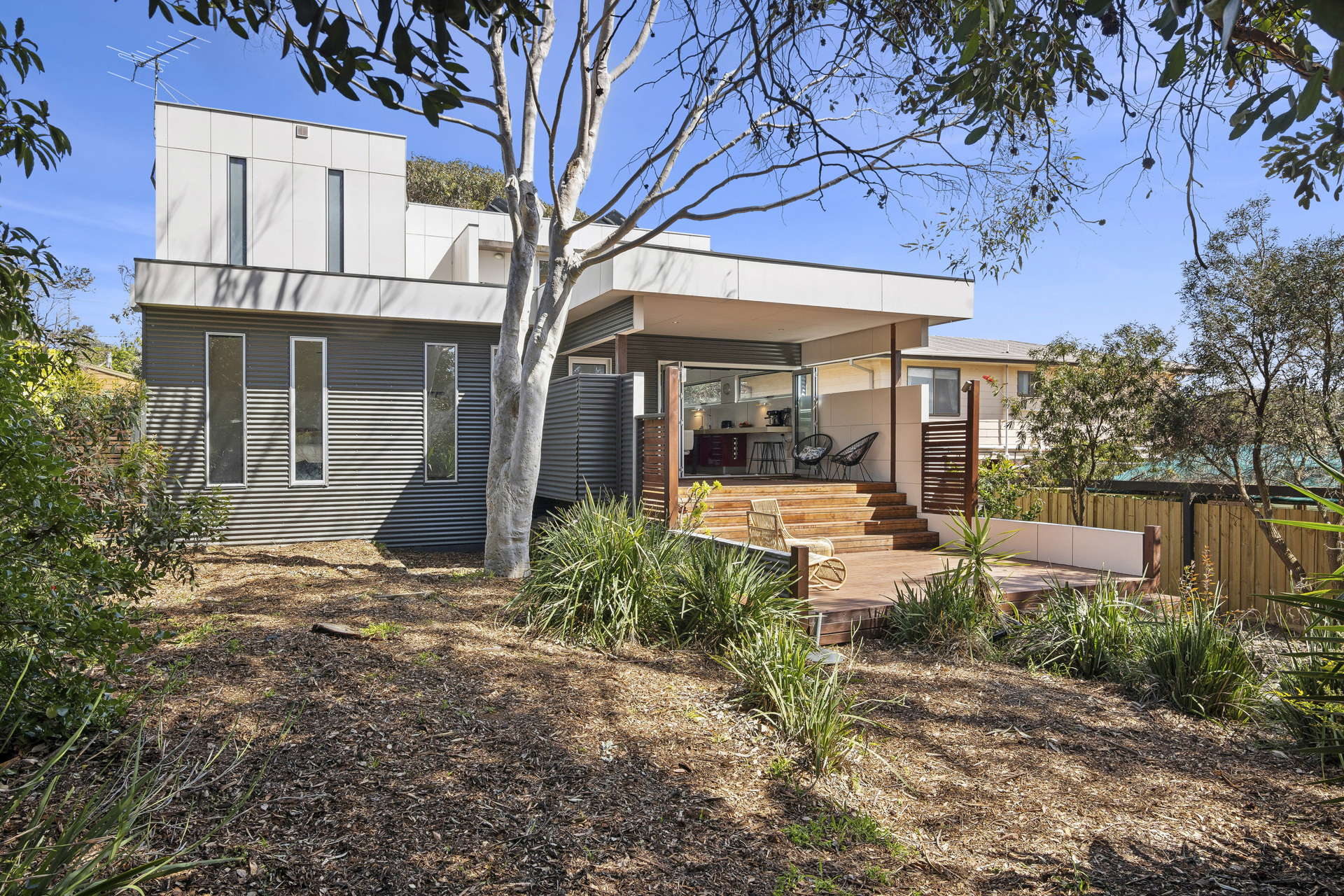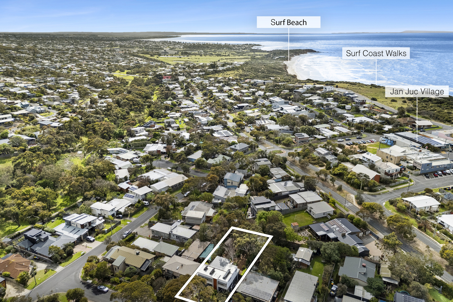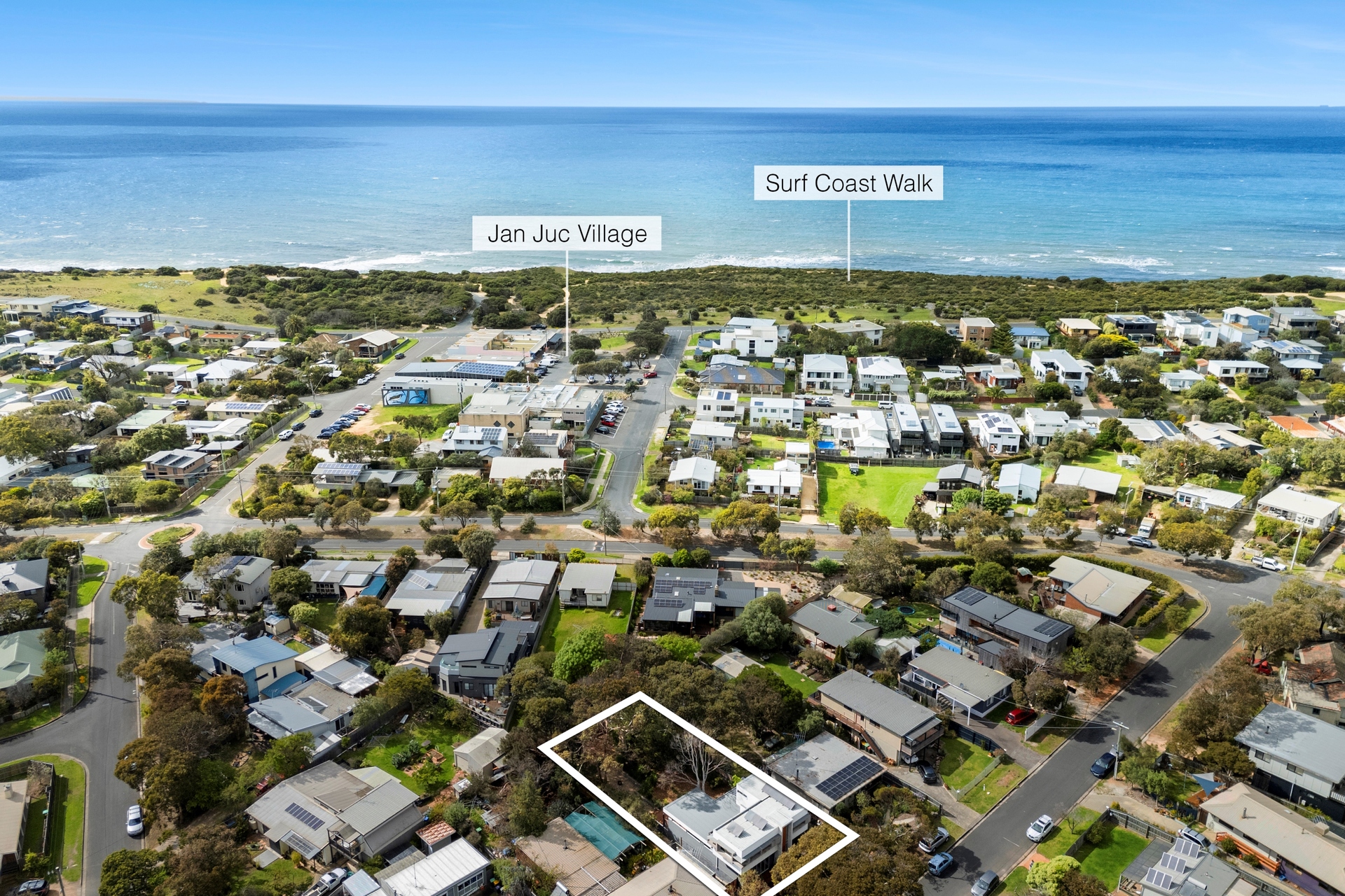 Discover this stunning 3-bedroom, two-storey architectural-designed home, nestled in a highly sought-after pocket. This prime location offers the perfect blend of architectural style and family living, providing easy access to picturesque shores and scenic walking trails. From the moment you step inside, you'll be captivated by the seamless connection between indoor and outdoor spaces, designed to embrace natural light and the tranquillity of the surrounding gardens. High ceilings and an open stairwell to the upper level serve as striking design elements, enhancing the sense of space throughout the home. Upon entry, you are welcomed by a spacious living area that features bi-fold doors opening to the front deck, beautifully blending indoor and outdoor living. This connection flows effortlessly into the well-appointed, light-filled kitchen, where the sun streams through the windows, offering picturesque views of the treed garden. The kitchen also boasts bi-fold doors leading to the outdoor alfresco area, complete with a built-in BBQ and deck-perfect for entertaining family and friends. The flowing floorplan includes two generous bedrooms and a central bathroom on this level, making it ideal for family living. Off the living zone, you'll find a designated study, perfect for working from home or pursuing creative projects. The upper level features a luxurious parents' retreat, complete with a master bedroom, walk-in robes, an ensuite, and a separate living zone. Enjoy views across Jan Juc from the picture windows, with the deck seamlessly flowing from the living space-creating a perfect spot for morning coffee or evening relaxation. The private, bush-style garden offers a peaceful retreat with its natural landscape, featuring a fire pit area that's perfect for cozy gatherings. Additionally, the garden includes a separate home studio or office-ideal for creative pursuits or additional workspace. You'll also appreciate the sustainability features, including water tanks & solar panels, which enhance the home's eco-friendly appeal. Step out onto your choice of front or rear decks, making it easy to entertain or simply enjoy the serenity of your surroundings. Positioned just 450 meters from Jan Juc Beach, local cafes, and restaurants, this home provides an ideal setting for families seeking to embrace a coastal lifestyle.