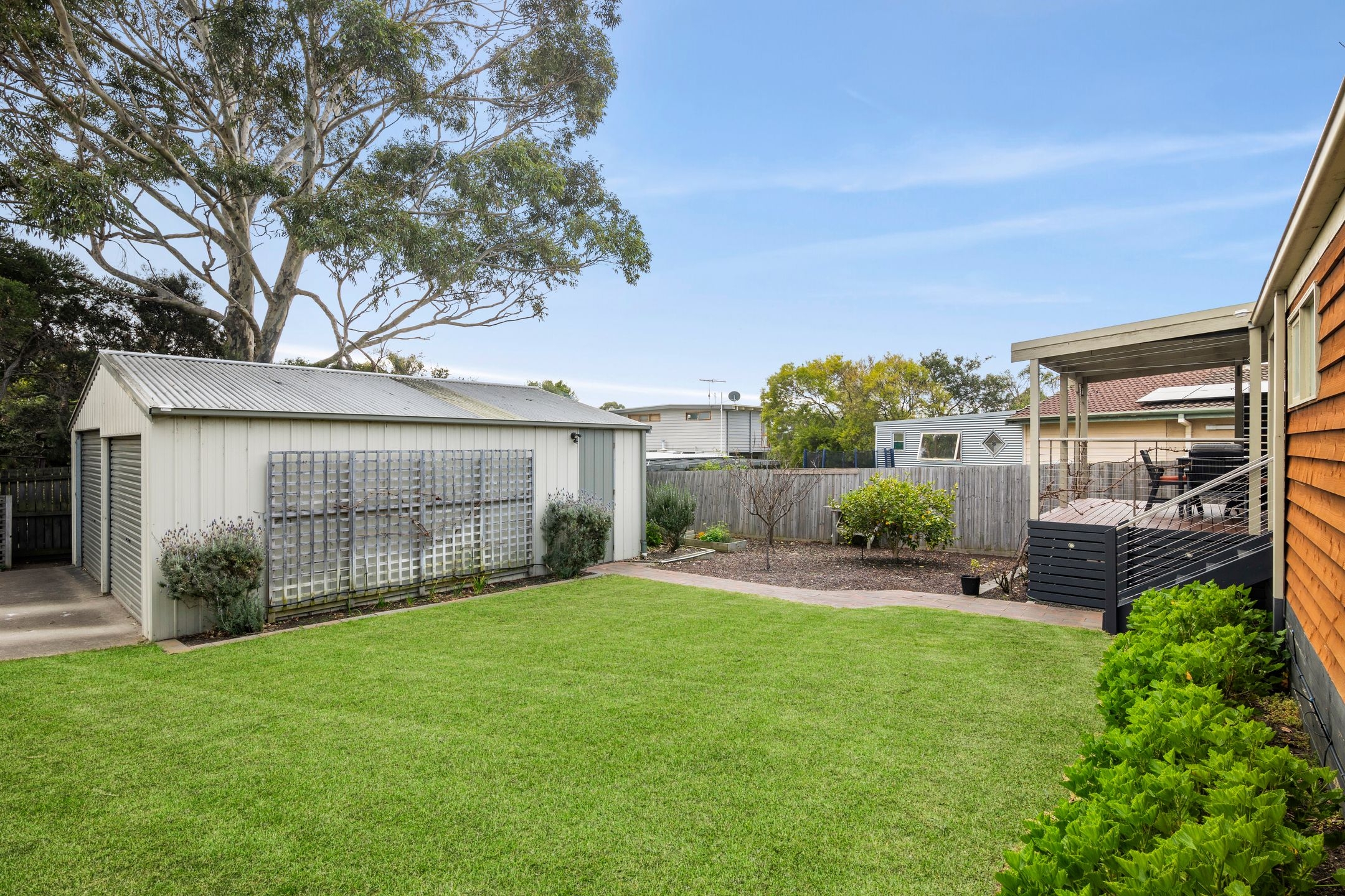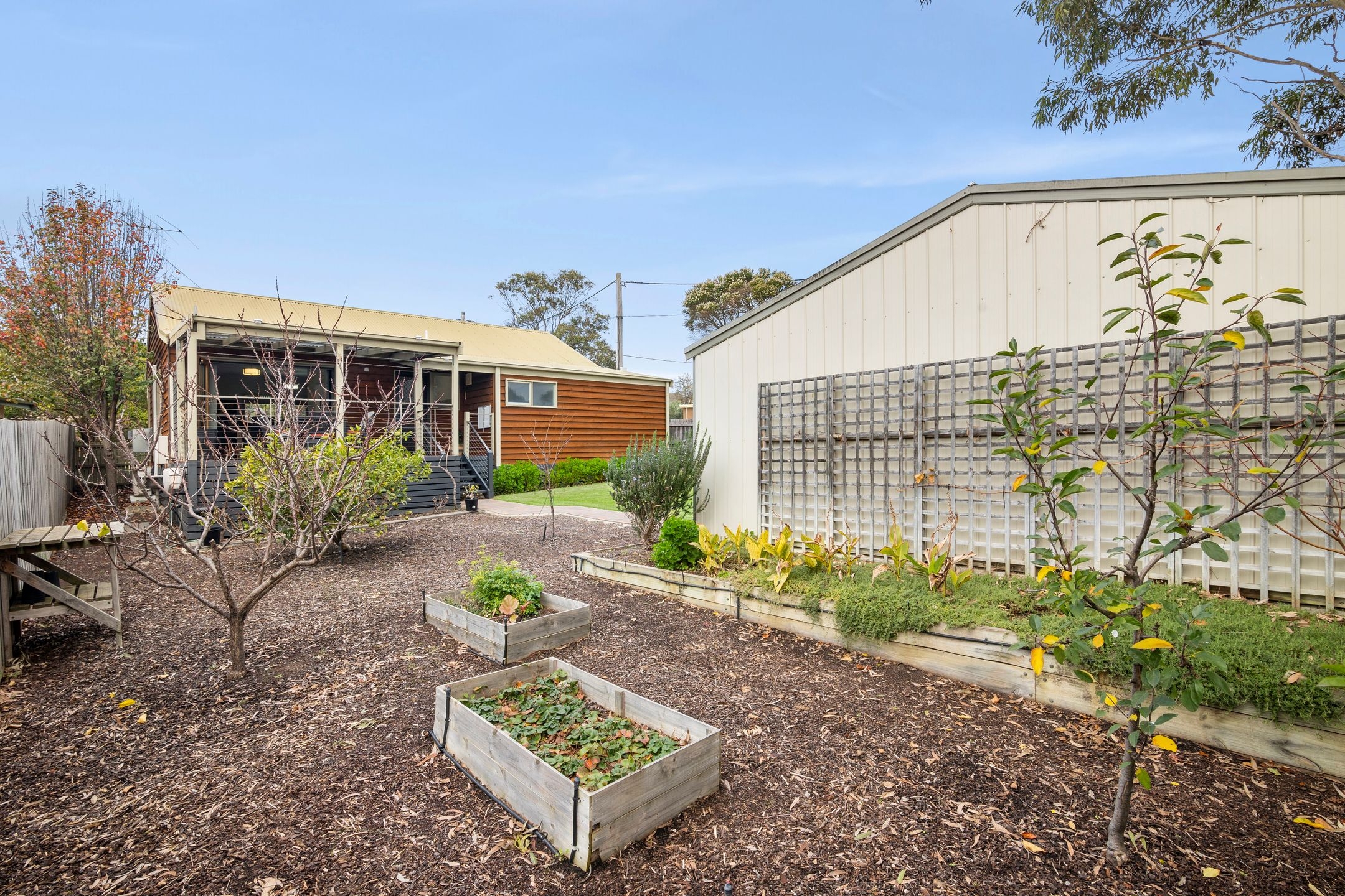 • The generous backyard boasts a versatile double garage, fruit trees & raised veggie/herb boxes perfect for gardening enthusiasts.
