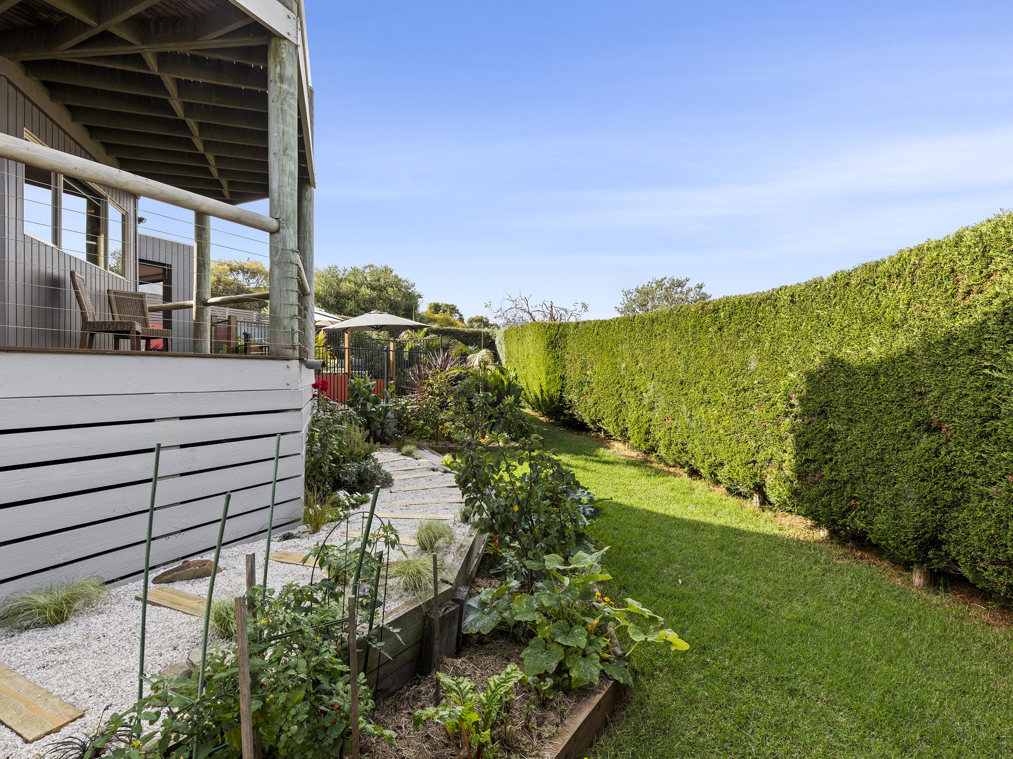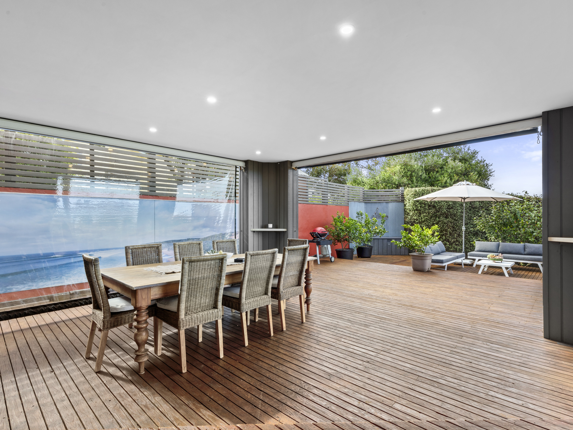 The multi-level backyard is a true oasis, with a lush tropical-style palm garden, fruit trees, vegie garden, lush lawns and coastal plantings. All protected by an impressive Cyprus hedge, that offers privacy and shelter from the coastal elements. The multi-level and wrap-around entertainment deck boasts a deluxe spa and a spacious undercover alfresco dining area, all perfect for capturing the sun or shade as required, whilst either sharing an outdoor meal with family and friends or just relaxing in the tranquillity of your surrounds.