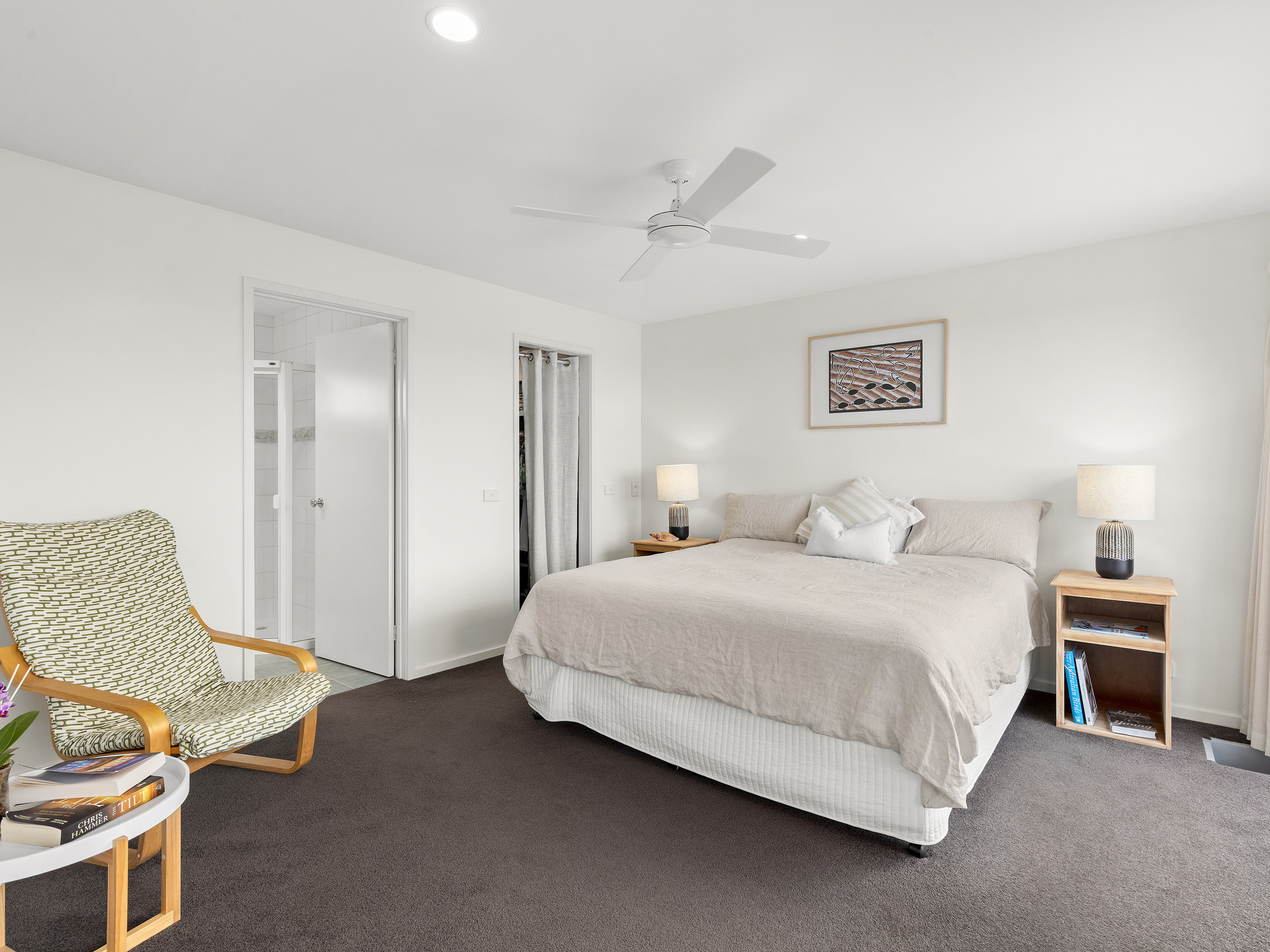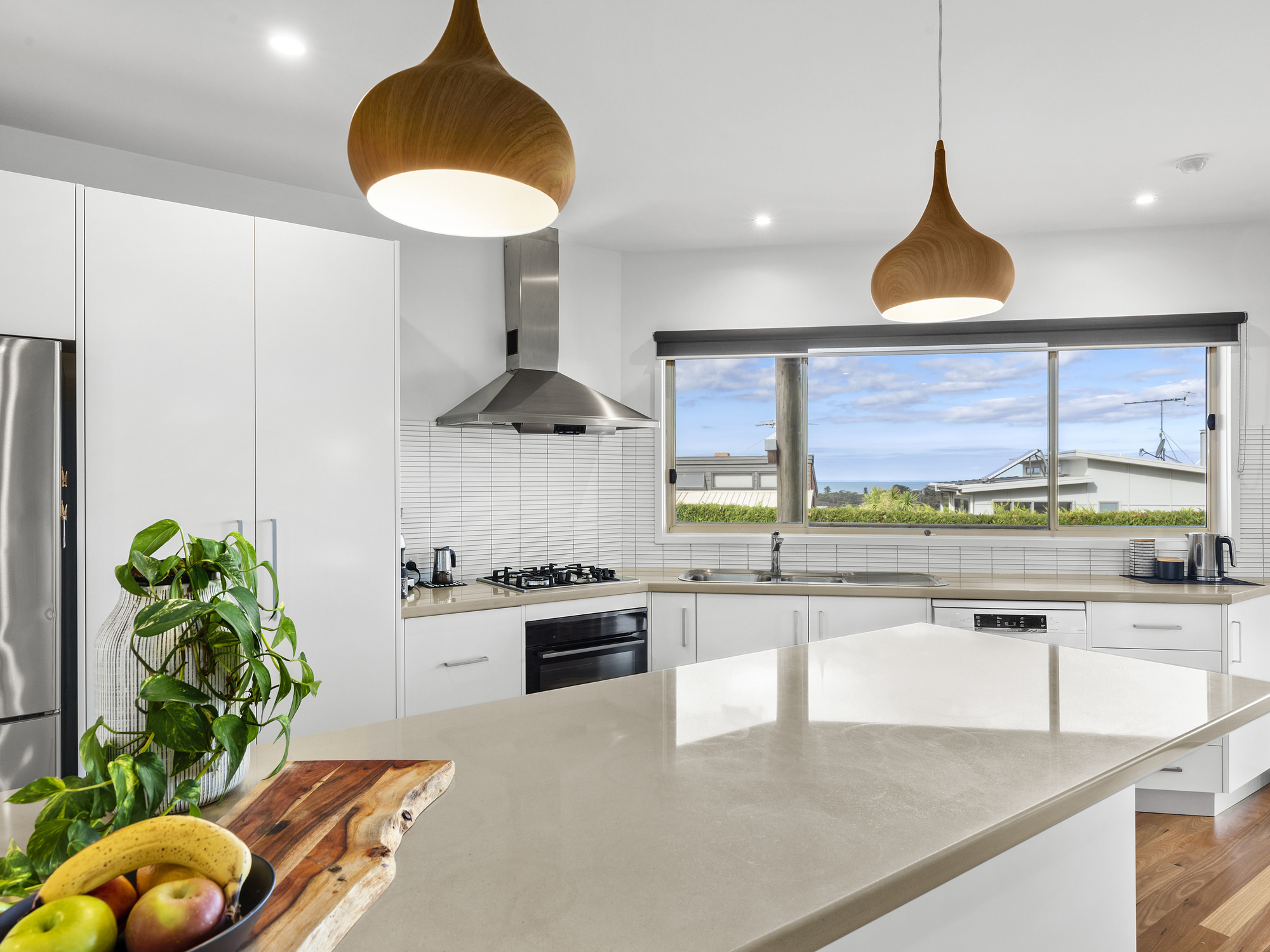 Upstairs, the master retreat is a true sanctuary, with Jarrah hardwood flooring, a timber-lined feature ceiling, kitchenette/bar, and expansive living area. From the moment you wake up, you'll catch a glimpse of the ocean from the private balcony, and it will seem to follow you around wherever you go. You'll also have a private home office, although it will be hard to focus on work with such a stunning view surrounding you. Step outside onto the viewing deck to fully appreciate the true extent of this coastal panorama, which overlooks Jan Juc and Torquay, whilst taking in Barwon Heads Bluff, Point Lonsdale Lighthouse, and across The Rip to Point Nepean, Arthur’s Seat and Cape Schank on almost any day. You'll even be able to keep an eye on Haystacks and Point Danger surf breaks from this vantage point!.