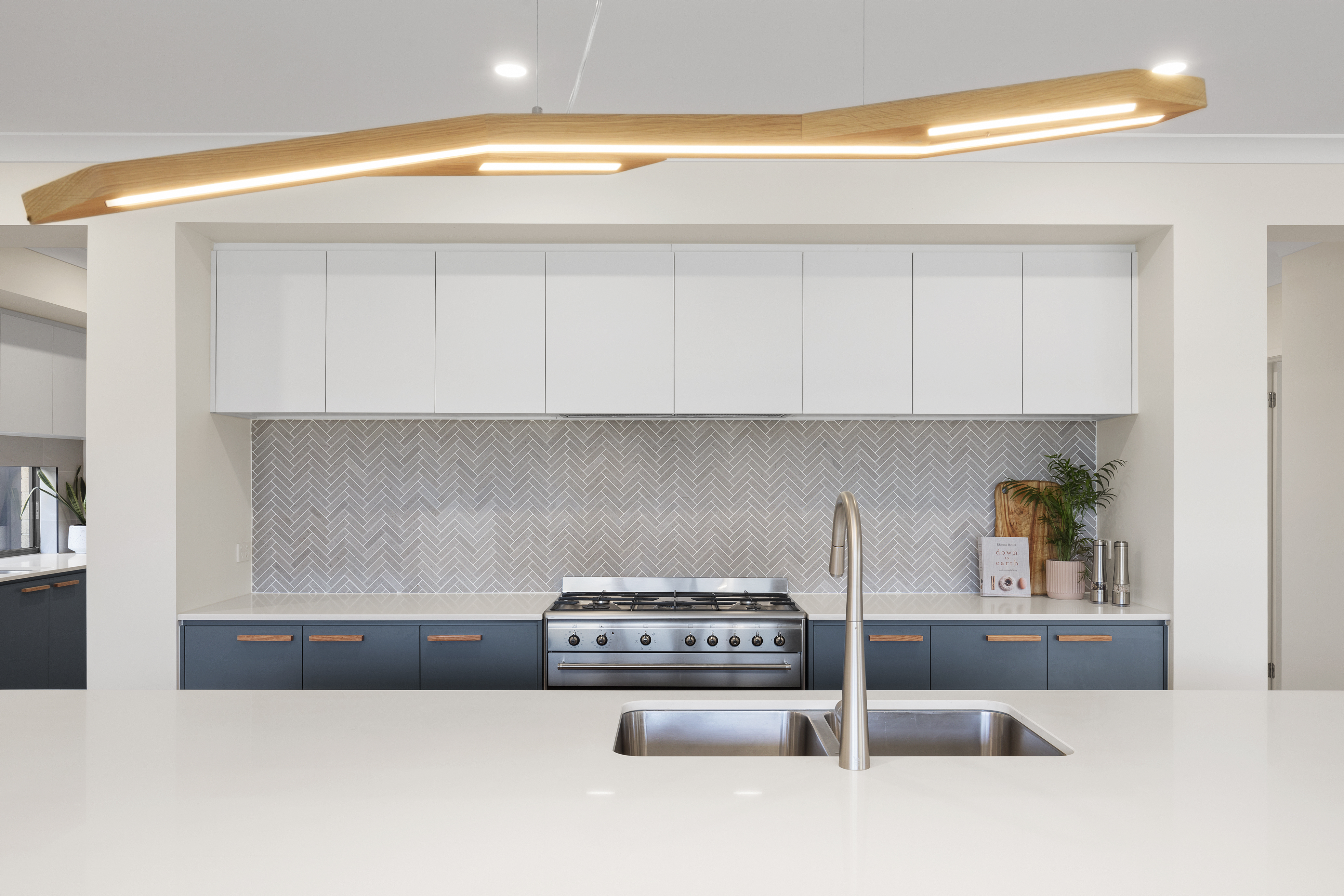 stone benchtops, Frankie sinks and Wels pull out tapware -Magnificent stone island bench with breath-taking architectural light feature
