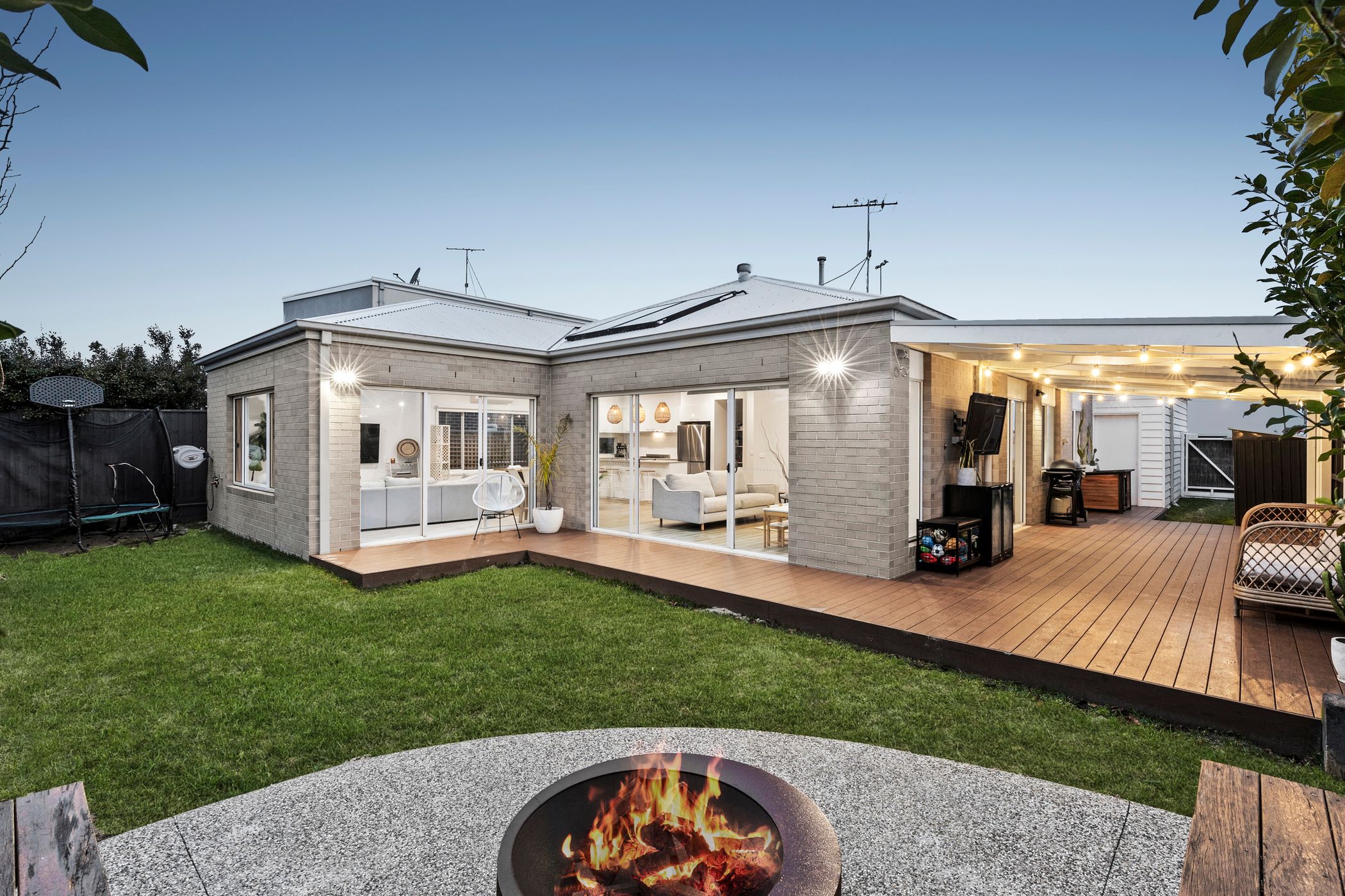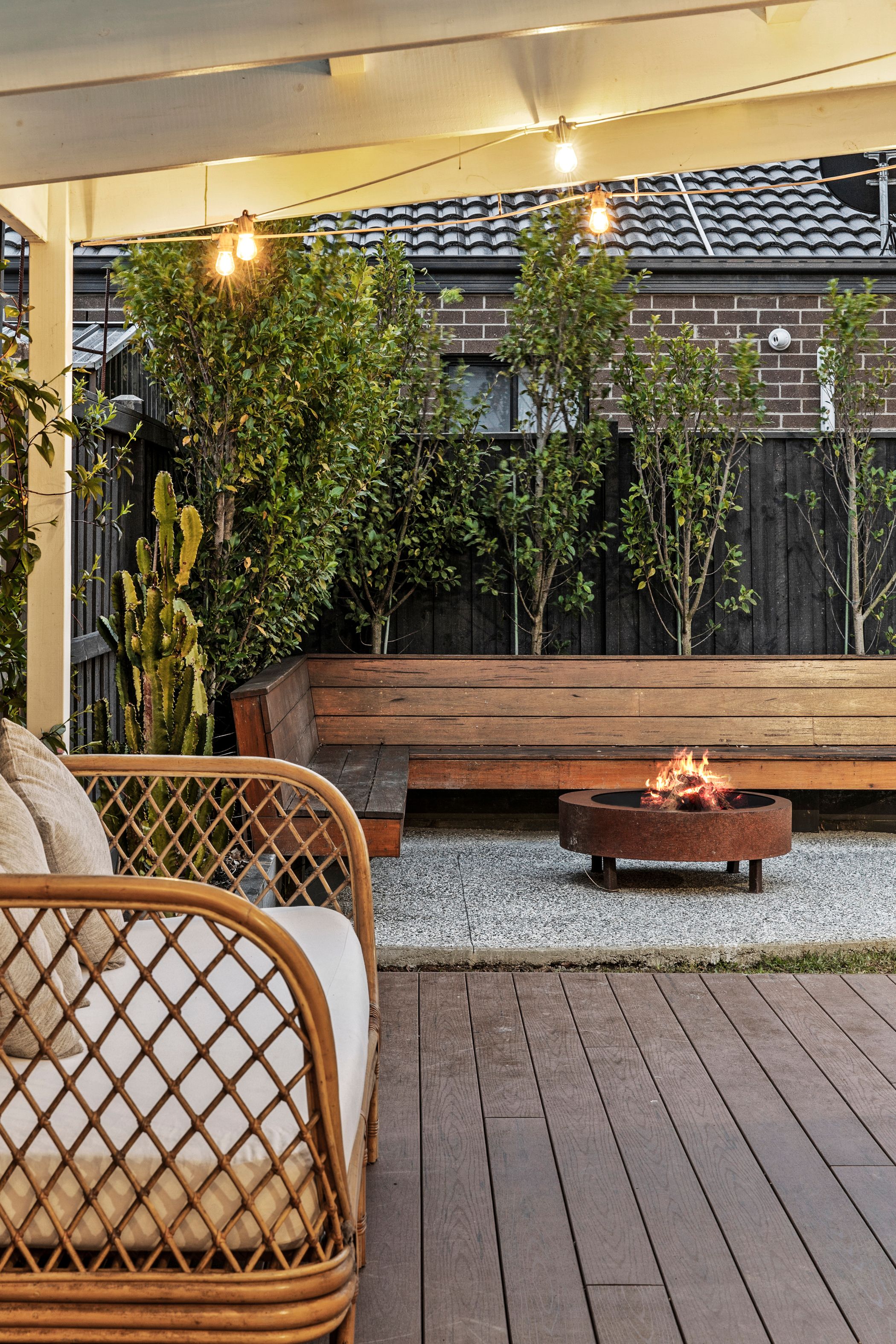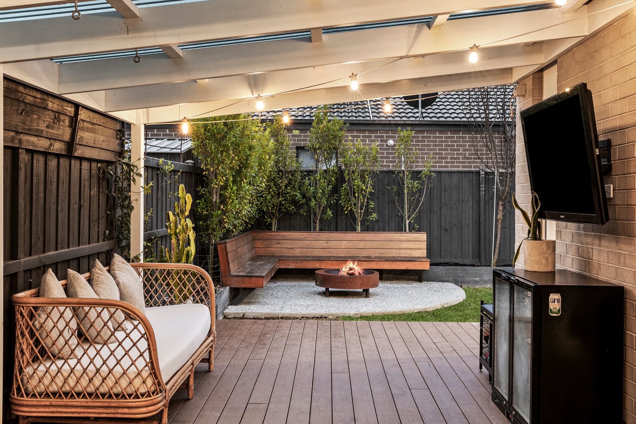 Outside: A coastal-inspired facade gracefully complements its low-maintenance garden, featuring a covered side alfresco area equipped with a TV point, a cosy corner fire pit surrounded by built-in bench seating, and a grassy play area for children nestled among lush perimeter plantings.