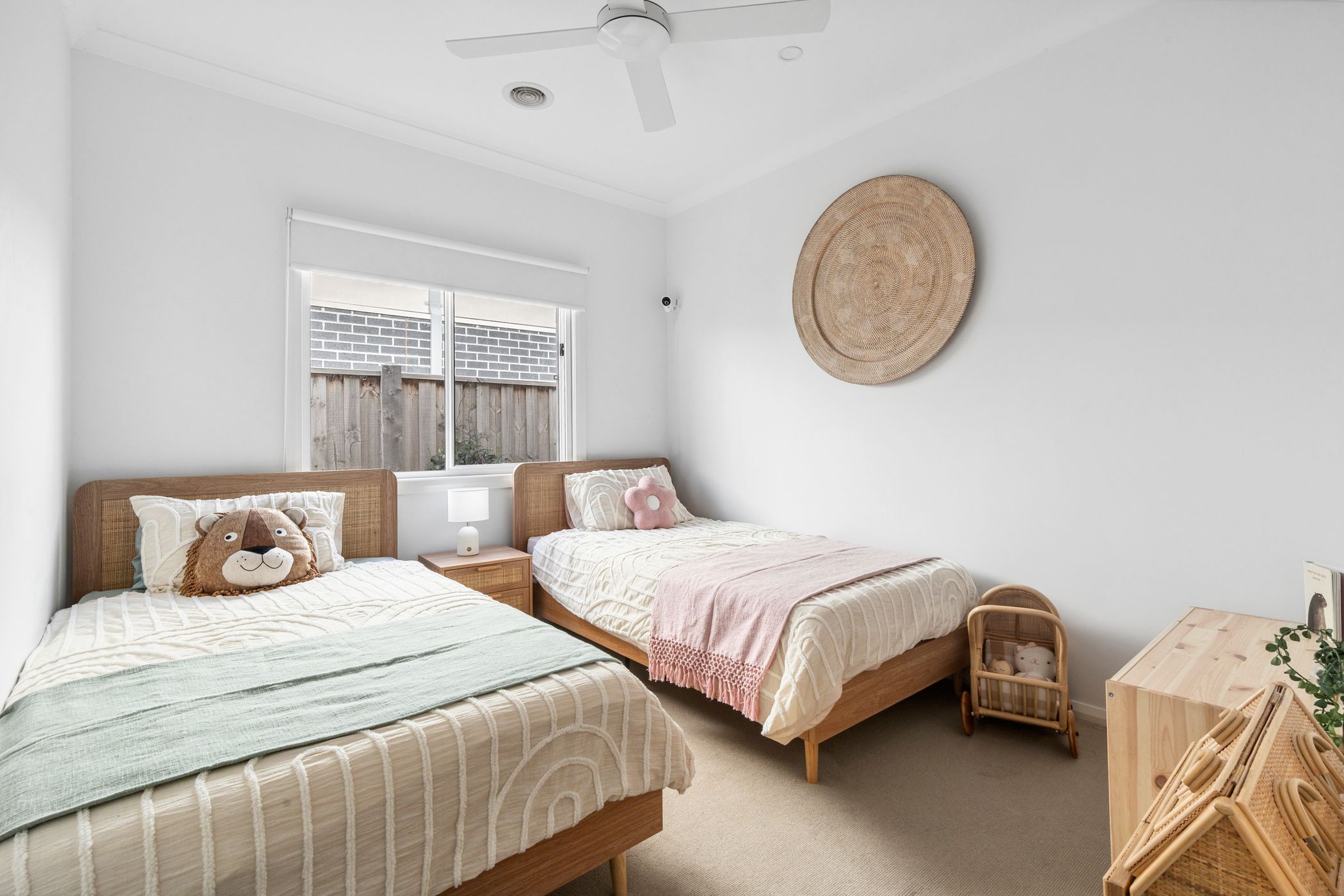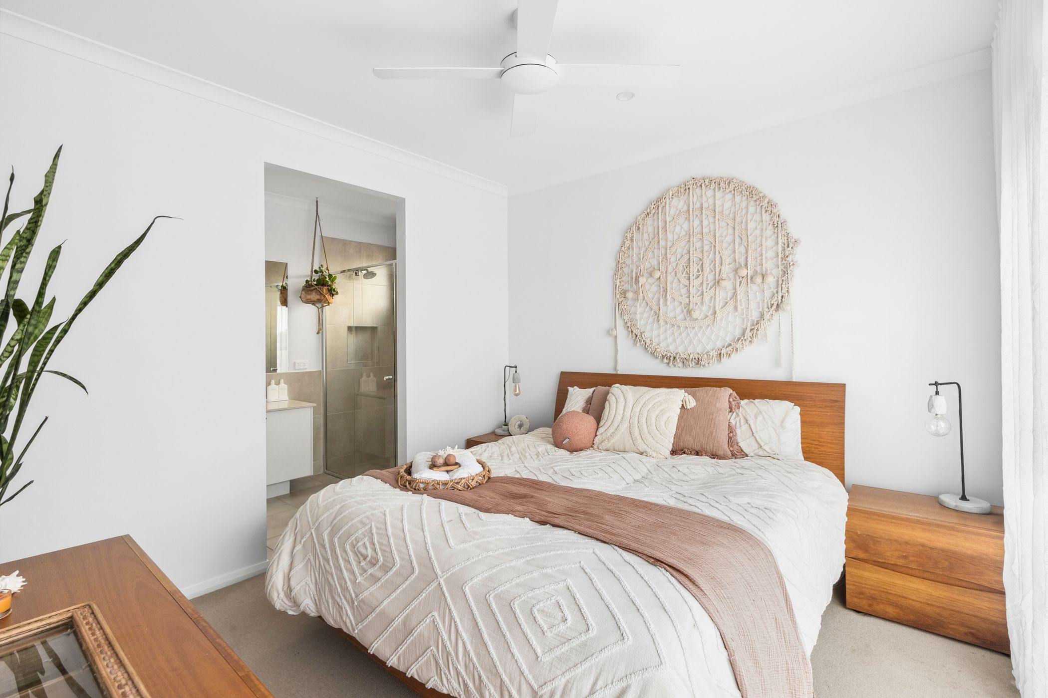 Master Suite: ‘His and hers’ walk-in robes, ensuite with single-head shower with nook, oversized single vanity with underbench storage, and private toilet. Full height sheer blinds, front-facing window, ceiling fan, carpet and tv point.