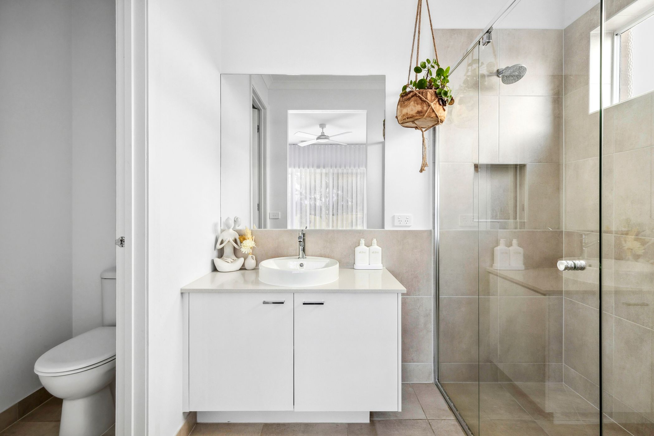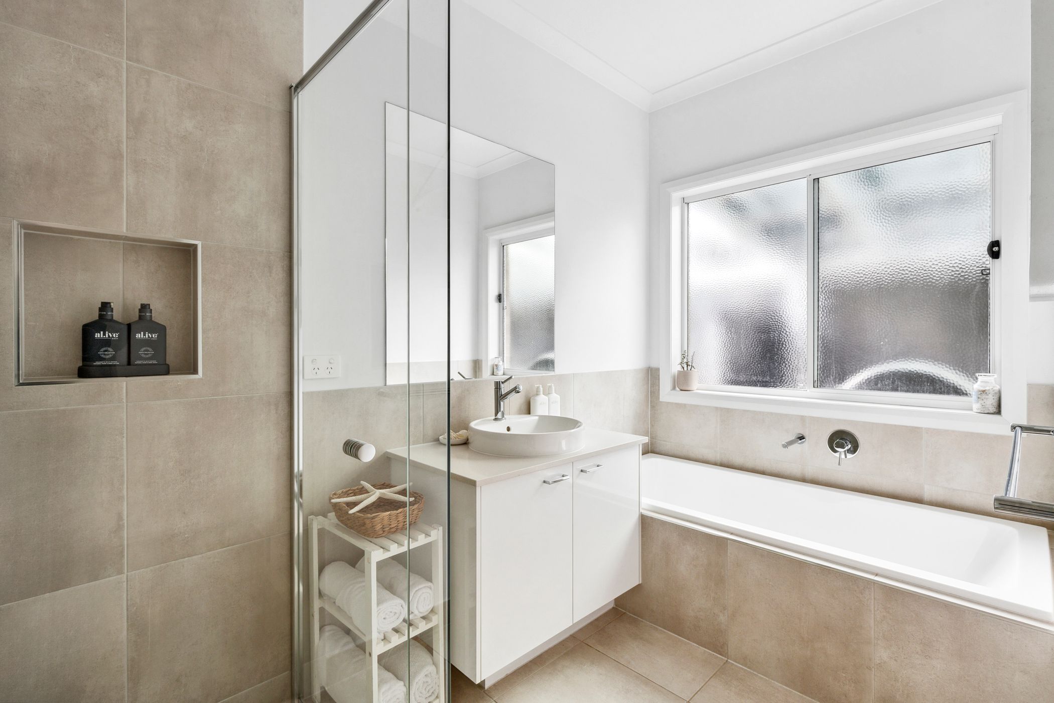 Main Bathroom: Single shower with niche, single vanity with underbench storage, in-built bathtub and separate toilet.