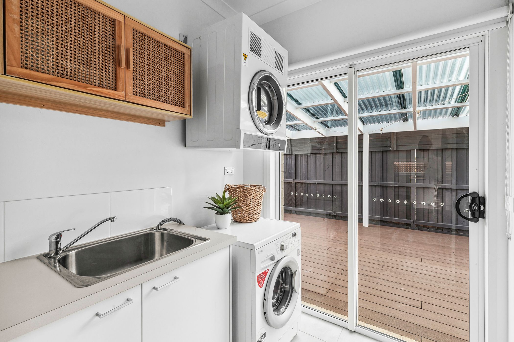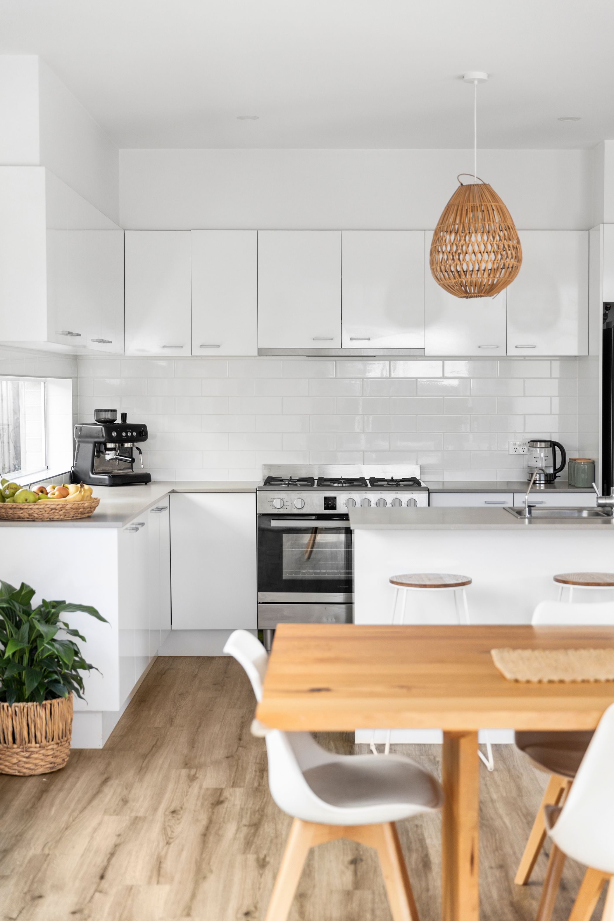 Open Plan Living/Dining: Light and breezy with sliding doors to the yard, hard-wearing floors and carpet define eating and lounging zones, large windows with roller blinds.