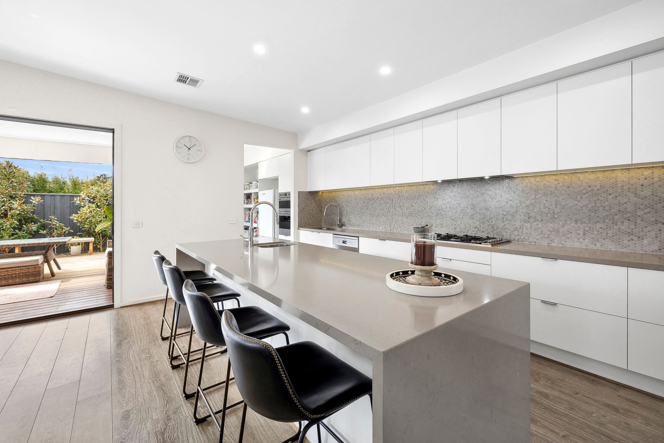 • The designer kitchen, showcasing sleek stone benchtops, a statement title splashback, grand island bench, premium Smeg appliances & a large butler’s pantry with a convenient servery window.