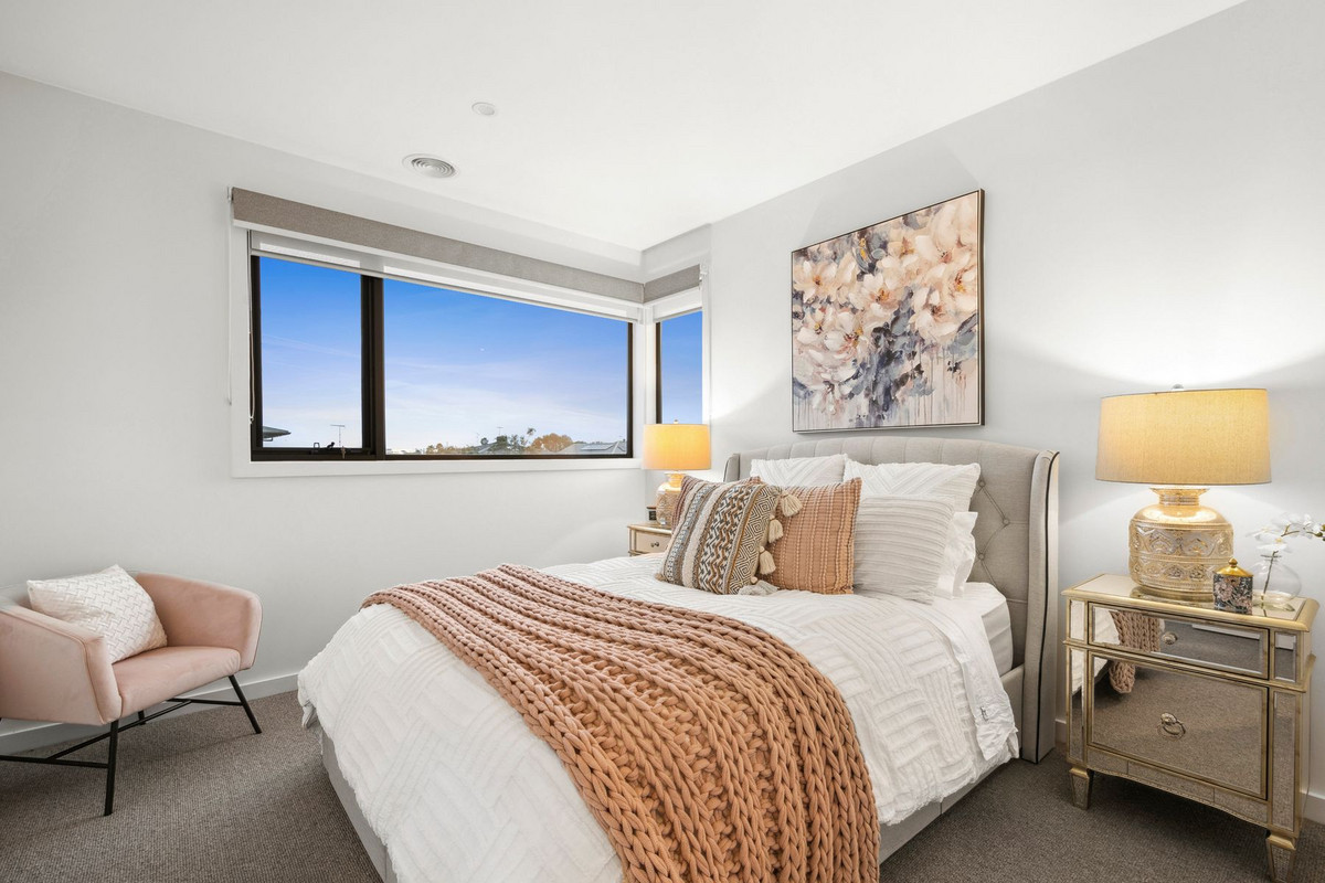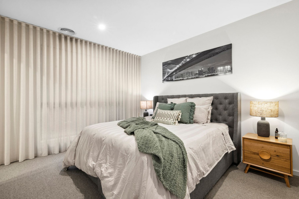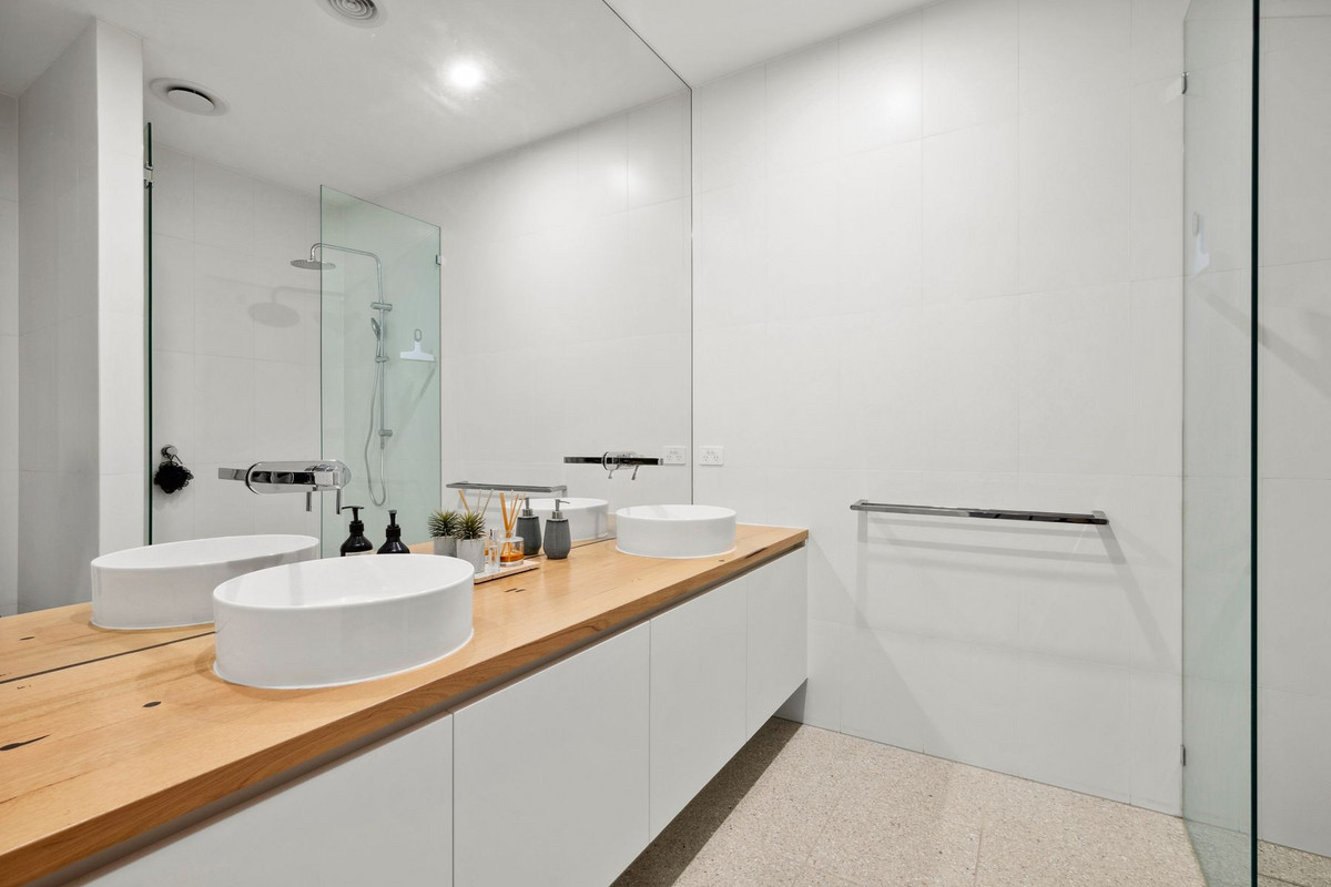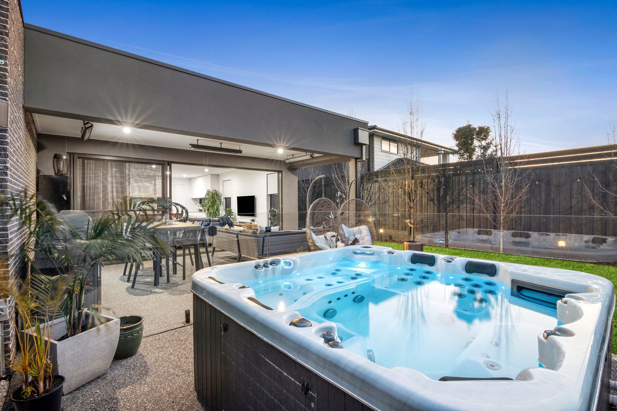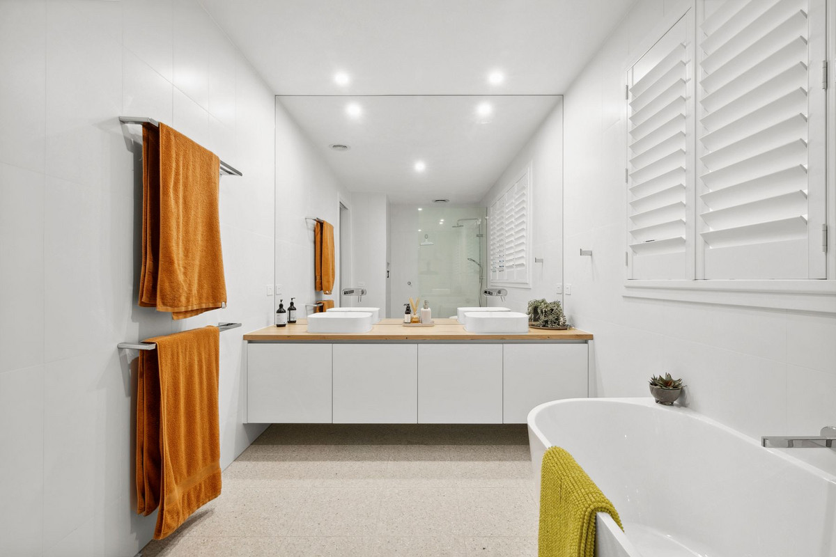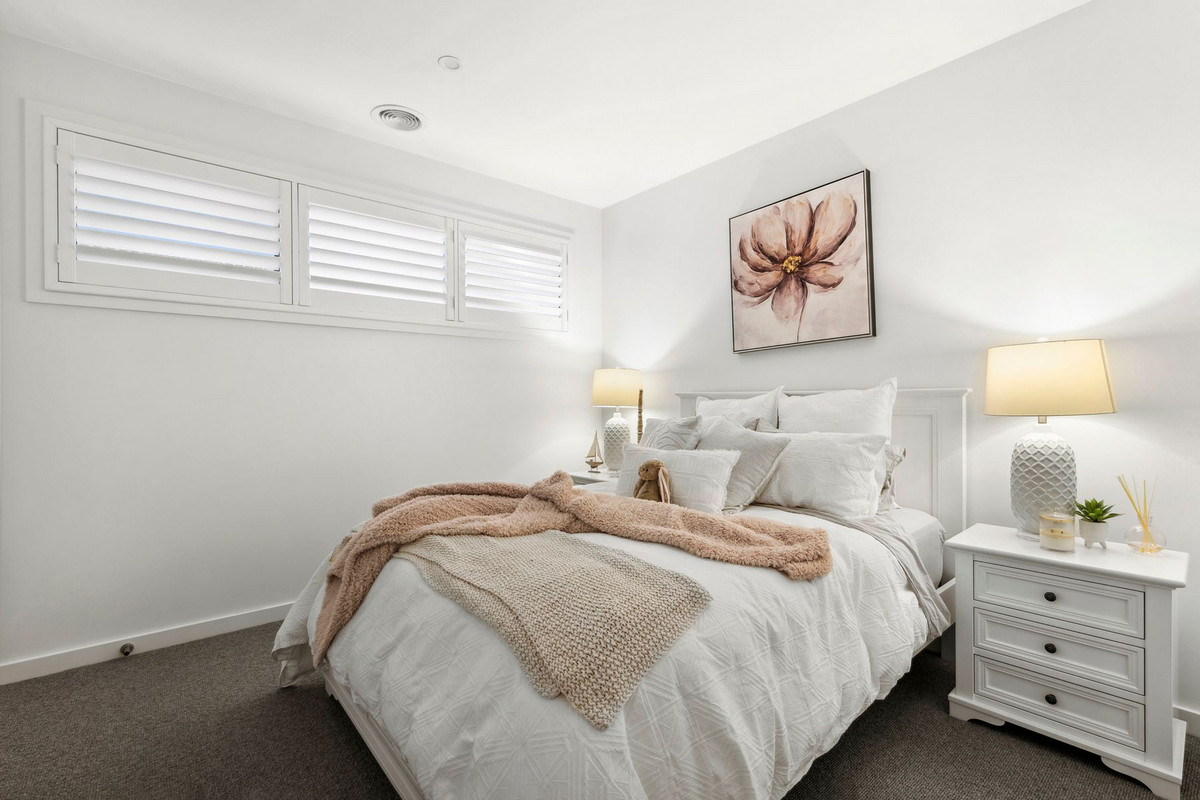 The north-facing undercover outdoor entertaining area seamlessly extends from the main living space through bi-fold doors, revealing a pristine private yard, manicured lawn, and an inviting outdoor spa. It's the perfect setting to enjoy a sun-kissed breakfast or an alfresco dinner with friends as the evening unfolds. The lower level also hosts the exquisite master suite, adorned with glamorous drapes, an en-suite with a twin vanity atop a timber counter, and a walk-in robe, creating a serene retreat.