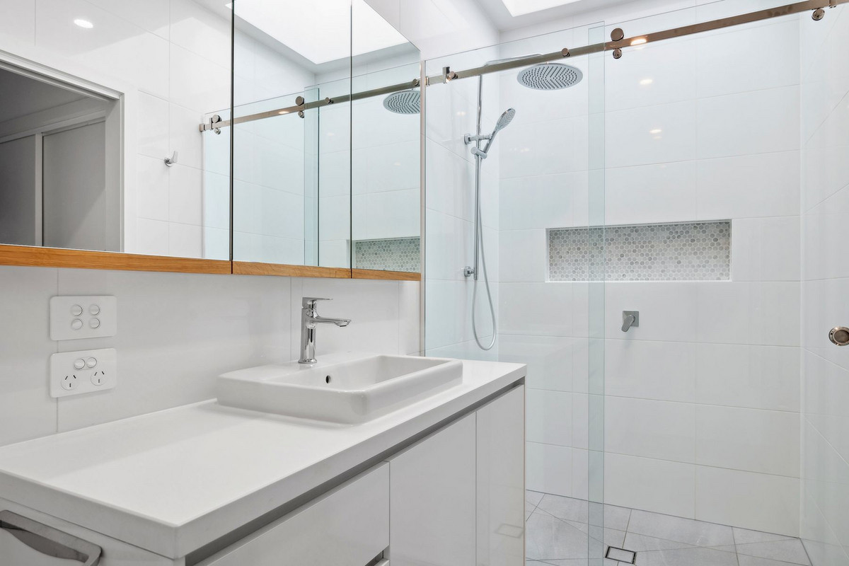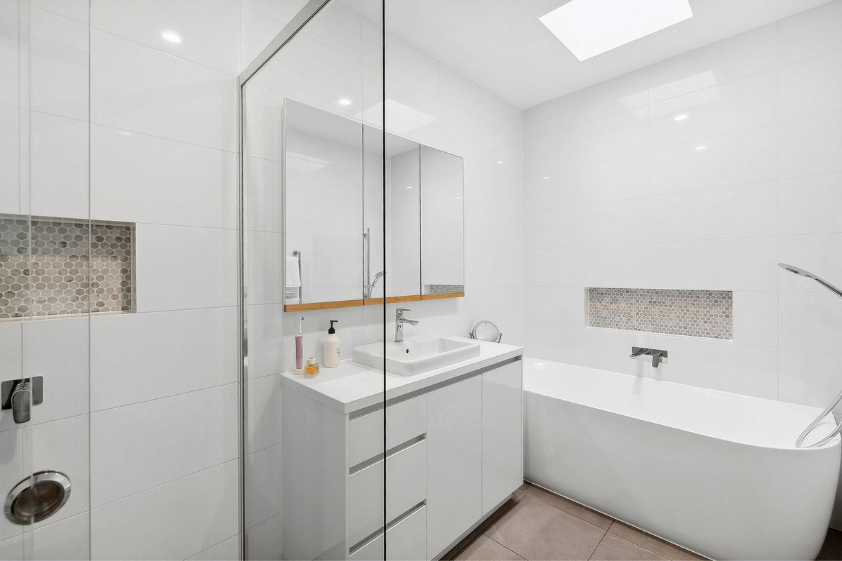 All three bedrooms are discreetly positioned off the hallway, with the master suite featuring built-in robes, walk-in robe, and a deluxe en-suite with floor-to-ceiling tiles and a skylight. The remaining bedrooms offer built-in robes and share a stunning family bathroom, also illuminated by its own skylight.