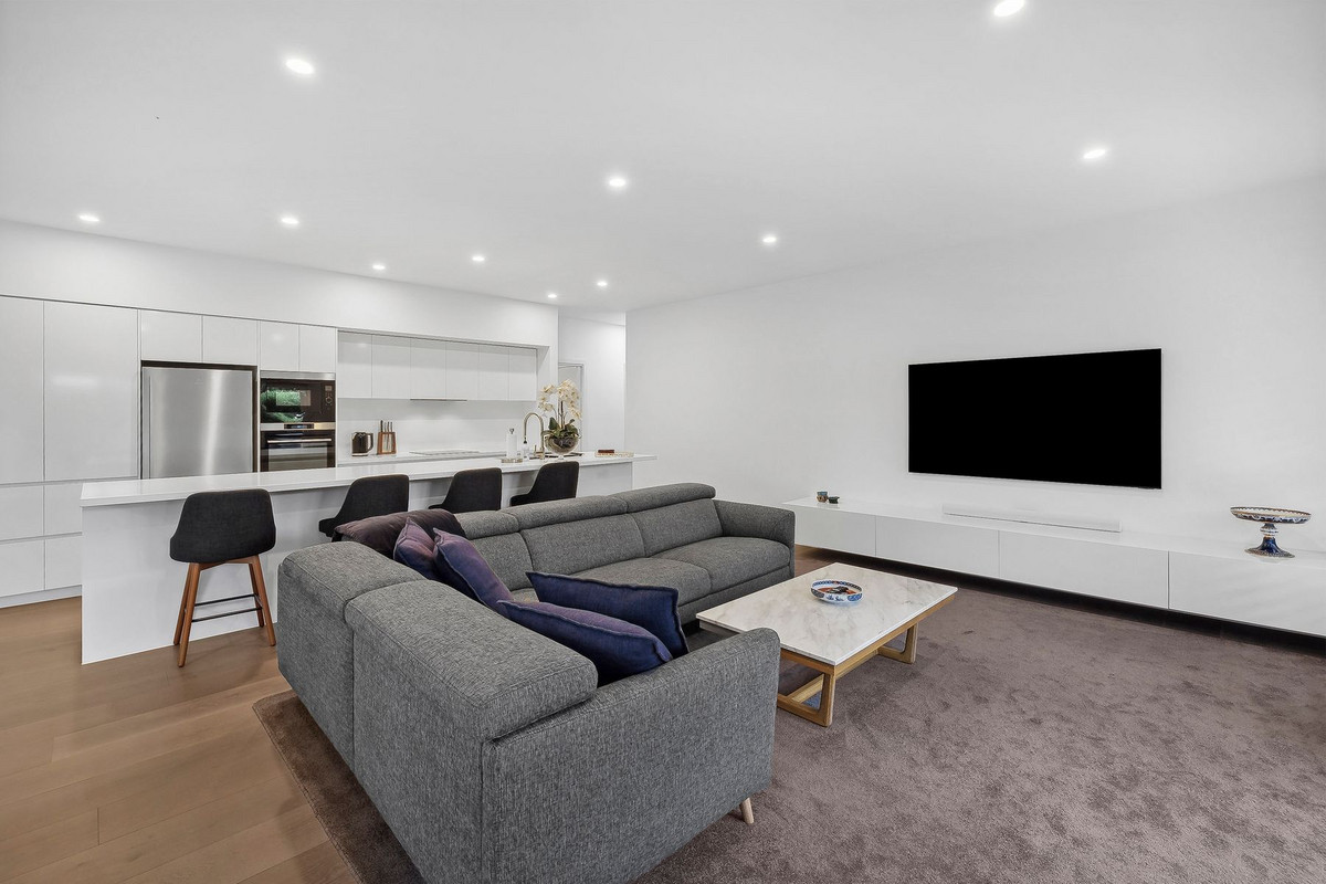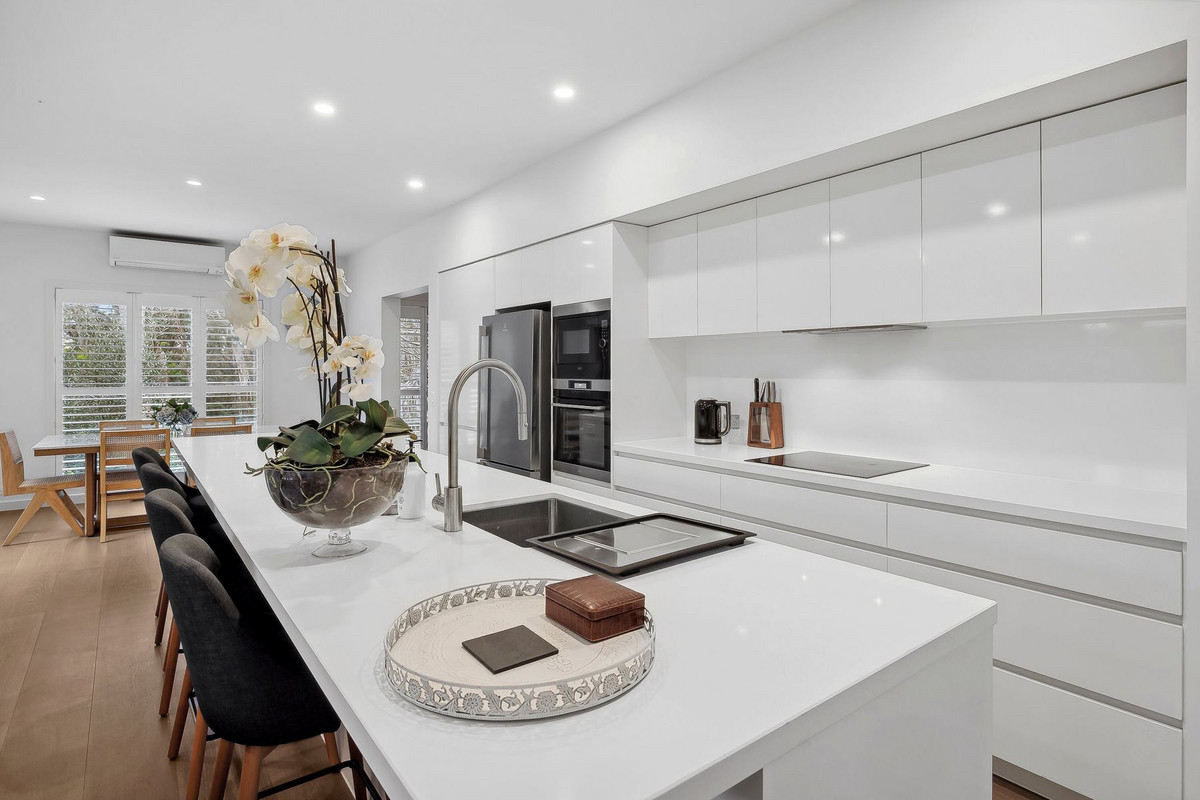 Upon entering, the home is bathed in natural light, unveiling a spacious open plan living, dining, and sophisticated kitchen boasting a large stone bench-top/breakfast bar, an induction cook-top, convection oven, dishwasher, pantry, and ample cupboard space.