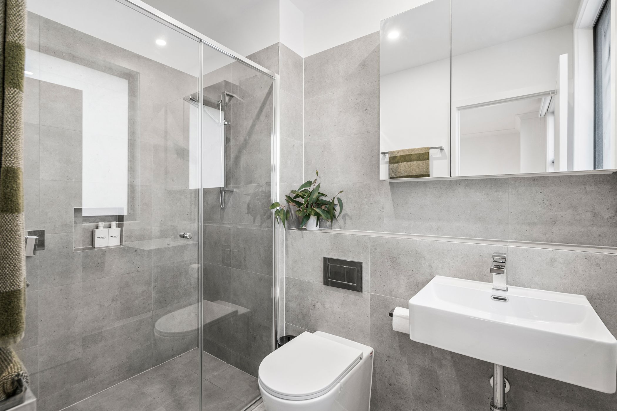 Master Suite: Built-in robe and ensuite with wall-hung basin, eye-level storage, toilet and oversized shower with single rail head and niche. Carpet, downlights and window with privacy tint and roller blind.