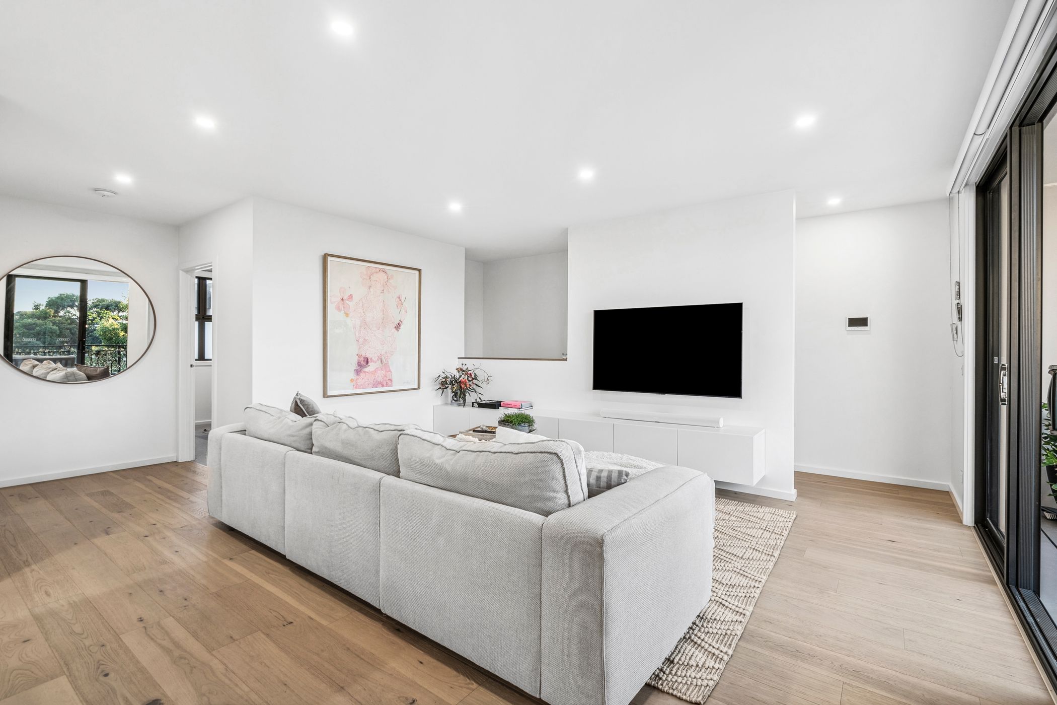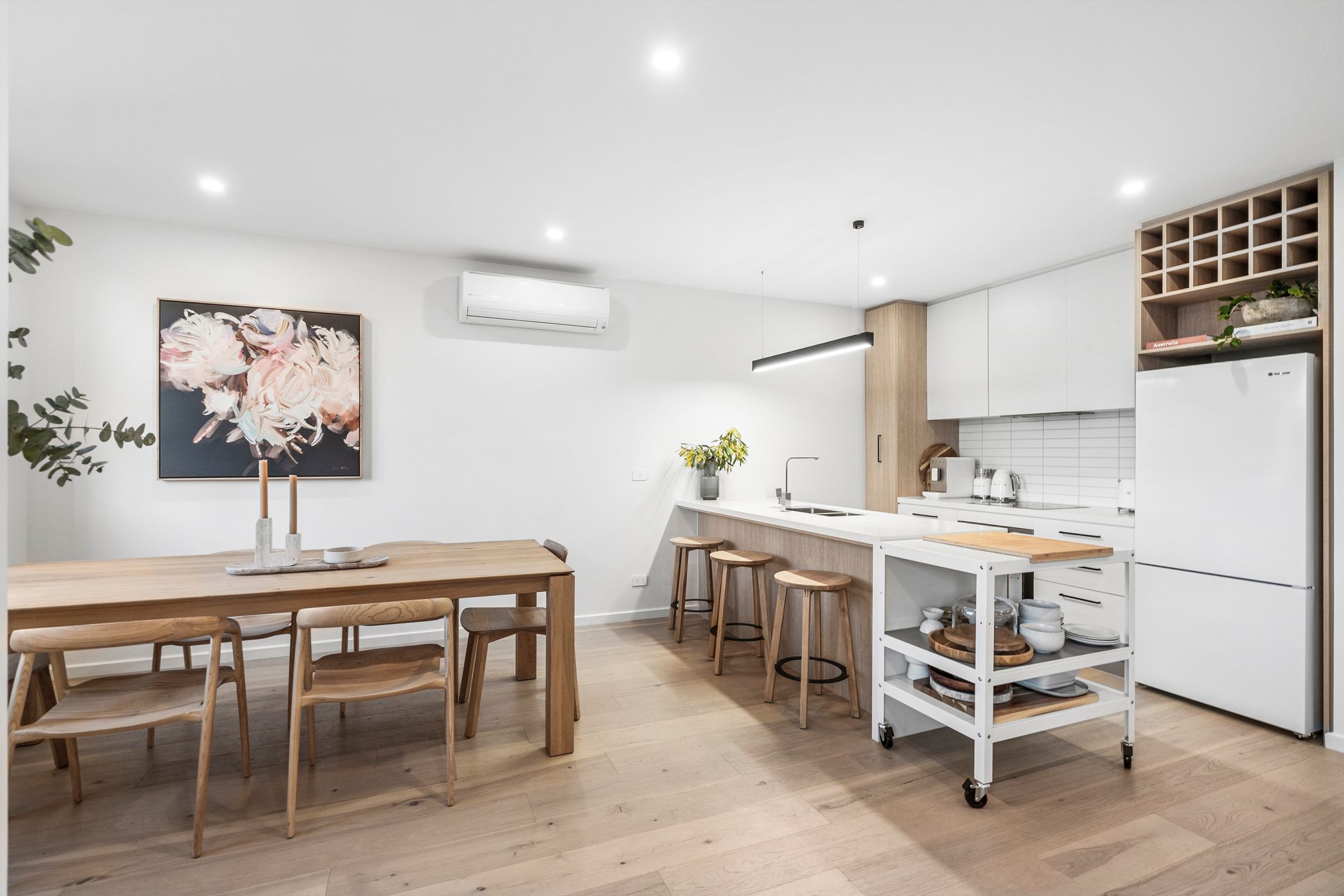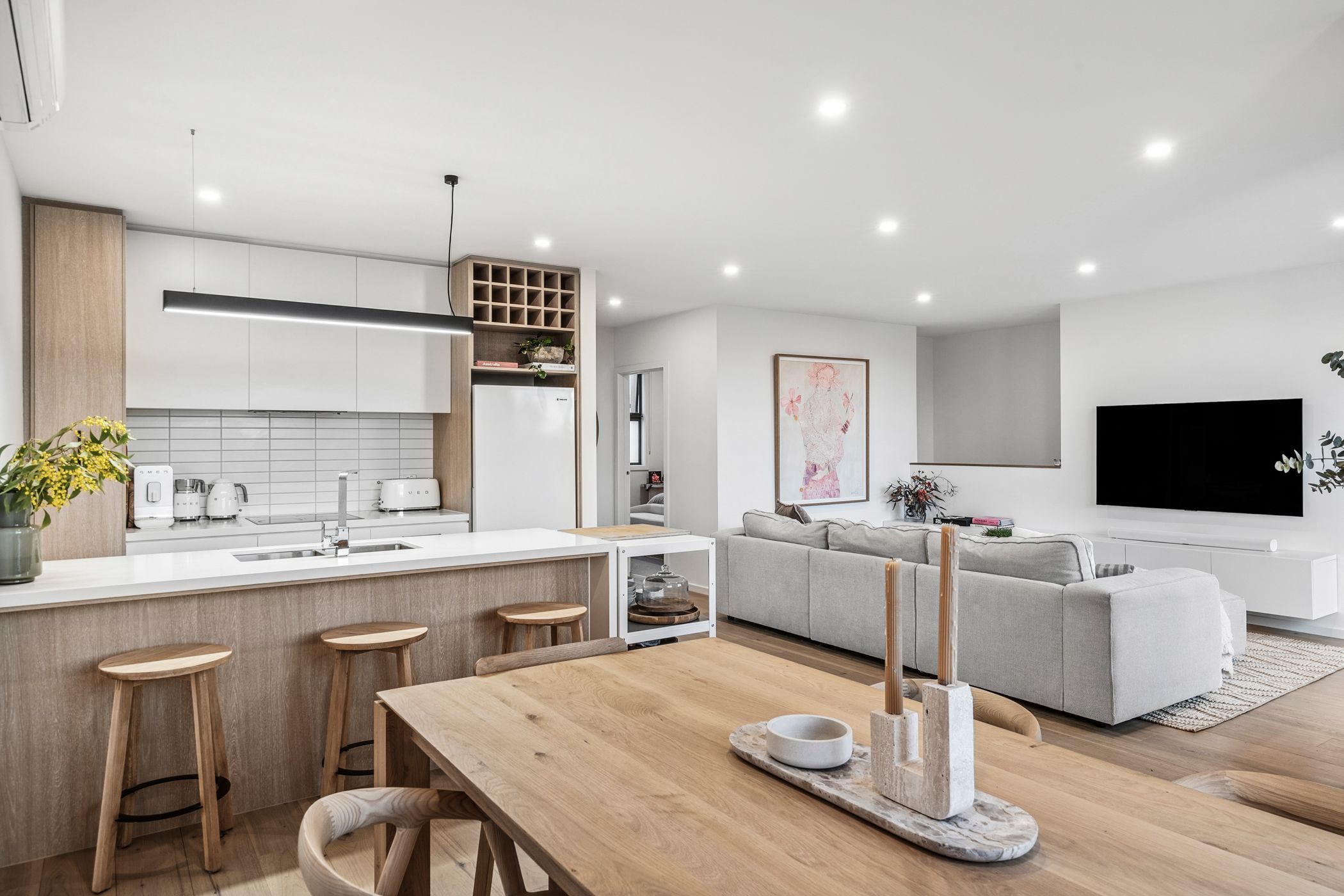 Open Plan Living/Dining: Chic engineered timber floors, floating entertainment unit, full-height glass sliding door with north-facing balcony access, dining window, roller blinds, downlights and split-system heating and cooling unit.