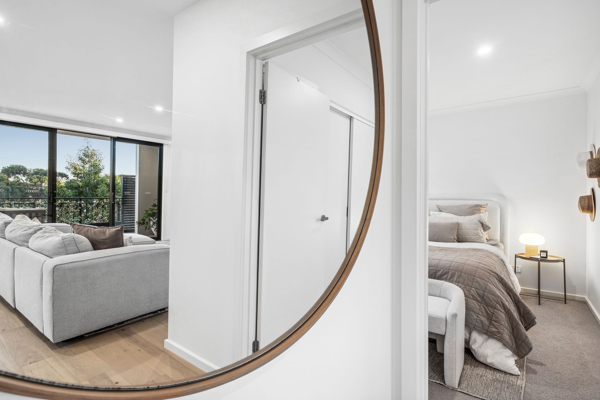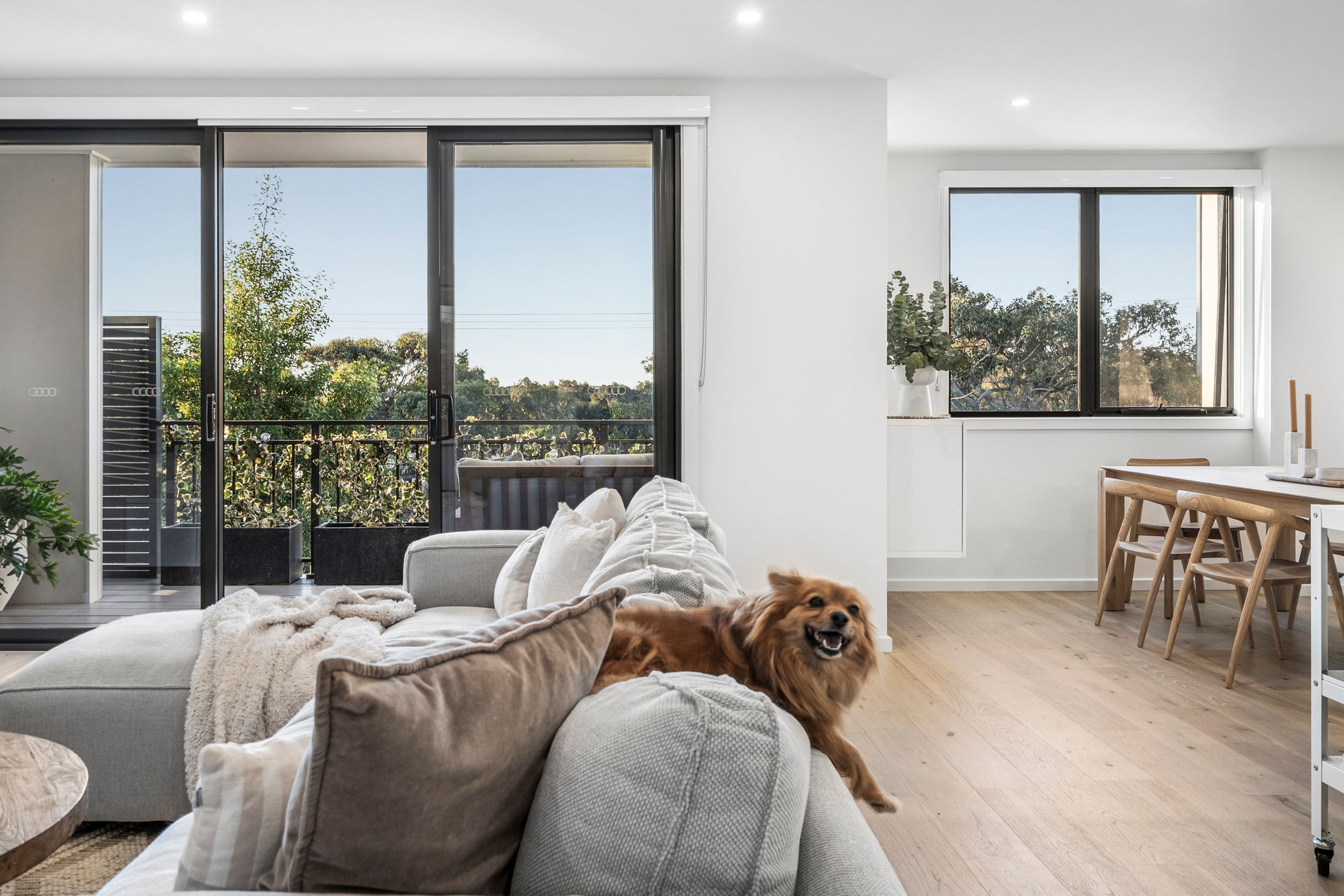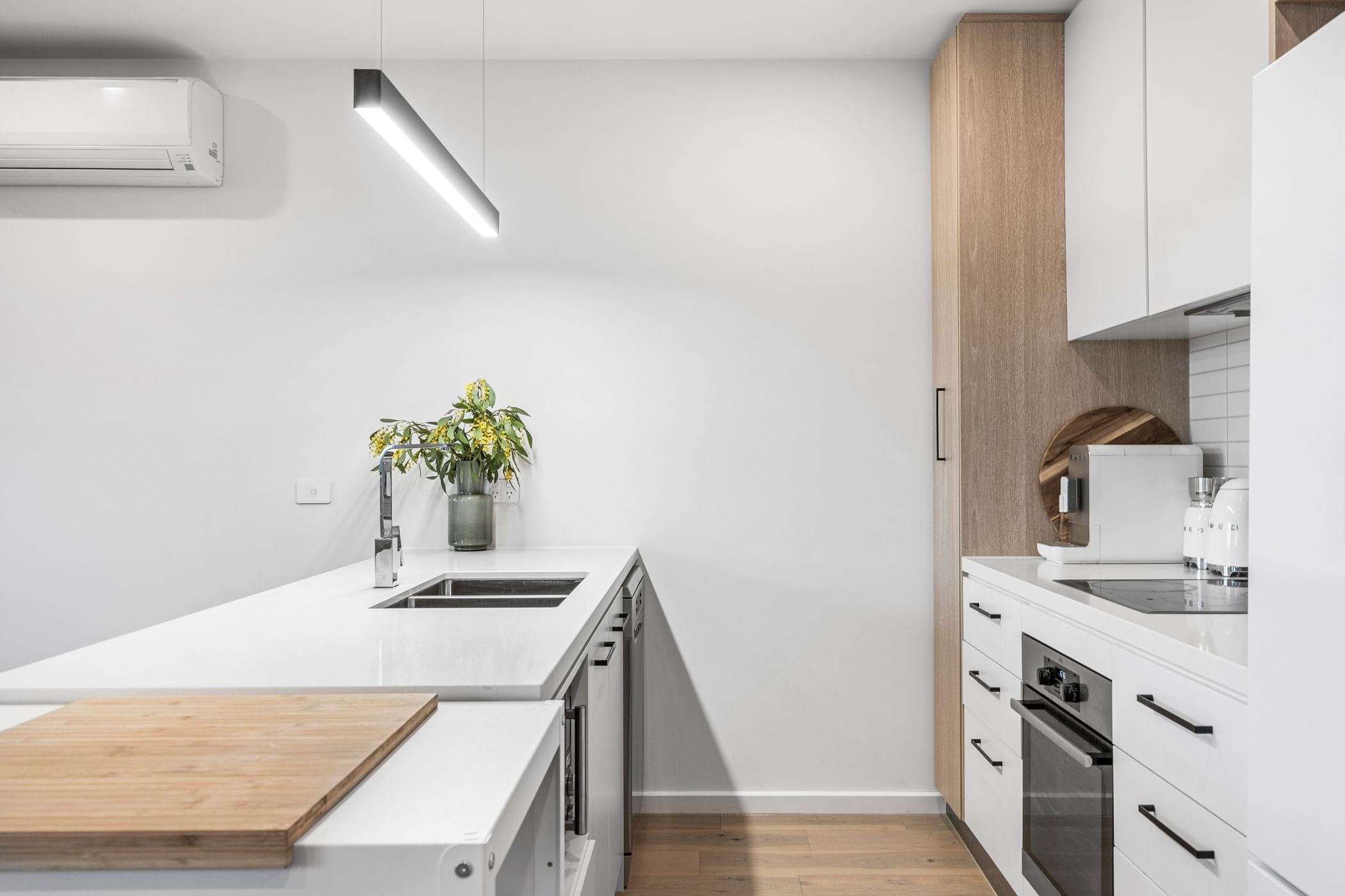 Open Plan Living/Dining: Chic engineered timber floors, floating entertainment unit, full-height glass sliding door with north-facing balcony access, dining window, roller blinds, downlights and split-system heating and cooling unit.