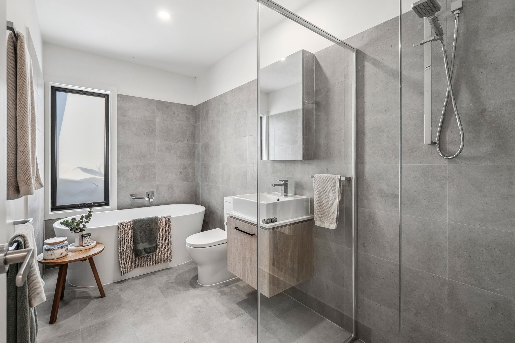 Main Bathroom: Freestanding tub, single vanity with underbench storage, eye-level storage, large shower with single rail head, toilet and towel rails.