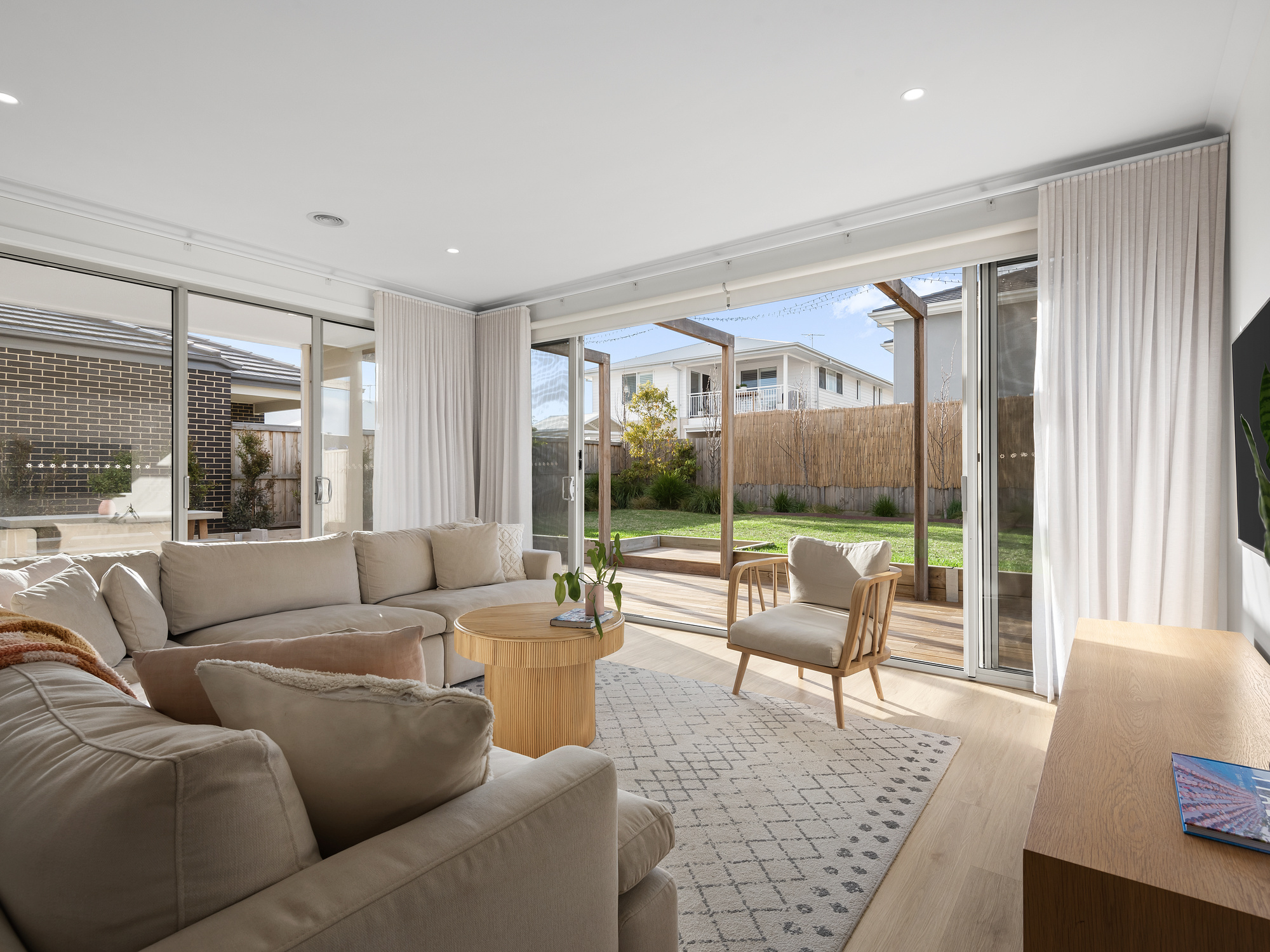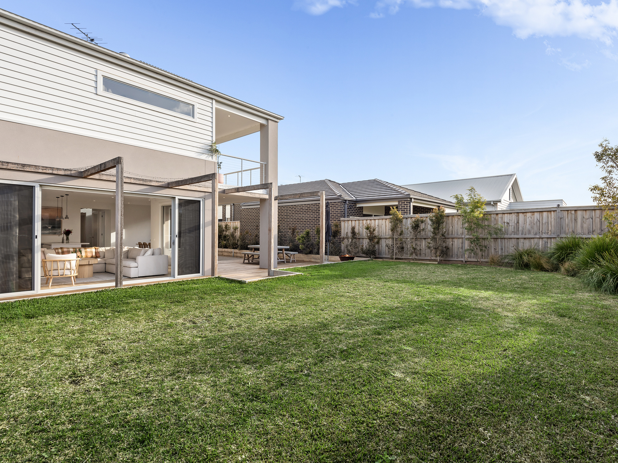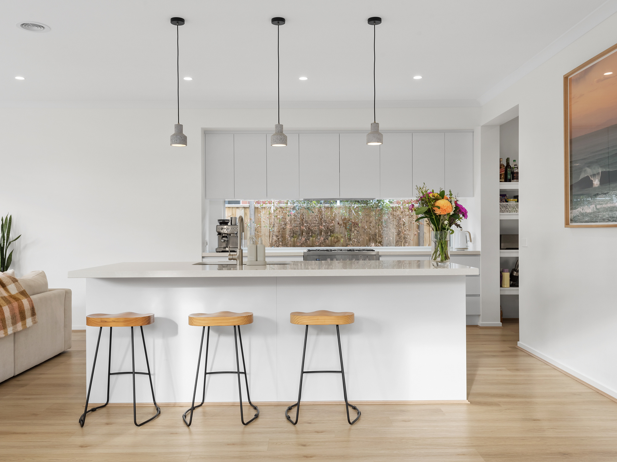Constructed with an eye for detail and a flair for flowing design to perfectly complement family living, this home creates space for everyone but with a lovely sense of connection throughout. A large multipurpose area with grand double doors at the front of the home works well as a bedroom or rumpus room. The remainder of the ground floor is focused on living and entertaining with a sprawling kitchen, dining and living hub looking out to the outdoor deck and garden beyond. Warm engineered oak floors, coastal hues and an abundance of natural light bounces off every surface.
