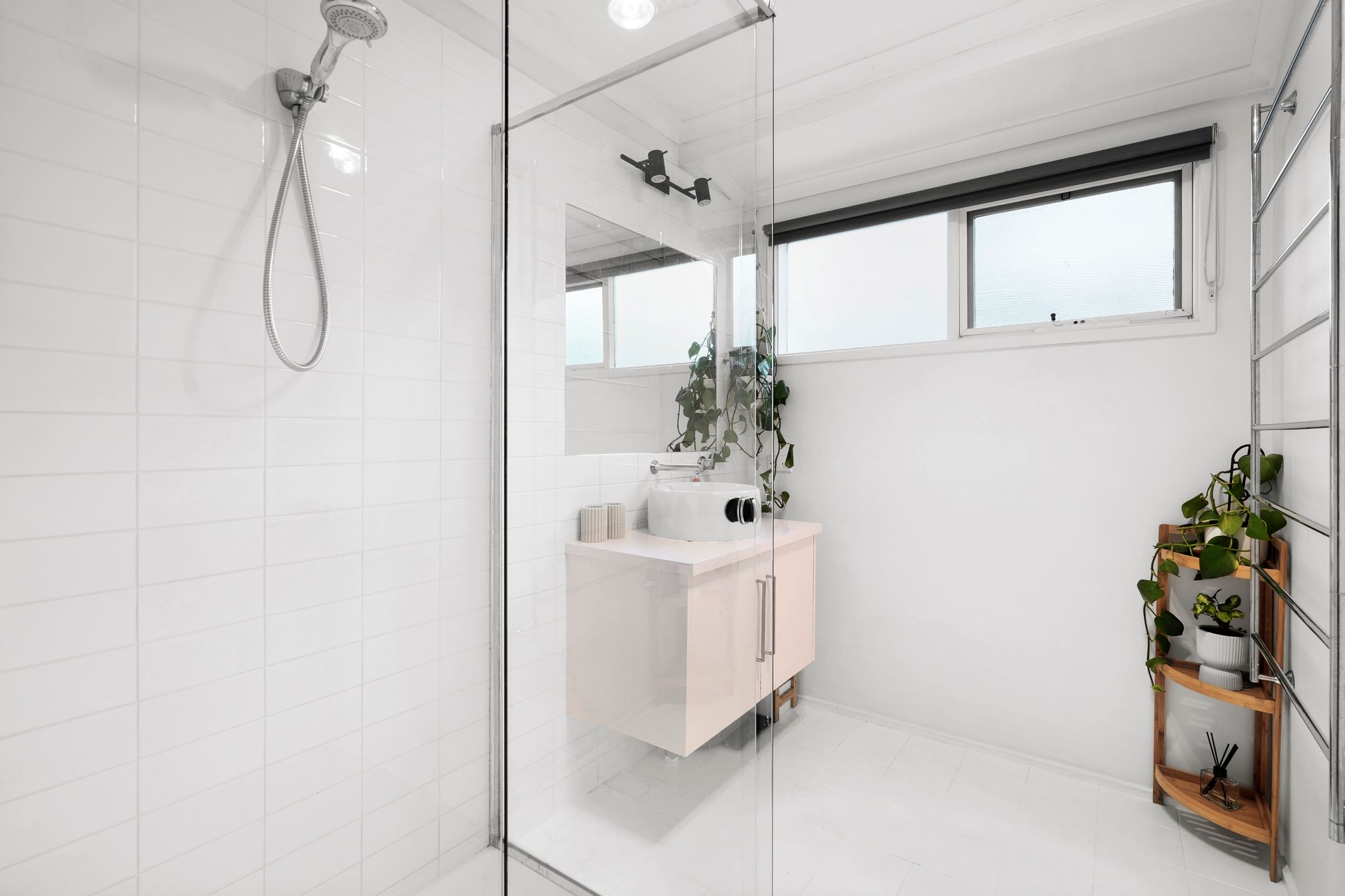 Main Bathroom: Oversized shower, single vanity with underbench storage, large towel rail, highlight window with privacy glass and roller blind. Separate toilet.