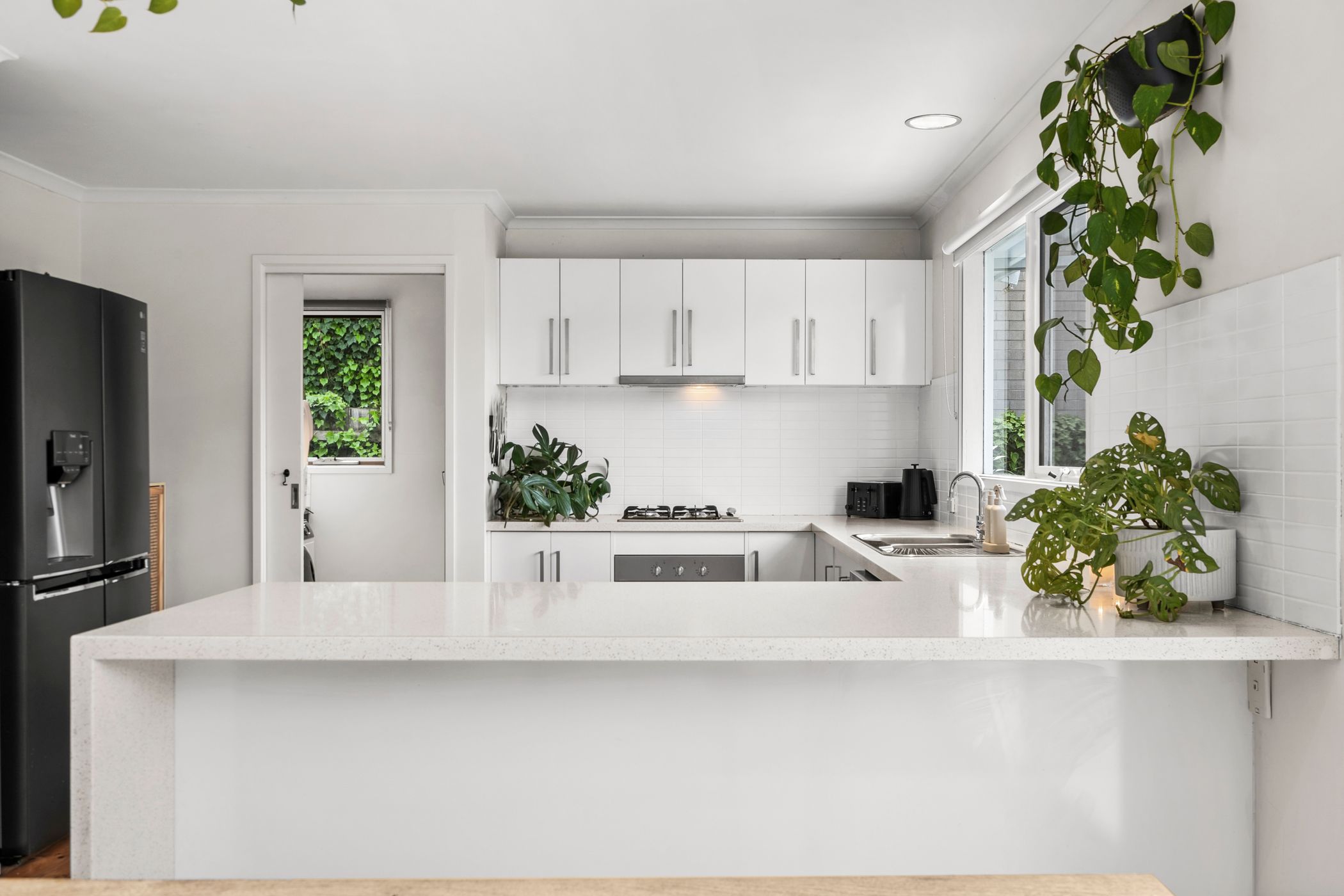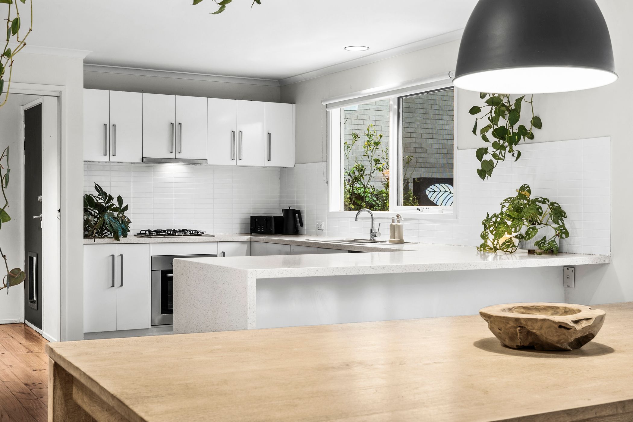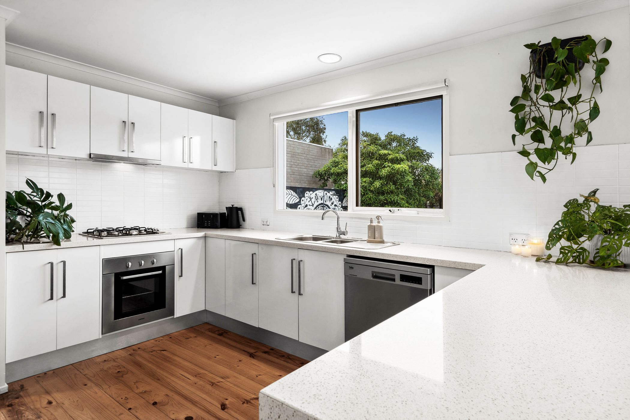 Considered: Kitchen: Stone waterfall benchtop, LOFRA 600mm underbench oven, 600mm gas cooktop, stainless steel dishwasher, large rear-facing window, tiled splashback, solid timber floors, and ample cabinetry including overheads.