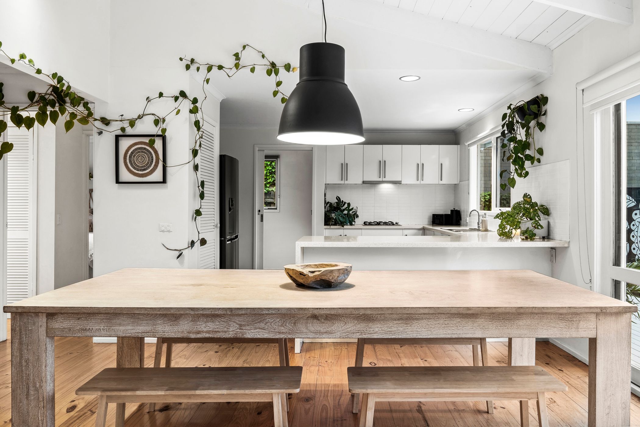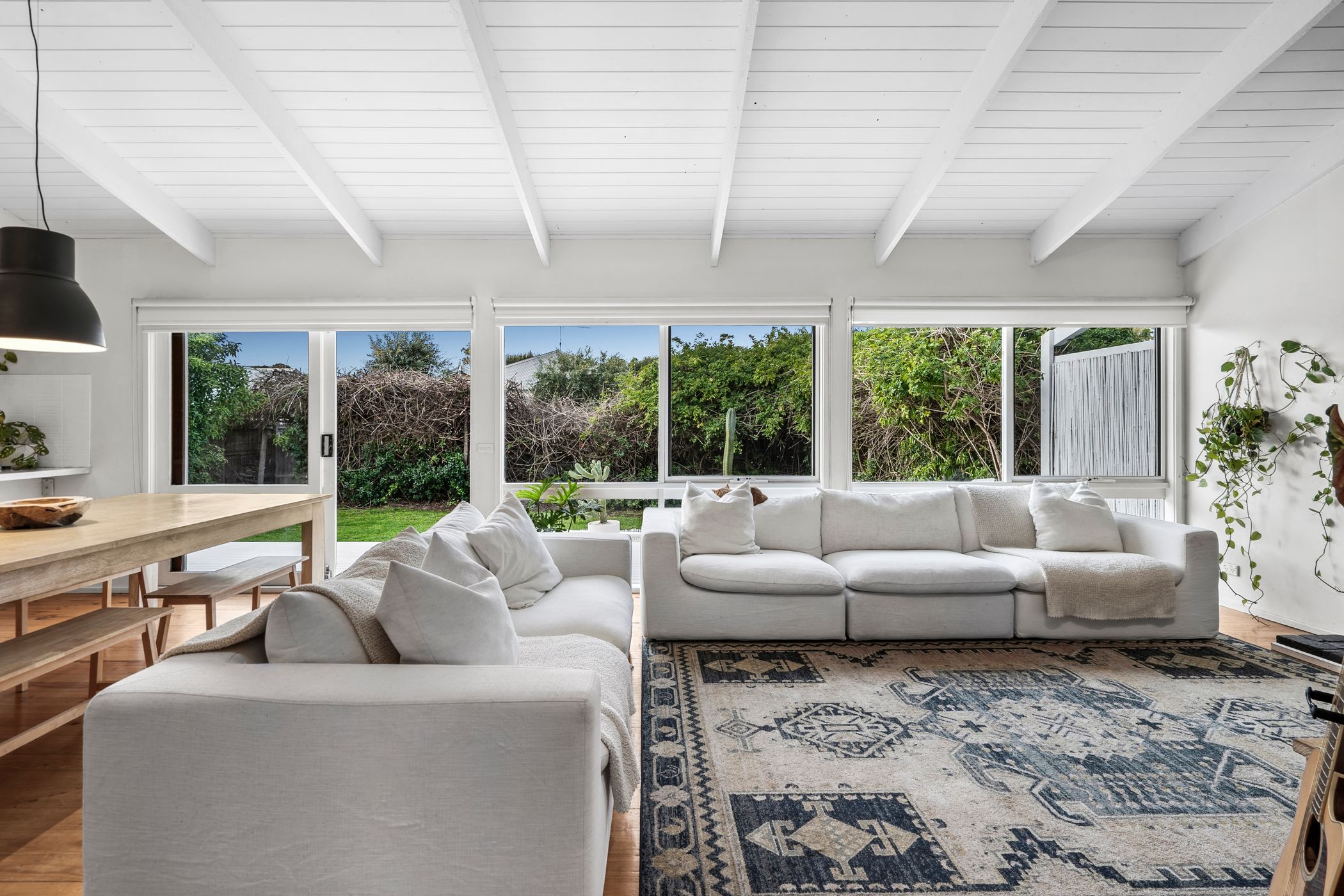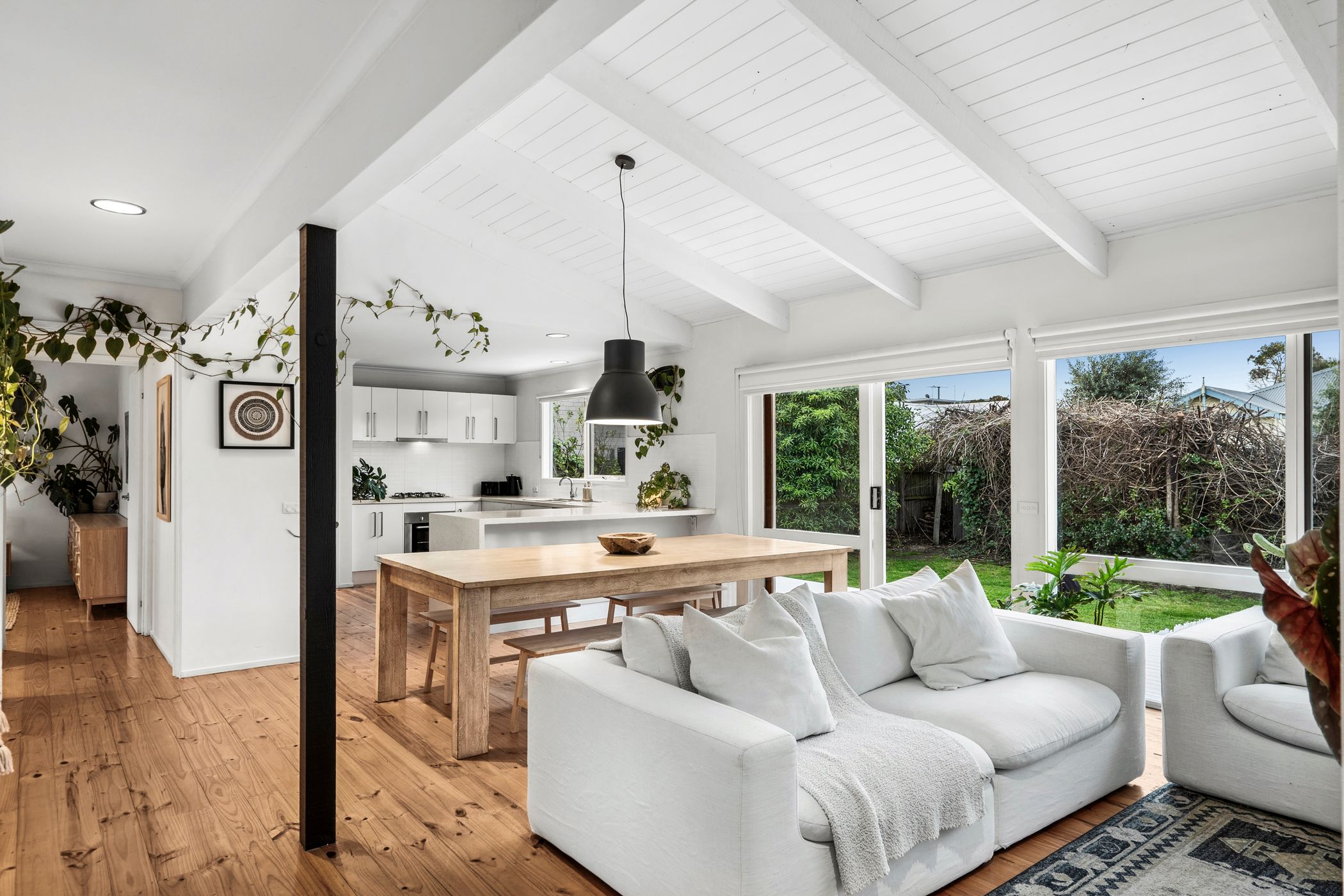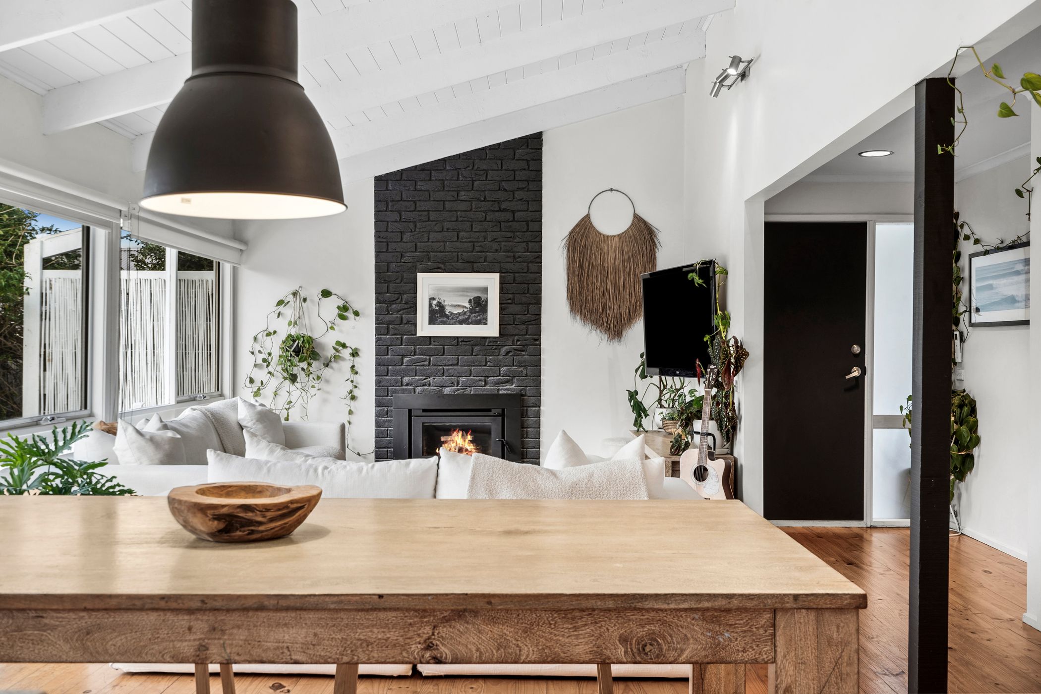 Open Living/Dining: Solid timber floors, raked ceiling with exposed beams, painted brick hearth with solid wood heater, a wall of rear-facing windows and a feature pendant light.