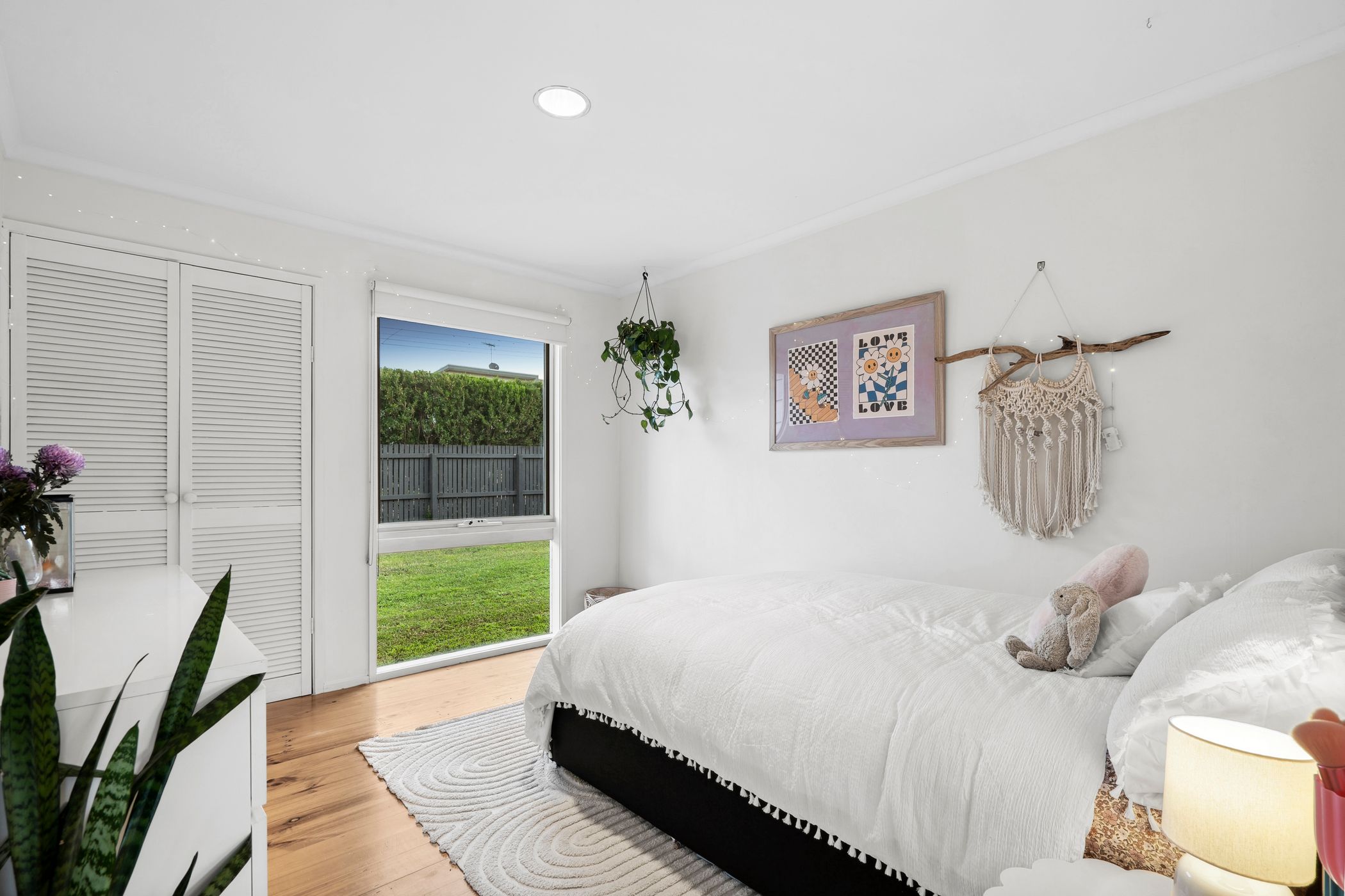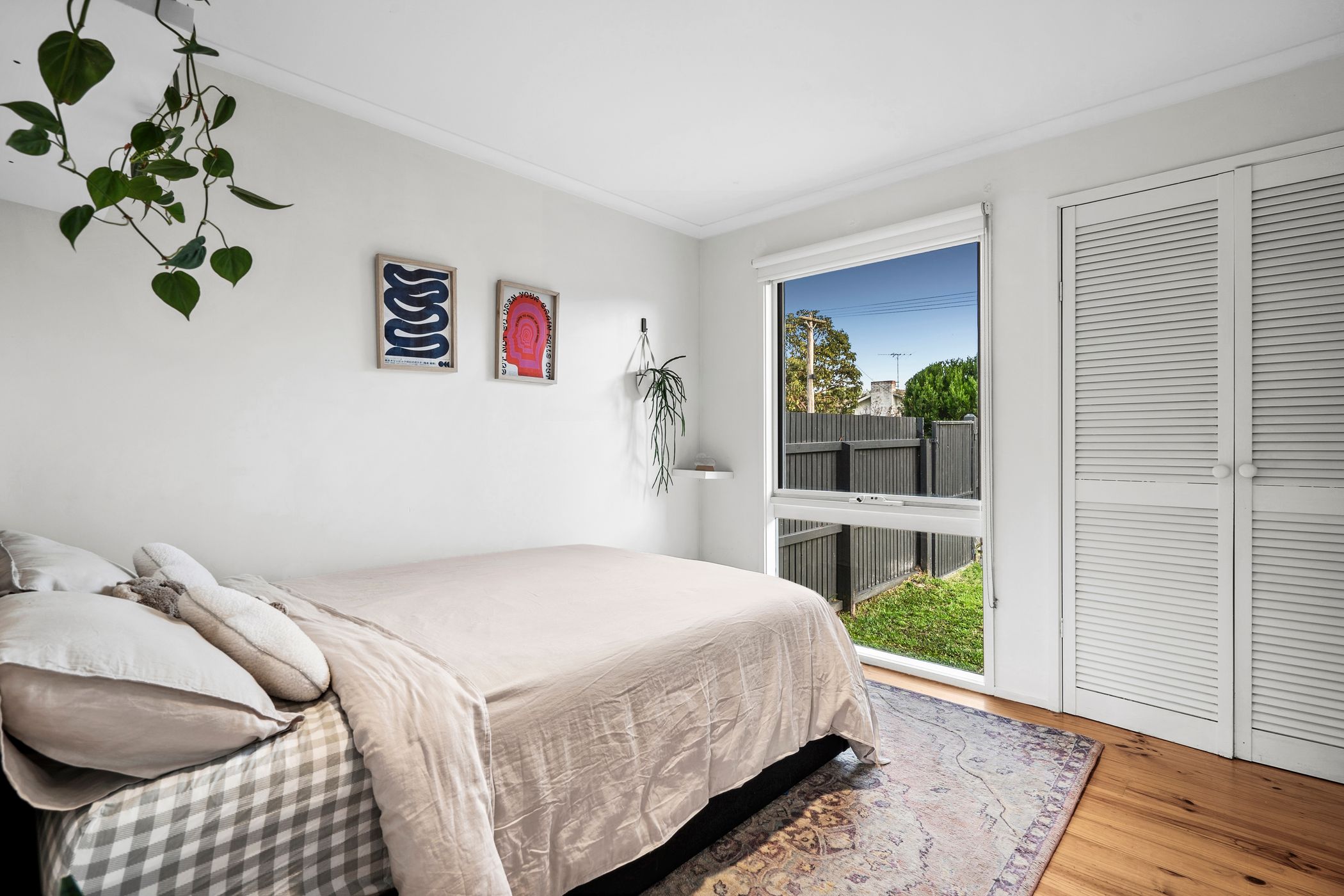 Master Suite: Solid timber floors, built-in robes, and window with roller blind.