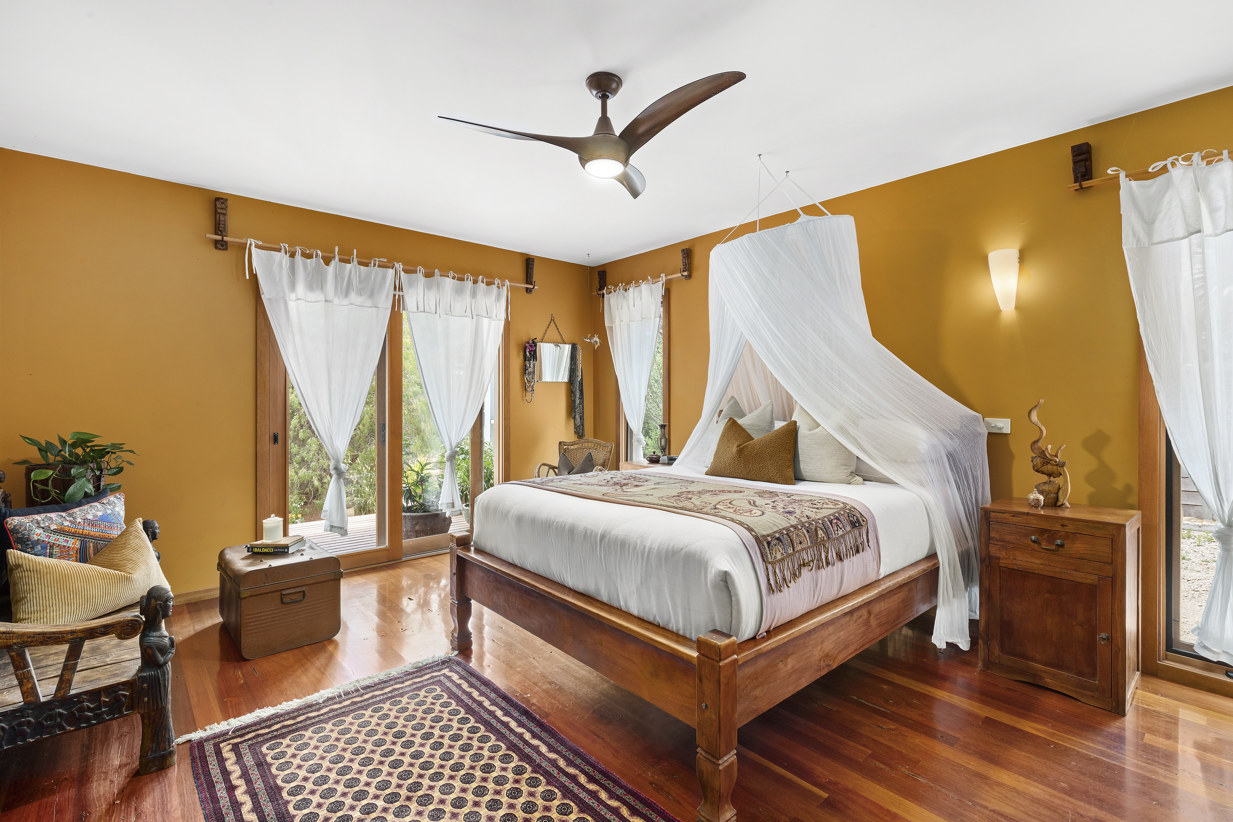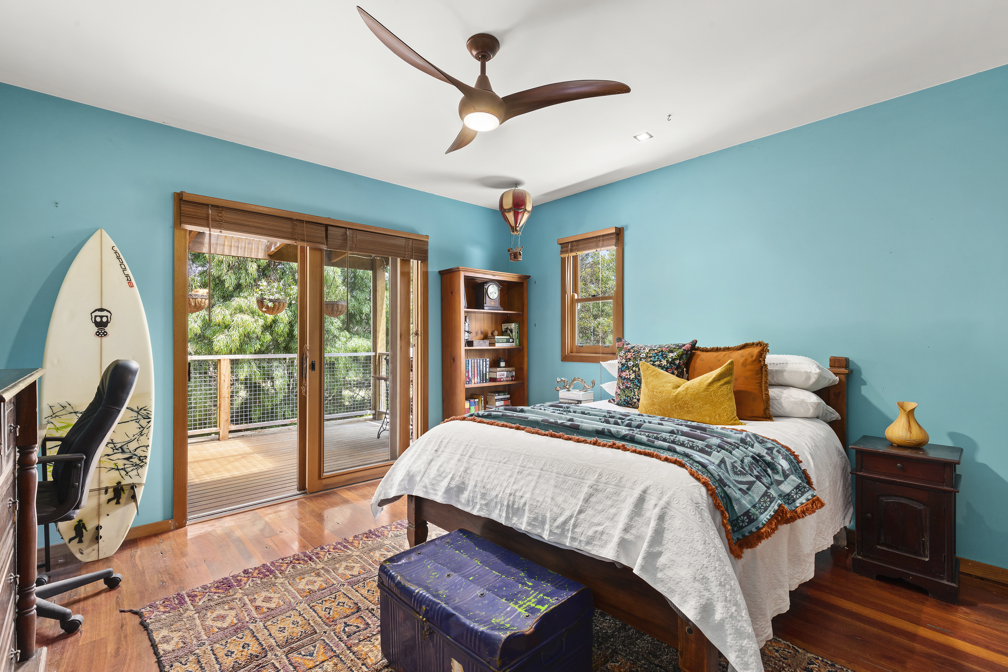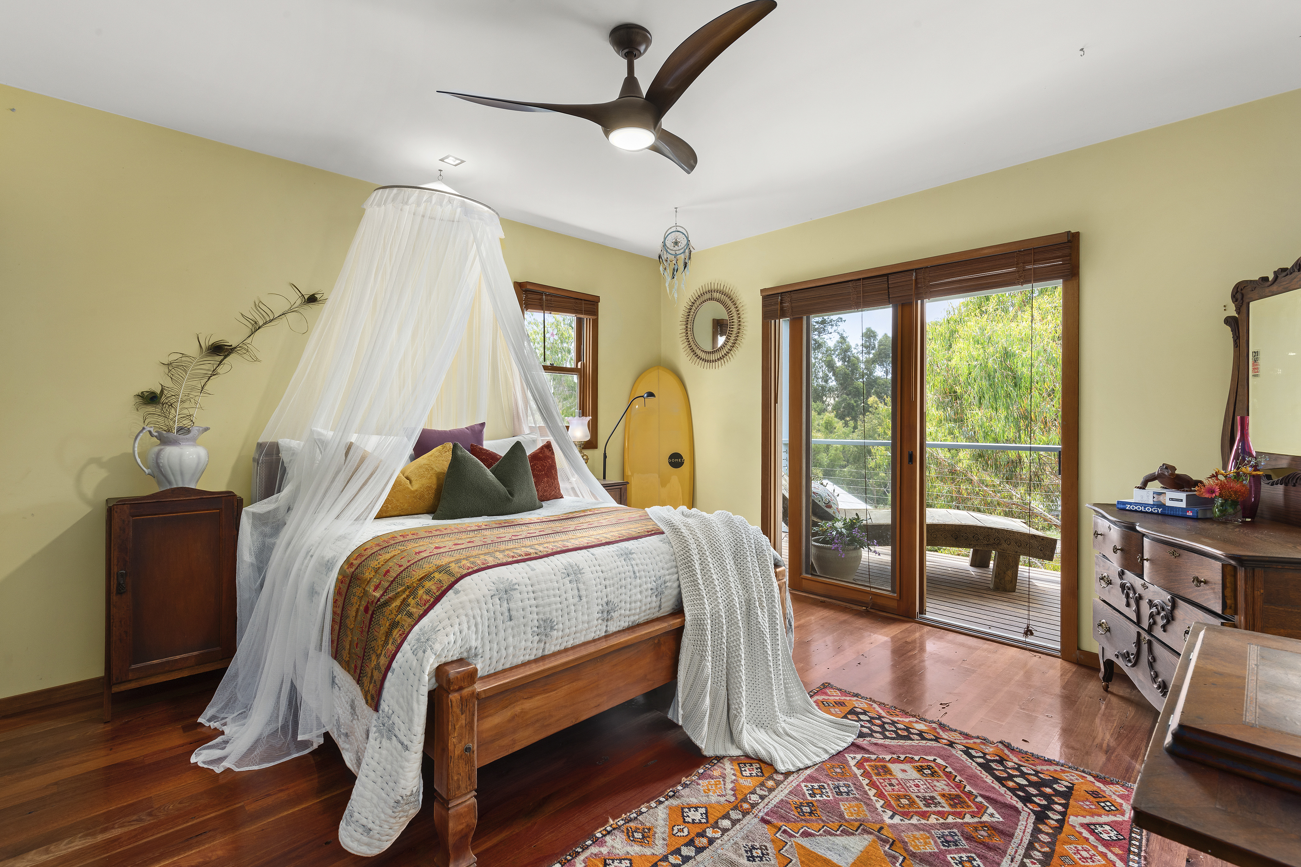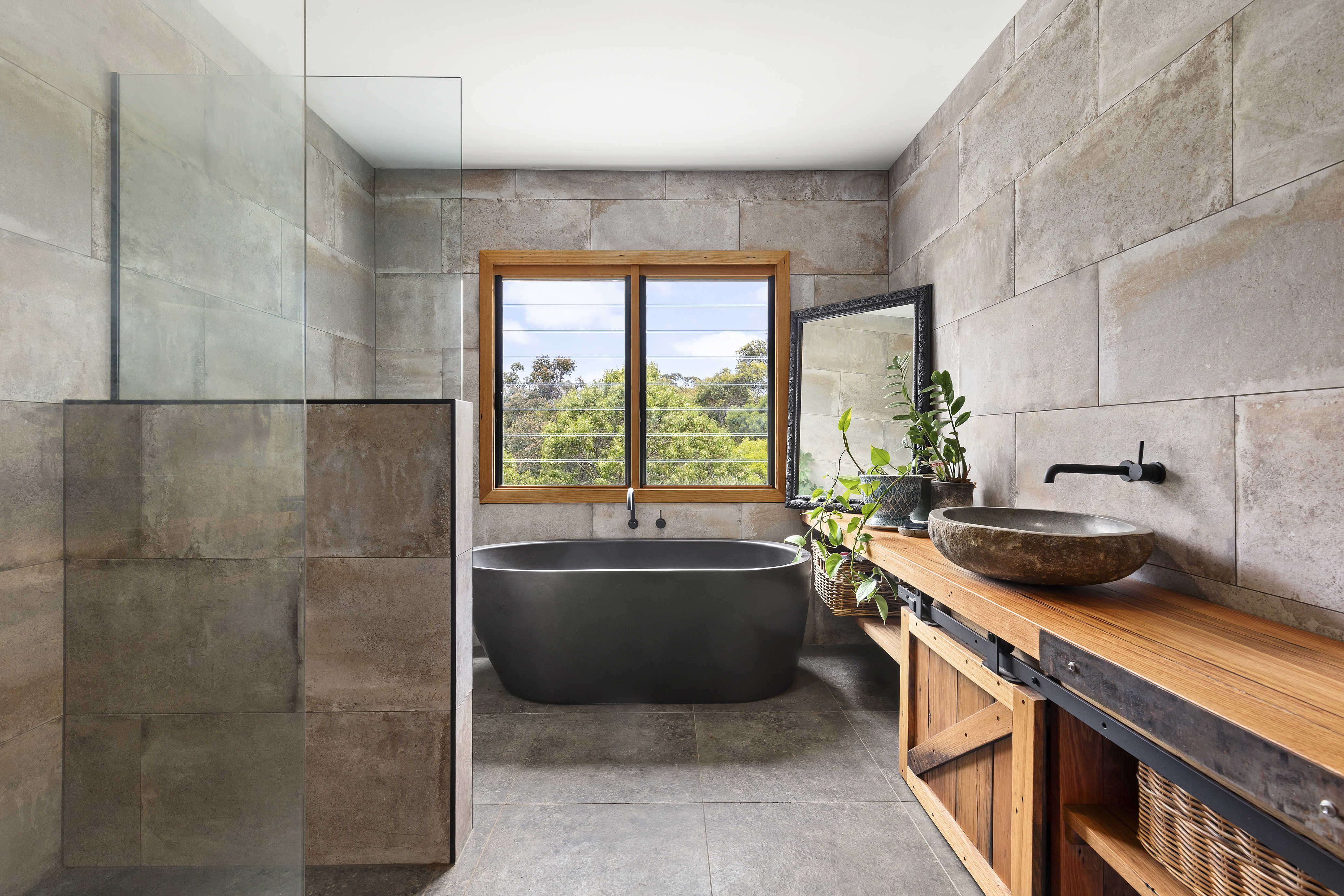 -Primary suite with custom door handles, hand carved doors, walk in robe, stunning ensuite and direct access to veranda -Two further bedrooms with leafy outlooks and direct access to verandahs -Family bathroom with stunning, green stone carved basin, recycled messmate cabinetry, walk-in shower and luxurious concrete bath set in front of a picture window
