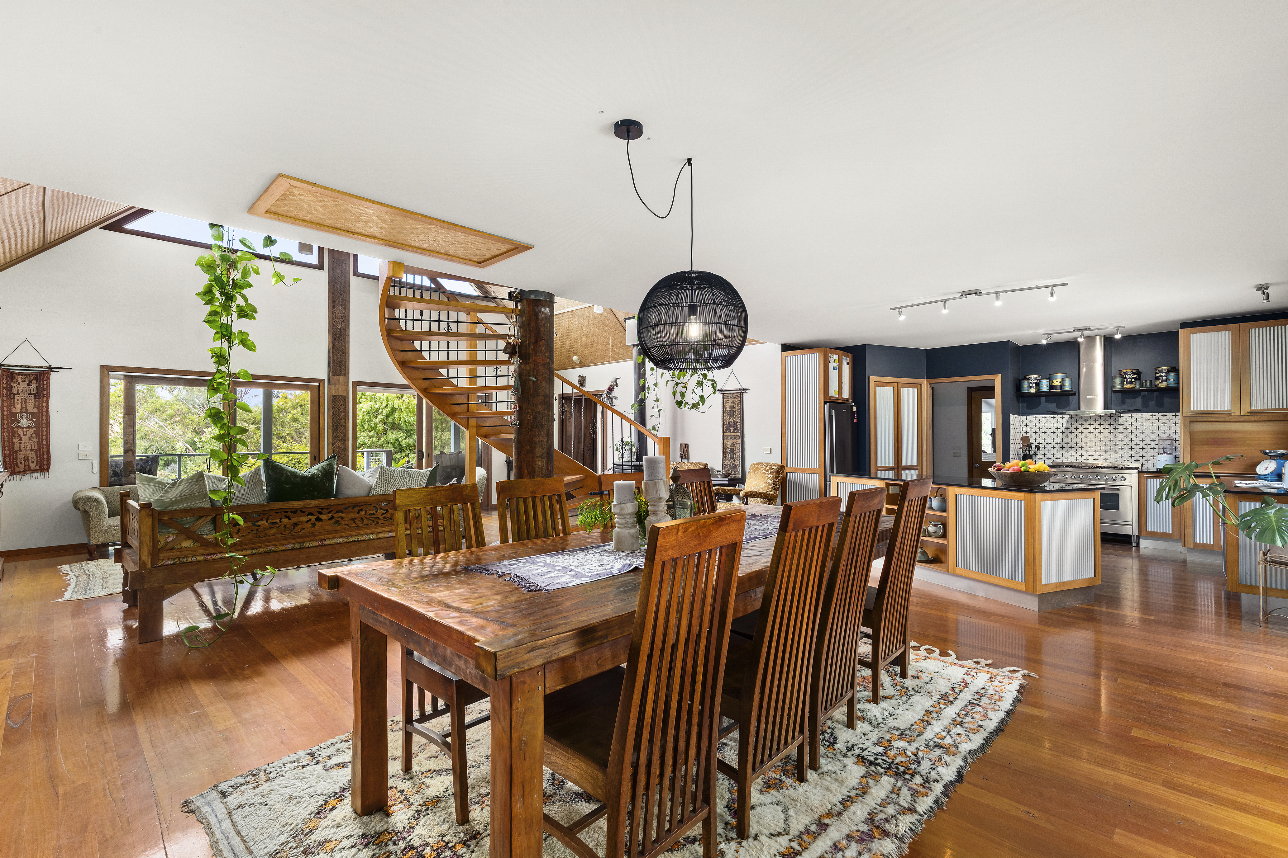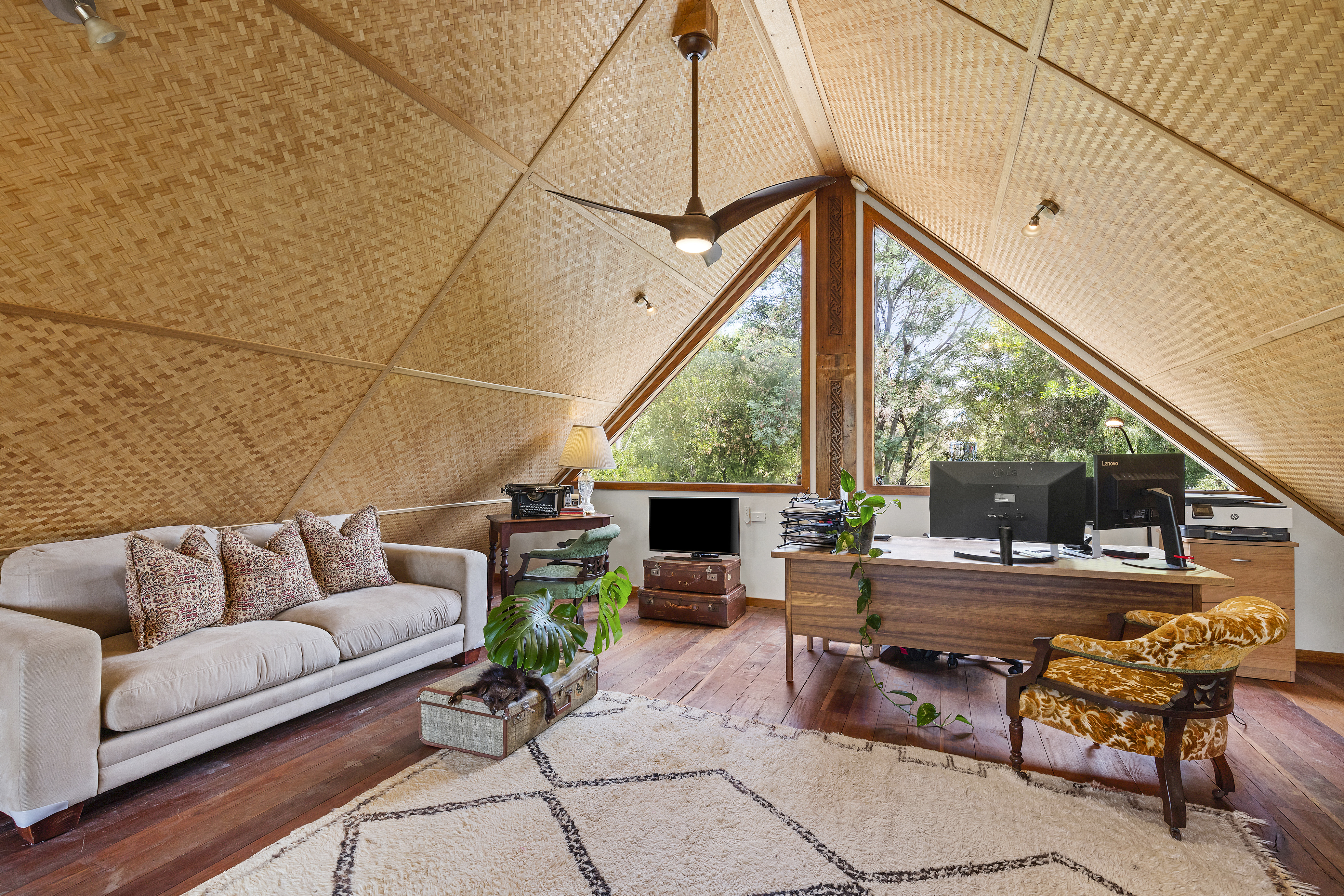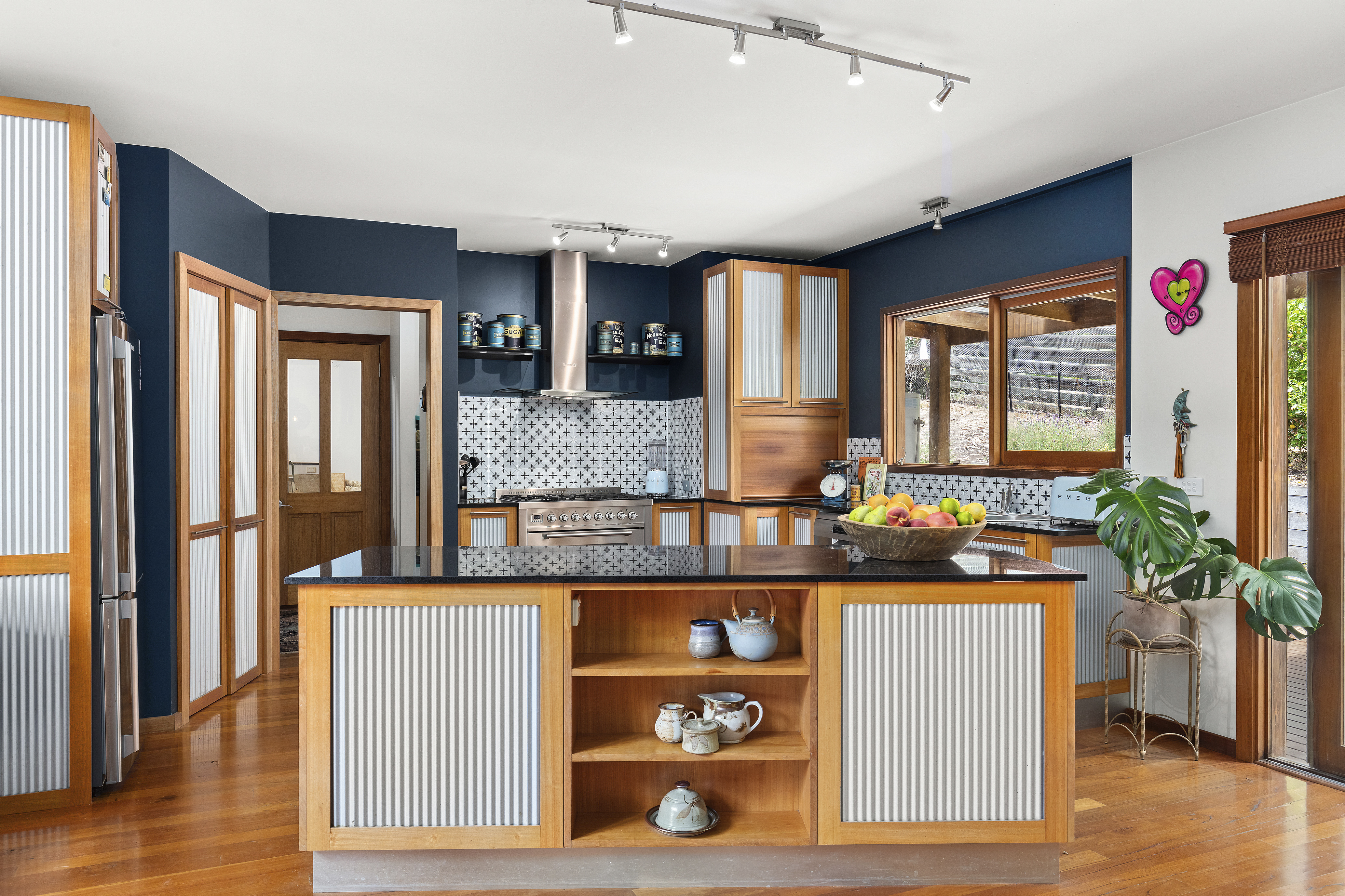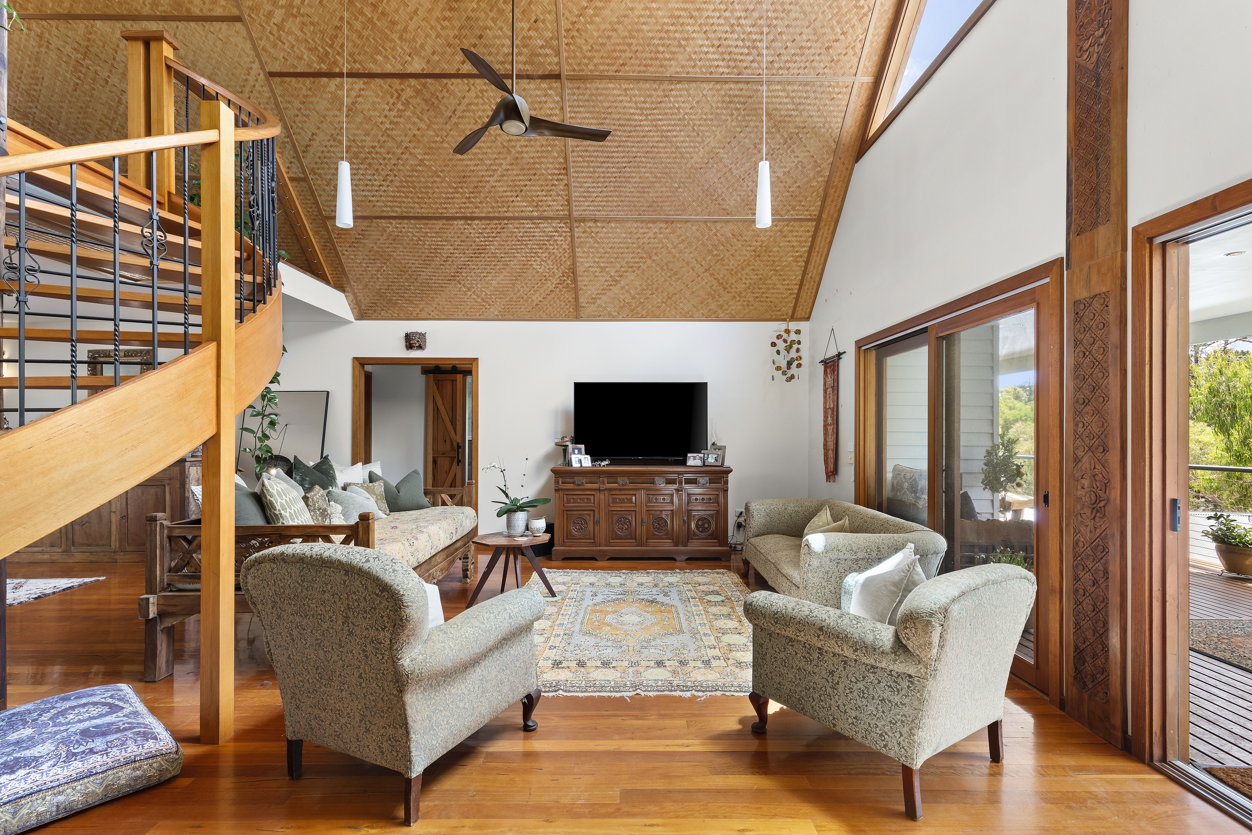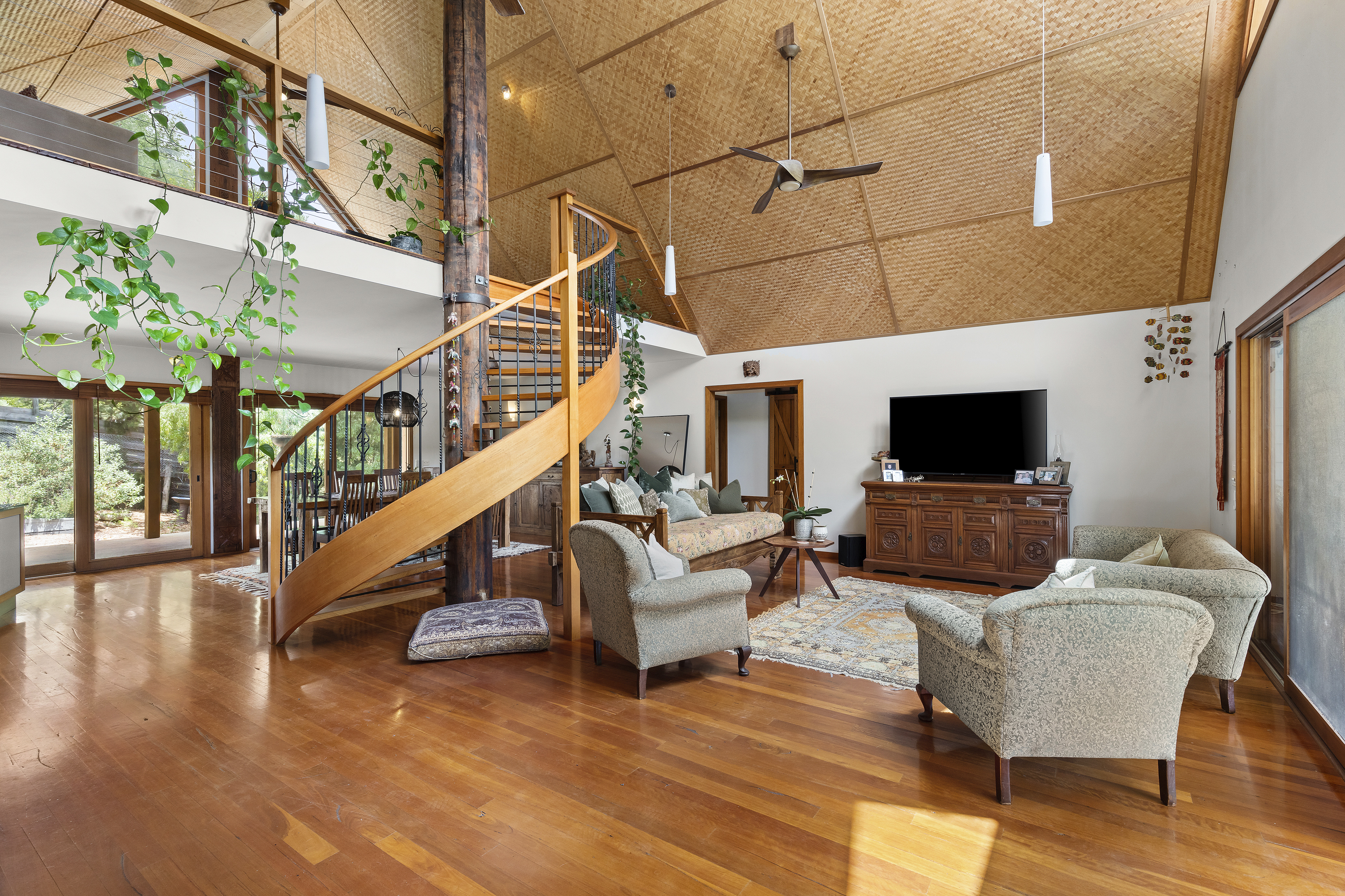 -Blackbutt staircase winds around the pole elevating you to the loft, ideal as a retreat or home office -Kitchen with ripple iron and timber cabinetry, granite benchtops and gas cooking -One-of-a-kind hand carved internal doors and feature timber panels