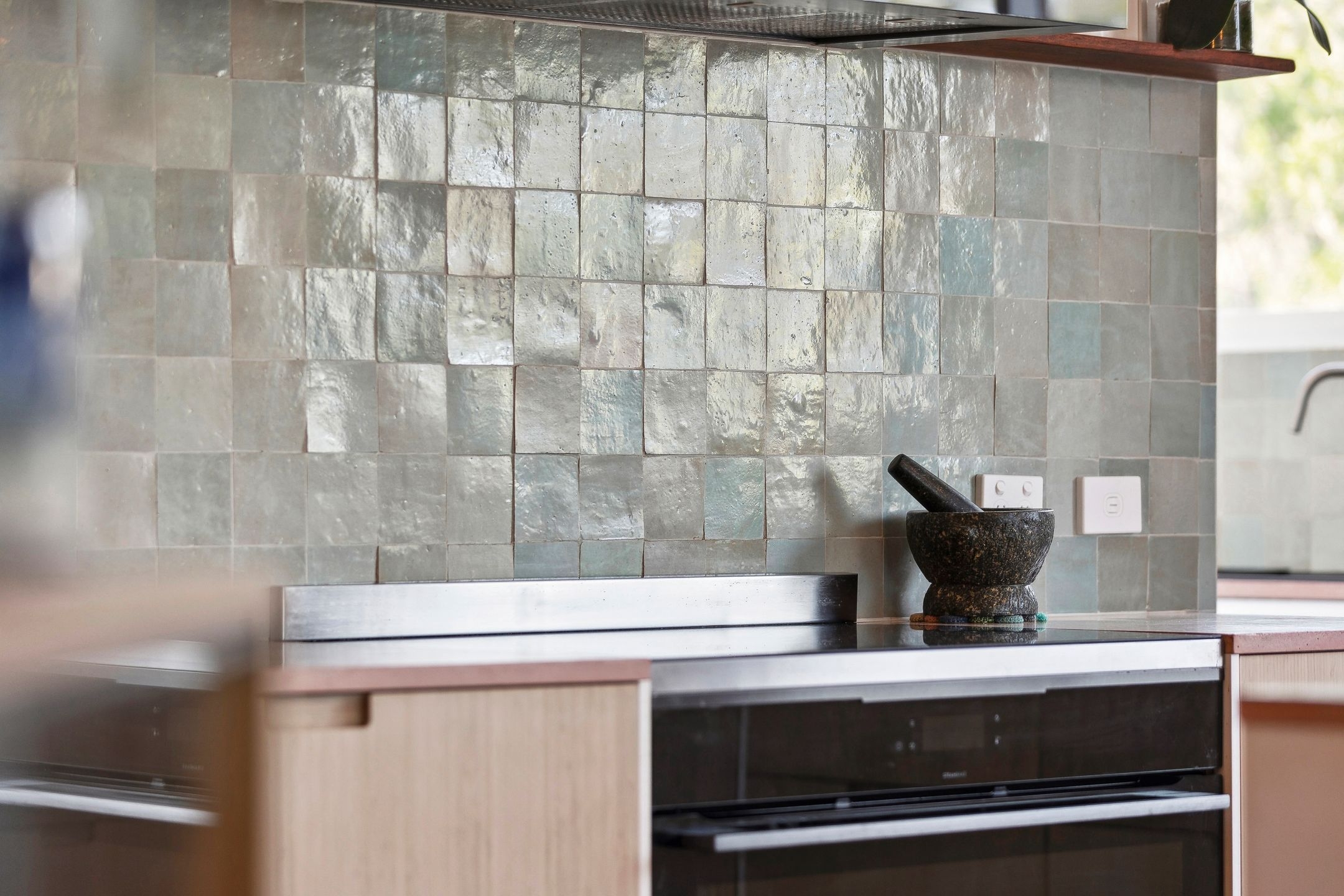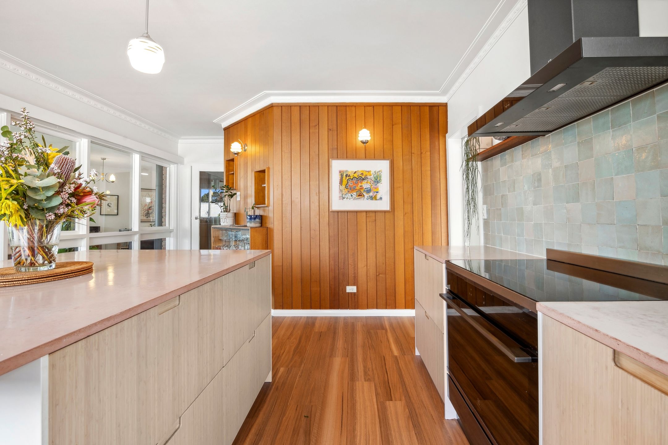 • The chic revamped kitchen, featuring premium appliances, striking custom concrete benchtops, abundant storage, handmade Moroccan tiles & sea views!
