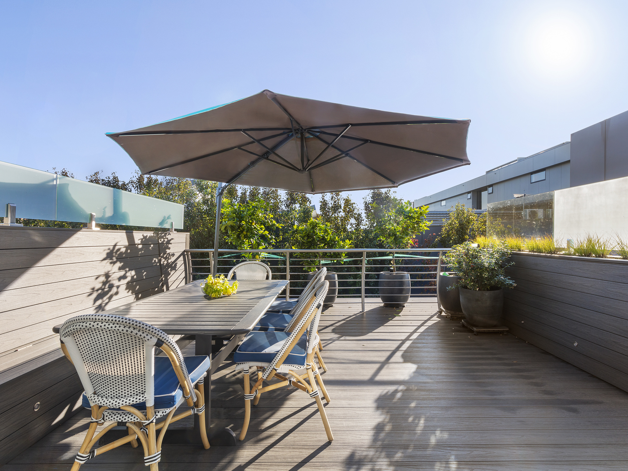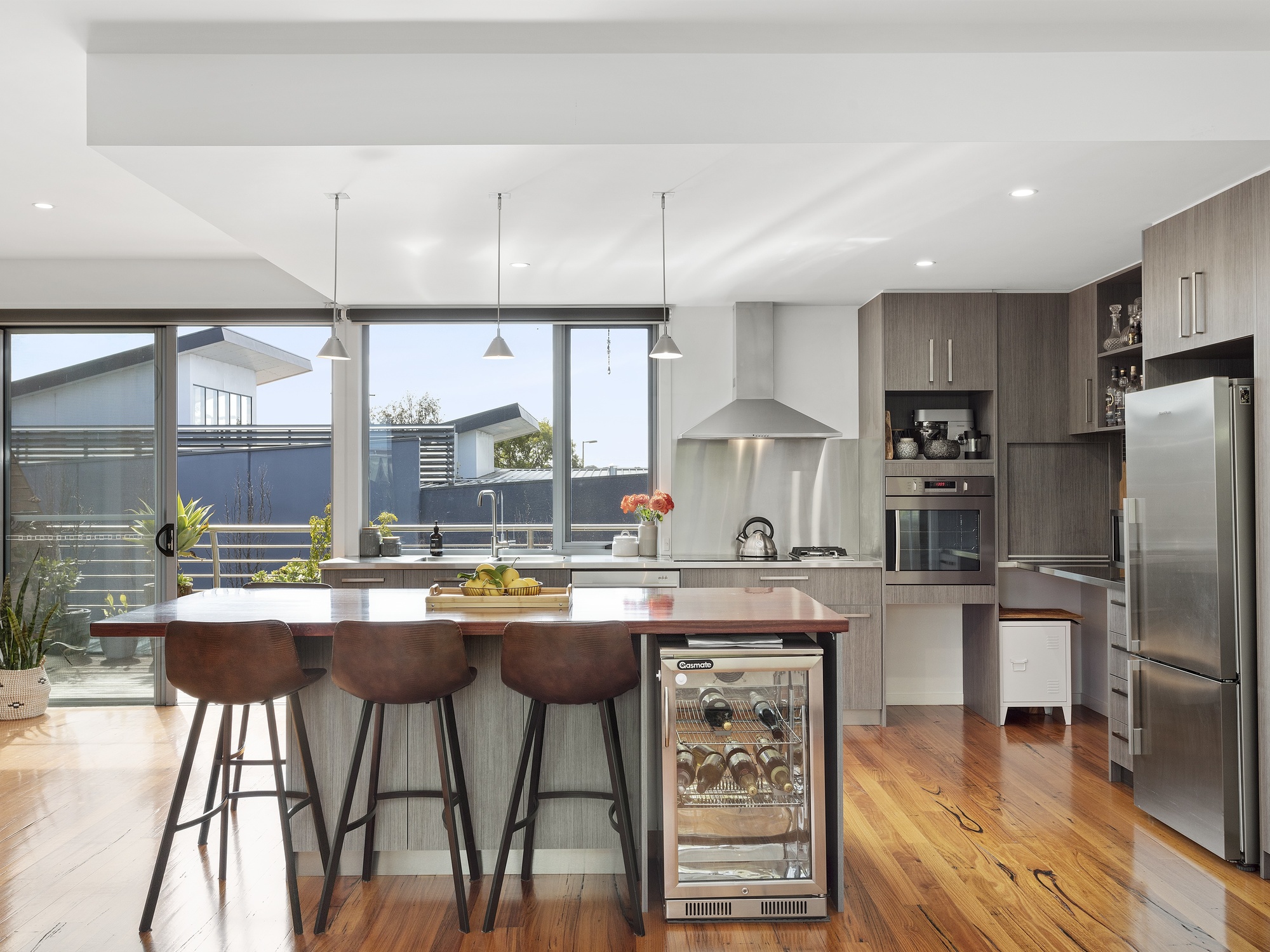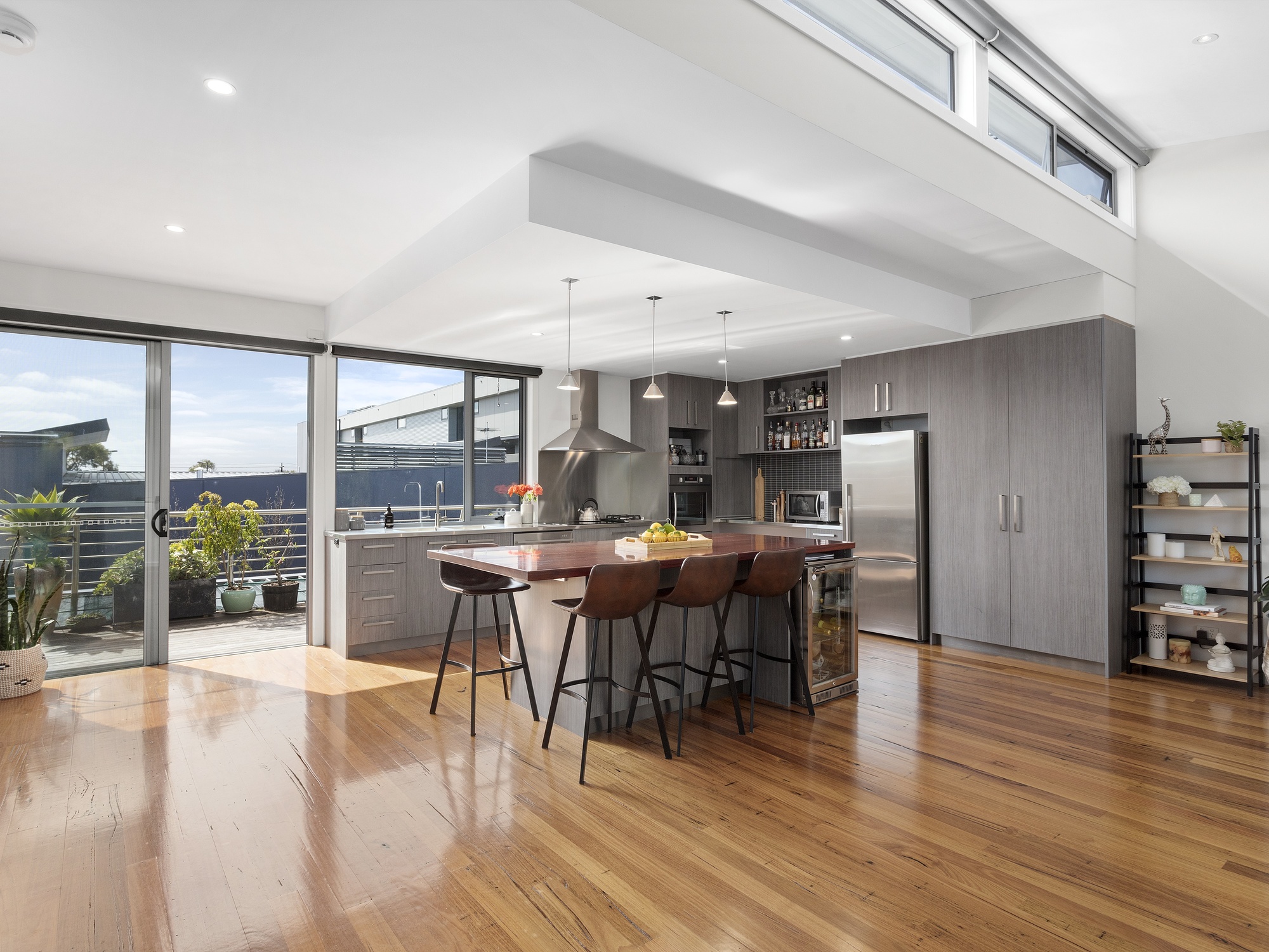 The heart of this townhouse is the light-filled living area on the upper level. The expansive kitchen is a chef's dream, with its induction cooking, stainless bench tops, and top-of-the-line appliances. The kitchen seamlessly flows into the relaxed living zone and opens up to an amazing north-facing deck.