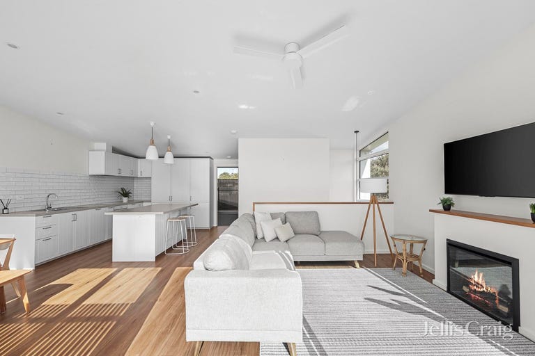 Highlighted by light-letting raked ceilings, and a crisp neutral palette, the welcoming two-storey layout offers an upper-level open plan living and dining domain, warmed by the fireplace and luminous northern sunshine.